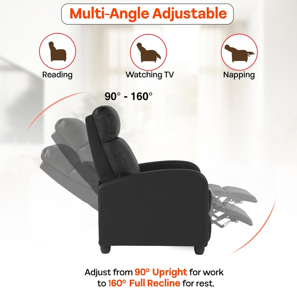 👍【THE MASSAGE MODE】Recliner Chair give you 8 mode for the massage function. This recliner chair also provided 3 intensity for your best relax. This lumbar support recliner has 2 point massage technology at waist area. Recliner Chair Massage Chair Recliner for Living Room Recliner for Bedroom Single Sofa 👍【Comfort and Luxury design】This upholstered recliner chair provides a comfortable seating experience, and has a modern and sophisticated design. This recliner chair for living room has an ergonomic design that features a pillow headrest, soft armrests, and a liftable footrest. Massage Recliner Recliner for living room chair for bedroom recliner sofa 👍【Push Back Adjustable Recliner and Ultimate Relaxation】This recliner chair uses a push-back adjustment method, and you can sit and push back in your way. Multiple relaxation modes in this reclining chair can support your body fully, it features 90 to 160 degree adjustment upholstered recliner chair backrest and lifting footrest to provide an ultimate relaxation mood and sensuality. Recliner sofa Single recliner chair Home theatre chair club chair 👍【Easy Cleaning and Durable Material】This recliner chair is Made of Premium-Quality PU Leather. It is water and stain-resistant and has an elegant and luxurious appearance. Just a swipe with a damp cloth and mild cleanser, if spilling drink on this recliner chair for living room. Besides, it features that high-density filling sponge, a high-quality rebound spring package, high quality environmental protection cotton, and this recliner chair legs and frame are made of engineered from solid hardwood to ensure durability and stability. So, our reclining chair bearing capacity of 275 lbs. reclining chair recliner single sofa club chair 👍【Quick installation】This recliner chair only takes 2 minutes to assemble. This reclining chair is easy assemble and no tools needed for assemble. Just slip the reclining chair back onto the base and screw four reclining chair legs, then your single recliner sofa is completed for setting at living room, bedroom, or other place. club chair recliner chair single sofa recliner chair for living room