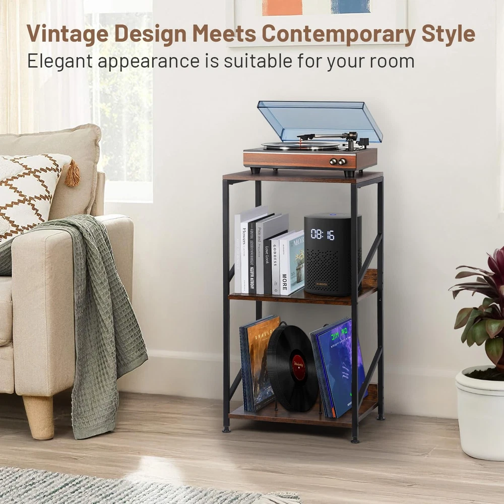 This record player table has sturdy and durable solid wood, anti-corrosion and rust-resistant metal frame .The vinyl record stand is not only suitable for placing your record player, but can also be used to display other audio equipment or decorations. 【3 Tier Record Player Stand】This both practical and beautiful record shelf has 3 tiers, the top tier has a spacious tabletop for multiple sizes of record players, the 2nd and 3rd with removable u-brackets can be organized and placed in an orderly fashion according to genre, artist or year of release. Vinyl record player stand large capacity for storage up to 200 albums of different sizes 【MULTIFUNCTIONALITY】The vinyl record stand is not only suitable for placing your record player, but can also be used to display other audio equipment or decorations. Turntable stand for bedroom, study, music room or other places where you need reading materials. Vinyl record storage can be used as a stylish small space side table, shelf or bedside table with suitable height for you to enjoy your afternoon tea and so on. Album holders for vinyl records offer you to provide a variety of choices 【Sturdy and Durable】This record player table has sturdy and durable solid wood, anti-corrosion and rust-resistant metal frame for long life. The premium materials provide you with reliable and long-lasting products to enhance your shopping experience. Record player accessories adjustable feet can adjust the height as needed, uneven ground can also be well adapted to maintain balance and protect the ground from being scratched 【Detailed Design】Table for record player the 2nd and 3rd have wooden boards and iron shelf dividers on the side, no need to worry about falling items. Removable u-shelf gives you a variety of options, even if you don't put records, you can also use it as a shelf for headphones, keys, wallet, remote control, books and magazines, to meet the demand for multifunctional use. Height-optimized, the table for record player provides an ergonomic listening experience, allowing you to enjoy your music comfortably 【Easy to Install】The record holder comes with concise instructions to make assembly quick and hassle-free, so you can start enjoying your records without waiting