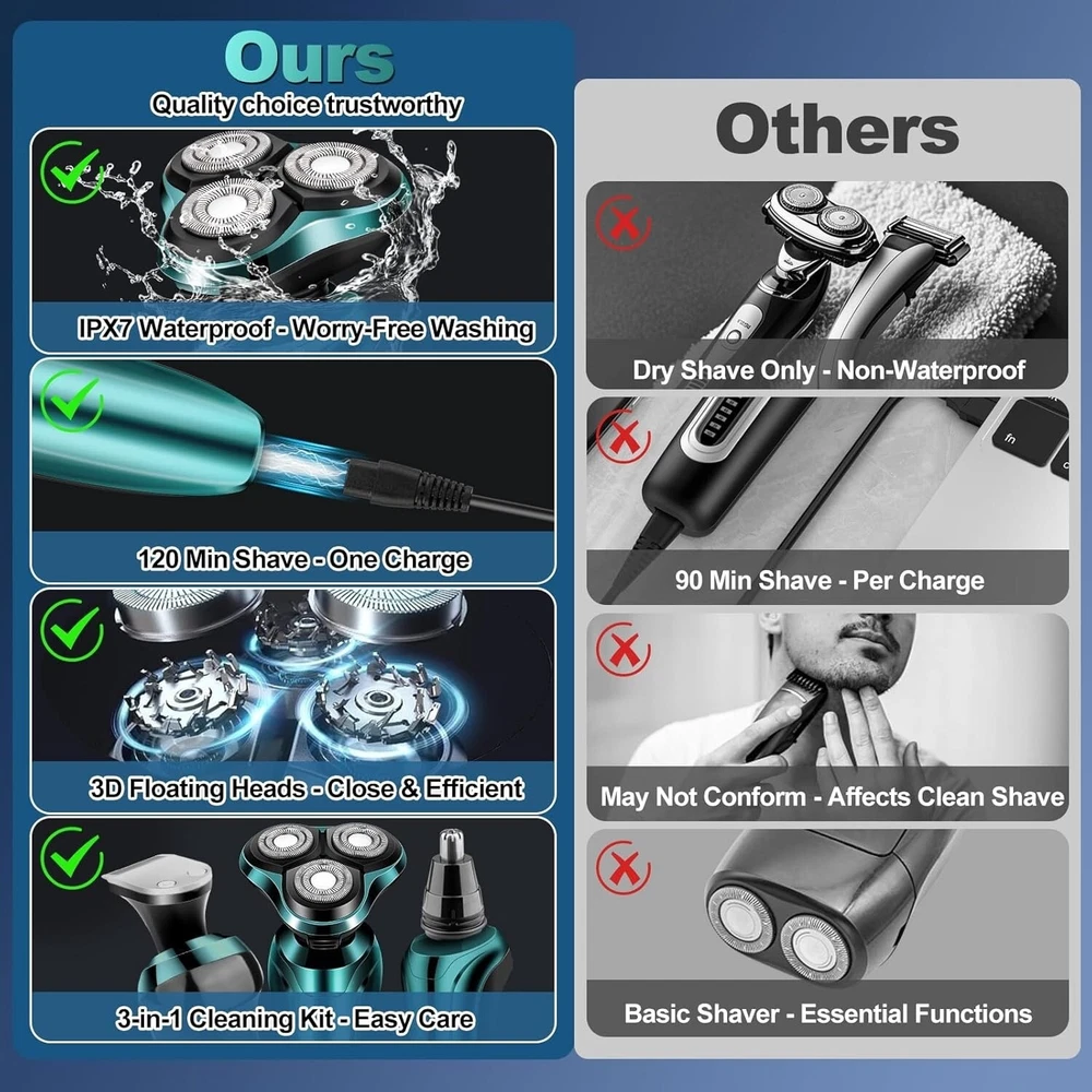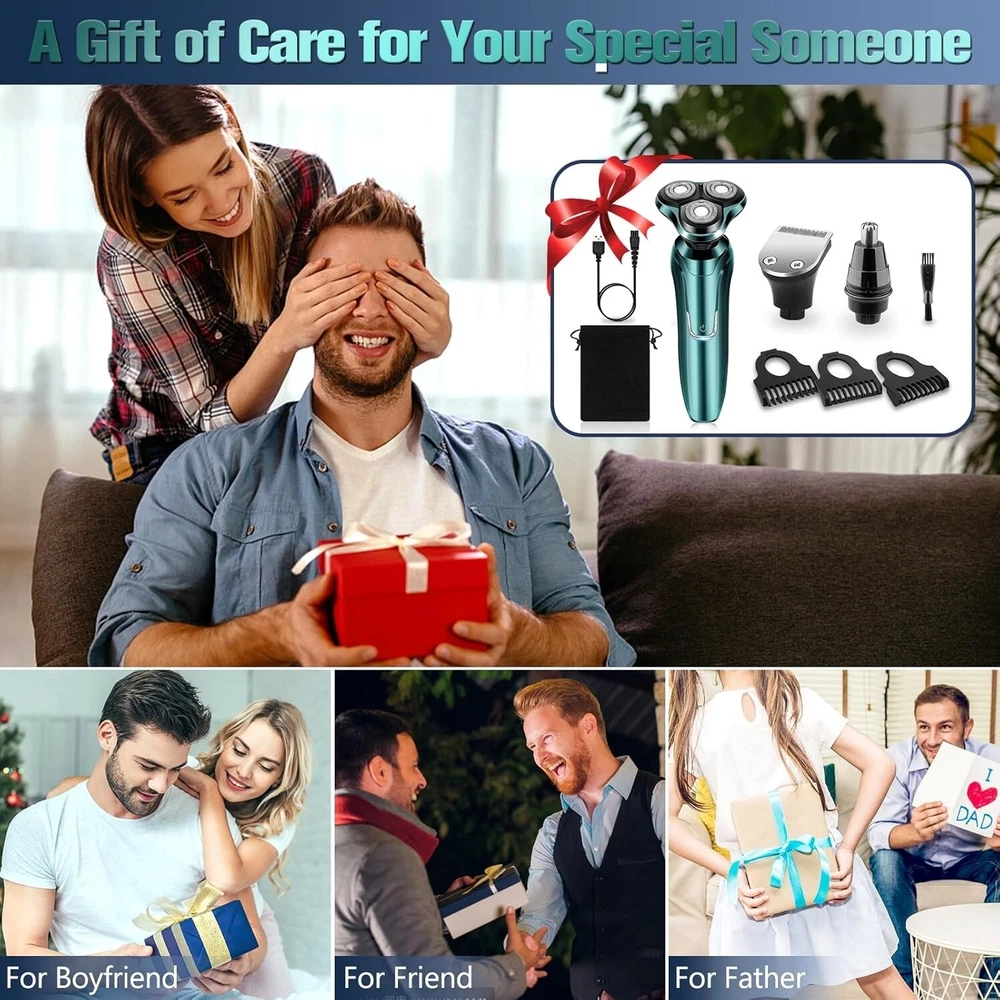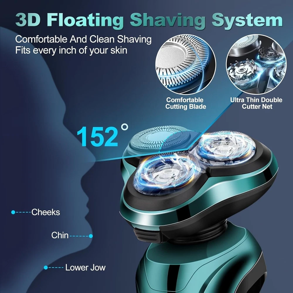About this item 【3D Floating electric razors Heads】Electric shavers for men with precision blade technology, high speed motor, high efficiency floating shaving head fits the contours of your face, neck and even chin for a comfortable and flattering shave.3 double ring floating mens electric shaver head made of aircraft grade stainless steel material, combined with high speed motor, dual track ultra-thin spherical blade mesh and self-sharpening head for a cleaner shave. 【IPX7 WATERPROOF, DRY & WET SHAVING】The electric razor for men has IPX7 waterproof, can be used for dry shaving and wet shaving, choose as you like, easy to clean. When you are in a hurry, you can just use the dry shaving function to speed up your efficiency. When you're in the shower, use the shaving foam or gel for wet shaving to give you a comfortable and smooth shaving experience. In addition, both the head and the body support direct rinsing with water, which is more convenient and cleaner (please wash men's electric razor after turning off the power) 【Multi-functional All-in-One Grooming Kit】This kit is not merely an electric shaver for men's faces or a electric shavers for men face. It is also equipped with a nose hair trimmer and sideburn trimmer. Moreover, it comes with 3 different-sized guide combs (3mm, 5mm, 7mm), which can be replaced simply by pulling off the cutter head. Electric razors for men face meets all your multi-functional sideburn and facial grooming needs. These 3 guide combs in different sizes can satisfy your diverse requirements for hair detailing, men razors for shaving electric truly achieving a full range of fine care from head to face. 【120mins Long lasting】120 minutes of charging time will give you up to 120 minutes of strong power. Whether you are a businessman who travels frequently or a busy person, electric razor for men can meet your needs for long time use. With one charge, electric razors for men can accompany you through many shaving times without the need for frequent recharging, so that your life is always efficient and relaxed. 【USB Convenient Charging】This mens electric razors for shaving face brings you the ultimate in convenience and clarity, with a USB charging port that makes it easy to find a place to charge at home, in the office, or on the go. When you start charging, the 'CHARGE' display will show up to tell you that razors is replenishing its energy; when shaver is fully charged, the 'FULL' display will light up, making it easy and convenient to know the charging status at a glance! 【Upgrade fashionable ergonomics】Men's electric razors for shaving face excels in function and is even more innovative and fashionable in appearance design. The overall simplicity of the body shows your taste and personality. The shaver men ergonomic handle is designed to fit the curve of your hand, allowing you to feel unprecedented comfort and ease when holding razors electric. Includes: 1 x electric shaver; 1 x replacement head for barber; 1 x replacement head for nose hair trimmer; 3 x size guide combs; 1 x USB charger; 1 x cleaning brush; 1 x dust bag 【A SMOOTH AND CLOSE SHAVE 】: With 4-direction floating heads, the 3D rotary shaver automatically adapts to the contours of the face, neck and even the jaw, and provides a comfortable and close shave anytime.