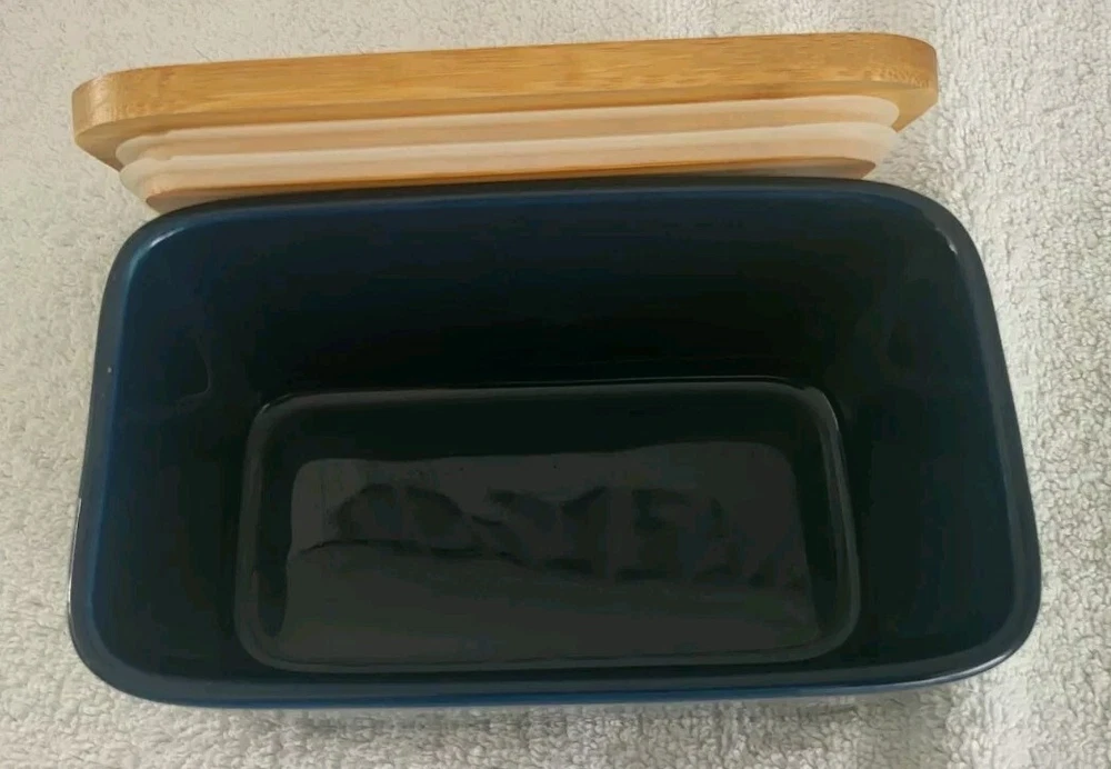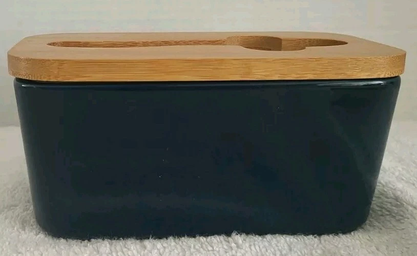 This beautiful ceramic dish is perfect for storing your favorite butter or other spreaders. The rectangular shape and bamboo lid add a touch of elegance to any kitchen. Measuring 3 inches in height, 6 inches in length, and 3.5 inches in width, this dish is the perfect size for any table setting. The blue color adds a pop of color to your kitchen and the set includes one lid. This dish is a must-have for any kitchen storage and organization enthusiast.