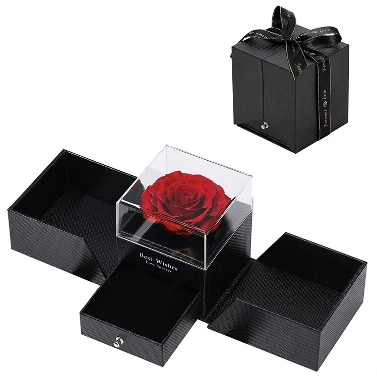 The Red Acrylic Soap Rose Gift Box is a romantic and thoughtful gift for a loved one. This preserved flower arrangement comes in a black 11x10x11cm acrylic box, making it a lasting and beautiful addition to any home decor. The set includes a gift bag and a best wishes card, adding a personal touch to the gift-giving experience. Perfect for all occasions, this artificial rose arrangement is a unique way to express love and appreciation to someone special. Designed with both beauty and practicality in mind, the acrylic box features flaps that open and close, allowing for easy access while keeping the preserved roses protected. This Product Does Not Included The Jewelry.