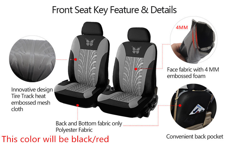 Product Description Universal 2Pcs Car Front Seat Cover Butterfly-Pattern Embroidery Car Seat Cover Red Interior Accessories Front 2Seat Brand Embroidery Car Seat Covers Set Universal Fit Most Cars Covers with Tire Track Detail Styling Car Seat Protector Color:Red Package Included: 4 pcs Car Seat Cover(For 2 Front Seats) Add a stylish touch to your car interior with these semi custom fit seat covers, fits most Detachable Headrest Bucket seats . Seat covers can extend the life of your vehicle and keep your seats looking brand new and clean. These seat covers fit most of the standard vehicles including sedan, SUV, truck, van and minivan. Made of high-quality and durable materials, Features innovative fabric and design,Updates the appearance of old or dirty seats,Protects against splits, stains, fading, dirt, and pet hairs,these covers protect your car seats from dirt, wear and tear. Easy to install , No professional installation required. You do not need to remove your original seat cover; it slips right over your seat. Semi-customized to fit most vehicles. Will not interfere with heated seats. Upgrade Your Car with Fashion Colors and Luxurious Interior Accessories. All the photos shown are not photoshopped in any way; they are taken from actual vehicle after our seat covers are installed. Often times, you will be amazed how little things could make huge difference. If you would like the same result and the look in your car, all you need to do is spare a little extra time and patience for the installation. The time you spent will be totally worth it. Payment Returns Contact Us Shipping We accept payment by PayPal only ! Payment should be completed within 5 days after buyer places the order,or else an unpaid case will be opened in order to cancel the transaction. If you can not pay in time, please contact us. e-check from PayPal will only be processed once the payment clears. All of the items will be shipped to buyer's EBAY address,please confirm your address on Ebay before you buy.Your order will be usually shipped out the same or next business days once the payment is made and cleared. 30-day Warranty with Exchange for defective, malfunctioned, incorrect or parts-missing items. Please notify us and return the item with all parts and accessories packed and marked "FOR EXCHANGE" within 14 days of receipt. If defective, malfunctioned or parts-missing items are no longer available, a refund may be issued. All returning postage costs will be the responsibility of the buyers under all circumstances. If you encounter any problems about anything, please feel free to contact us and we will do our best to assist you solve the issue. If you are not satisfied in anyway, please feel free to let us know and give us a second chance to correct it before you decide to leave any neutral or negative feedback. Please contact us through eBay link if you have any questions. We will reply you within 24- 48 hours. Please check you spam mail if no response for 48 hours. All items will be checked before packing. All items are new and of high quality. Item will be shipped within 1 business days upon receipt of payment, excluding weekends and public holidays. If to USA,we will ship your order by USPS,it will take about 8-12 working days to you,and you can track it on line. If to other country,we will ship your order by China Post or Singapore Registered Air Mail,it will take about 14-21 working days to you,you aslo can track it on line. Delivery time is about 14-28 business days and it may take up to 8 weeks . Payment We accept payment by PayPal only ! Payment should be completed within 7 days after buyer places the order,or else an unpaid case will be opened in order to cancel the transaction. If you can not pay in time, please contact us. eCHECK from PayPal will only be processed once the payment clears. All of the items will be shipped to buyer's EBAY address,please confirm your address on Ebay before you buy.Your order will be usually shipped out the same or next business days once the payment is made and cleared. Returns 30-day Warranty with Exchange for defective, malfunctioned, incorrect or parts-missing items. Please notify us and return the item with all parts and accessories packed and marked "FOR EXCHANGE" within 14 days of receipt. If defective, malfunctioned or parts-missing items are no longer available, a refund may be issued. All returning postage costs will be the responsibility of the buyers under all circumstances. Contact Us If you encounter any problems about anything, please feel free to contact us and we will do our best to assist you solve the issue. If you are not satisfied in anyway, please feel free to let us know and give us a second chance to correct it before you decide to leave any neutral or negative feedback. Please contact us through eBay link if you have any questions. We will reply you within 24- 48 hours. Please check you spam mail if no response for 48 hours. Shipping All items will be checked before packing. All items are new and of high quality. Item will be shipped within 1 business days upon receipt of payment, excluding weekends and public holidays. If to USA,we will ship your order by USPS,it will take about 7-10 working days to you,and you can track it on line. If to other country,we will ship your order by China Post or Singapore Registered Air Mail,it will take about 14-21 working days to you,you aslo can track it on line. Delivery time is about 14-28 business days and it may take up to 8 weeks . Welcome to our Store ~