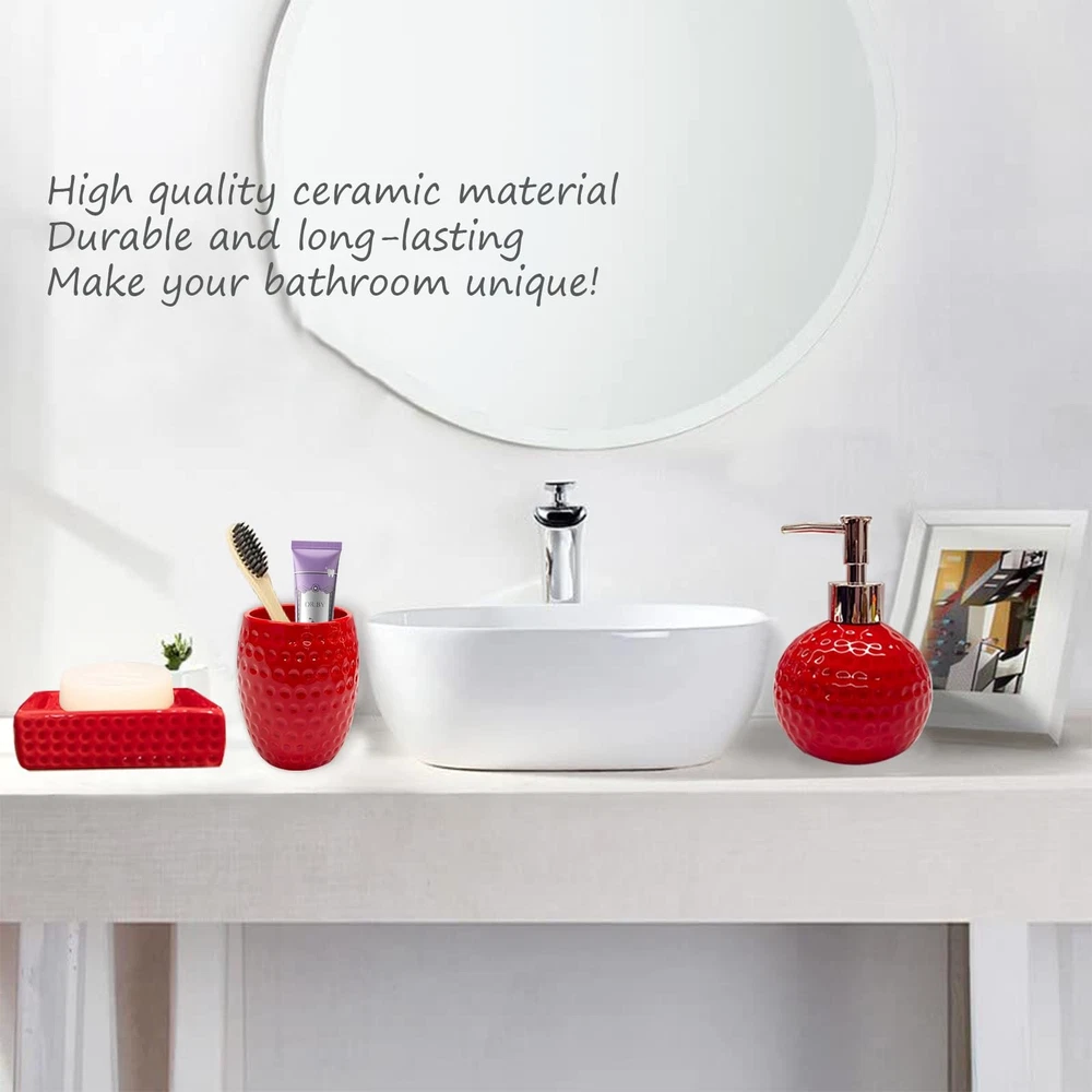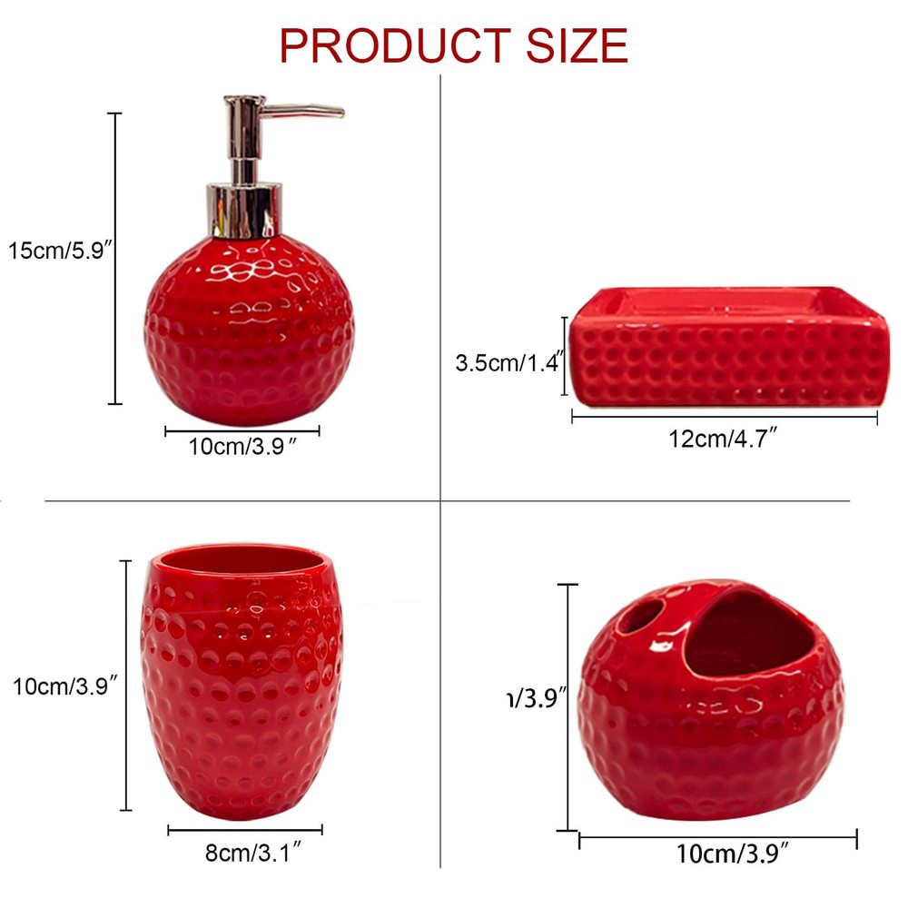 This 4-piece ceramic bathroom accessory set features a fashionable yellow finish, adding charm and fashion to your bathroom. It is not only a household item, but also the perfect gift for friends and family Product size: 1 soap dispenser (10X10X15cm/3.9X3.9X5.9in) 1 toothbrush holder (10X10cm/3.9X3.9in) Attention in offices and other occasions: 1. Due to differences in monitors, there may be slight color differences between the image and the actual product. Please understand. If you have any questions, please feel free to via at any time, and we will definitely take your issues seriously 【Red Bathroom Sets Accessories of 4 pieces】Includes 1 soap dispenser, 1 toothbrush holder, 1 bathroom cup and 1 soap dish to help you keep your bathroom sink neat and tidy and your bathroom organized. 【Ceramic Bathroom Decor Sets】This red ceramic bathroom accessories set is made of high quality ceramic through handcrafted and smooth glaze, adding fresh style to the counter or vanity and making your bathroom look more fashion. 【High quality Structure】Red soap dispenser has a high quality structure and unique and stylish design with a pressurized hand pump that won't break or leak, easy to clean and can last. 【Exquisite Bathroom Counter Set】The multifunctional bathroom sink set can not only bathroom supplies, but also makeup brushes and other utensils, making your bathroom desktop neater and also suitable for housewarming gifts.