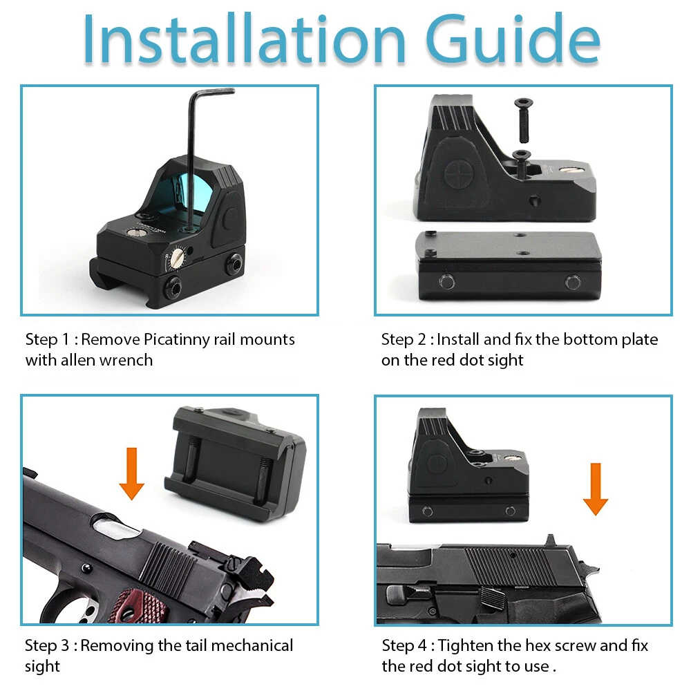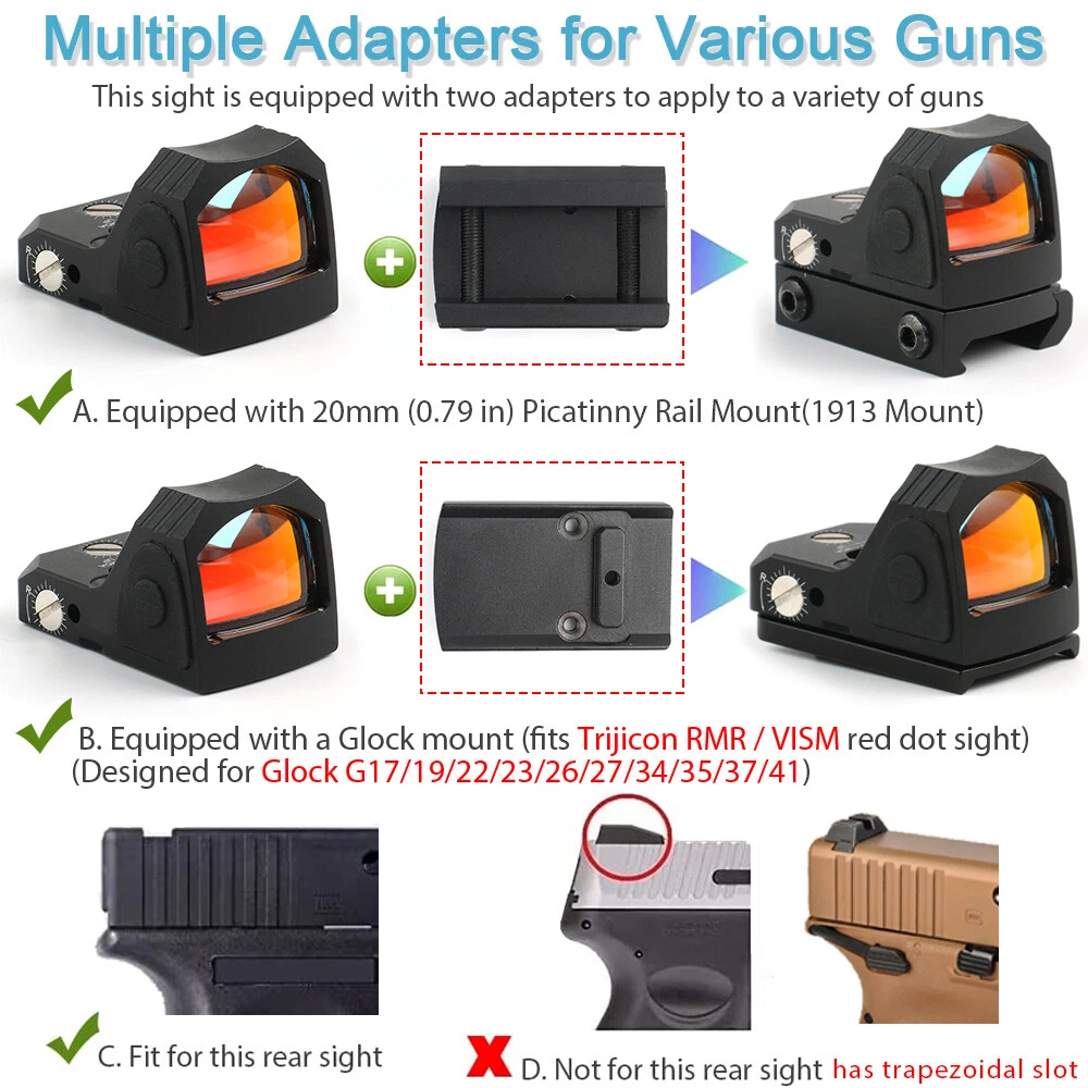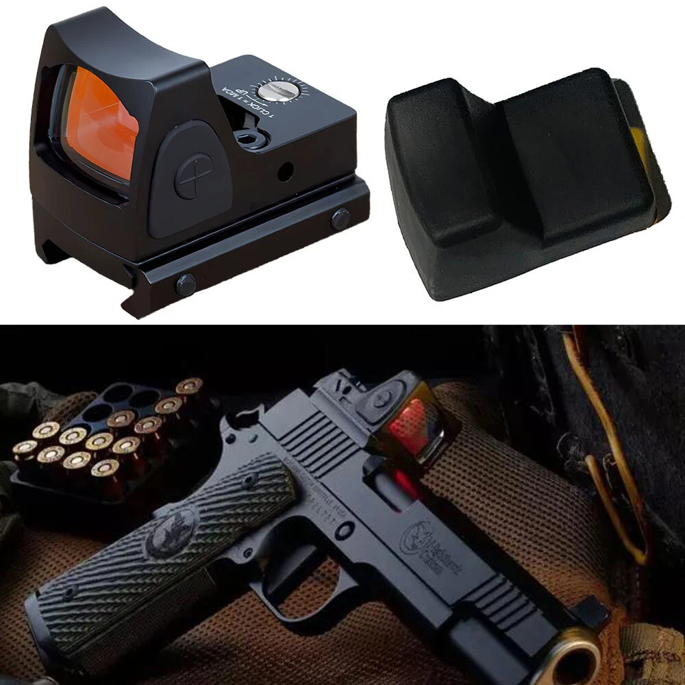Meinuousa Your Best Online Business Partne Mini Red Dot Tactical RMR Reflex Sight Scope for Pistol Glock 17 19 W/20mm Mount ***Warmly Note*** The Red dot scope is only suitable on GLOCK MOS and slides that have been machined to accept RMR micro dot sights If it is any other model, it needs to be paired with a universal base. About this item 【FULL FIELD OF VIEW】 The 20mm reflector adopts a tubeless design with a wide field of view and can quickly capture the target. Very suitable for shooting from short-range targets to medium-range targets on hunting trips.The sight of the scope is a red dot and has an adjustable function. The bullet will always hit you the location of the red dot. 【MULTI-LEVEL BRIGHTNESS】:Enjoy 5 levels of brightness settings that help you achieve pinpoint accuracy even in the brightest or lowest levels of lighting,features adjustable elevation and windage dials,So it has Elevation、Windage adjustment functions to easily adapt to any environment. 【Very sturdy and secure rail mounting system】: Waterproof and shockproof, aluminum sturdy construction and mounts promise red dot sight will stand up to extreme conditions.Will not come loose, made to last. 【Easy to Install and Adjust】: fully adjust the dot, windage & elevation quickly and change the included battery within seconds.Mini RMR Red Dot Sight Collimator Sight Scope fit 20mm Weaver / Hunting Rifle Sight, intended for use on weapons Mount equipped with Picatinny rails. 【Simple 2-button operation and Auto Off】 (+) and (-) buttons are used to power the device up/down and increase/decrease the aiming point brightness level.The RDS is equipped with intelligent power management to prolong battery life when not in use. After a period of three hours of inactivity. Description Material: Metal Magnification: 1x Flight distance: 100M brightness :5 levels 1 Click = 1 MOA Sunrise color: Red Night marking color: Red Clamp: 20mm Applicable model: Glock 17 19 Net weight: 66g Gross weight: 201g Product size: 45 * 33 * 39mm Storage box size: 130 * 95 * 65mm Features: Light and compact, ideal for pistols No tube design for conventional fast shooting of moving targets. Adjustable wind resistance and height (including tools) Integrated installation of standard 20mm guide rail. Packing list: 1*Mini internal red dot sight 3*Small wrench 1*Tools 4*Screw 1*CR2032 battery 1*Rag 1*Manual 1*Storage box Payment Shipping Returns Contact Us About US - We accept the payment through :Credit, debit, and gift cards, Apple Pay, Google Pay, PayPal, and PayPal Credit. - Payment must be fulfilled within 4 days after the end of auction. - Please make sure your ebay address is correct. Or not, please correct it before payment. - If you are a big customer, Please contact with us about the item's PRICE and SHIPPING. - Your feedback & suggestion is deeply appreciated, thanks. On Dec 23, 2024 at 22:09:05 PST, seller added the following information: