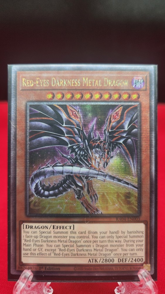 Unleash the power of the Red Eyes Darkness Metal Dragon in your next duel with this rare and coveted Quarter Century Secret Rare card from the Yu-Gi-Oh! TCG. With an attack power of 2800 and a defense toughness of 2400, this Effect-type dragon is a formidable addition to any deck. This 1st Edition card, featuring the iconic Dark attribute, is beautifully designed with a holographic finish that captures the eye. Manufactured by Konami in 2025, this card is in English language and meets the age level requirement of 6+. Add this rare card, numbered Ra04-EN003, to your collection and elevate your game today.