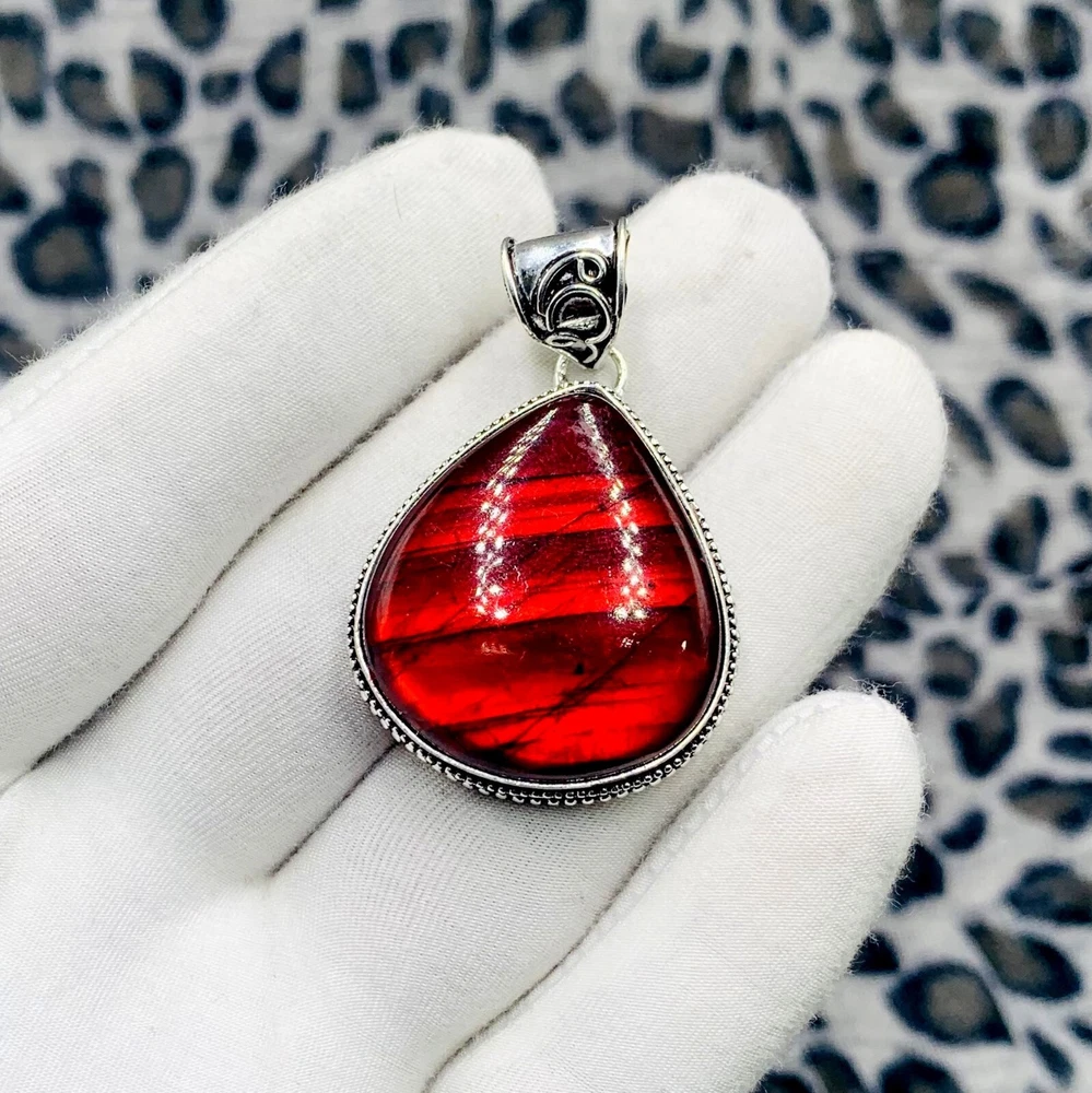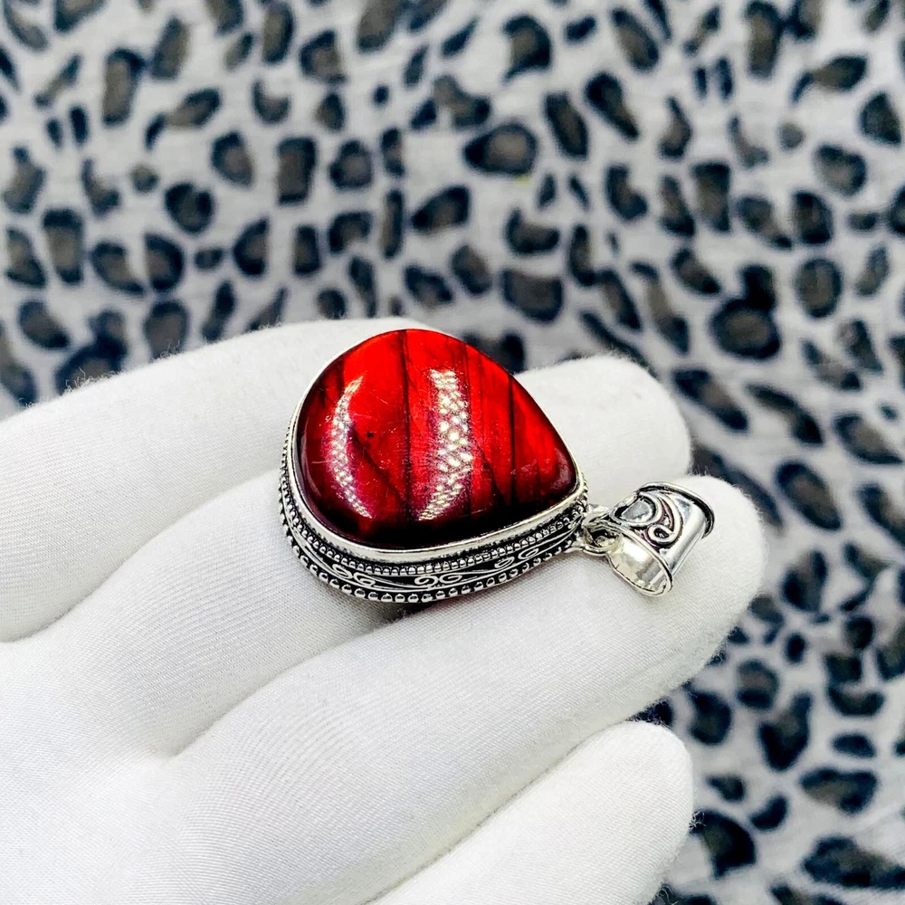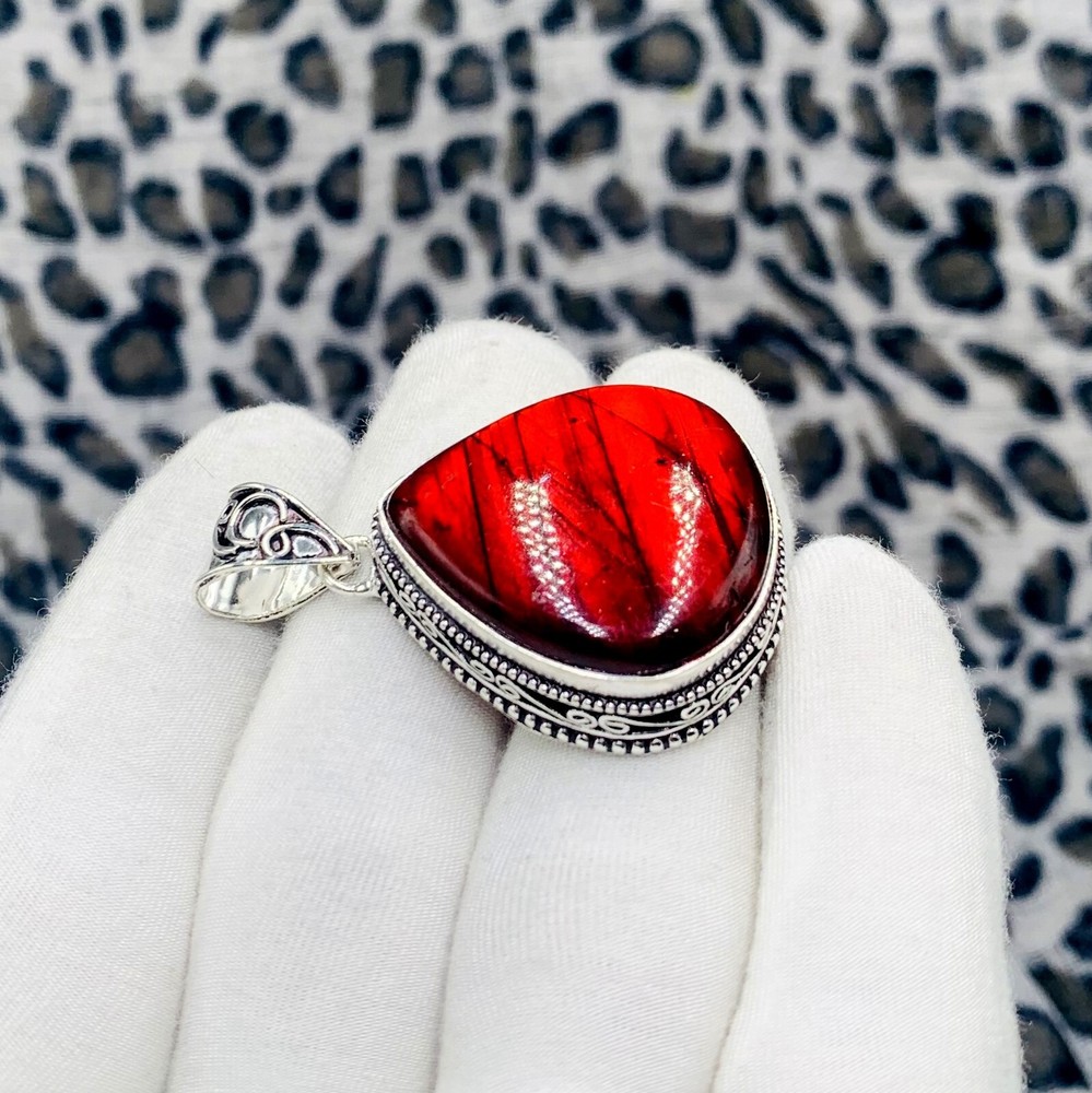 Item description from the seller Product Overview: Add a bold touch of color and mystique to your jewelry collection with this handmade teardrop pendant featuring a rare red-flash labradorite gemstone . Framed in detailed 925 sterling silver, this unique piece exudes artisan craftsmanship and natural elegance. Key Features: Gemstone: Natural Labradorite with Red Flash Gem Shape: Teardrop / Pear Flash Color: Vibrant Red Iridescence (Natural) Metal: Solid 925 Sterling Silver (Stamped) Pendant Size: Approx. 1.5–2 inches Design: Handcrafted with ornate silver bezel work Style: Bohemian / Vintage / Statement Finish: Polished for a brilliant shine Perfect For: Everyday wear, healing purposes, spiritual jewelry, or thoughtful gifts PAYMENT METHODS We accept Paypal ONLY. It is easy and safe for you to pay by credit cards, debit cards, bank transfers and PayPal account balances. Payment should be made within 7 days since the winning of the first item. Non-paying winners will be reported to eBay. Serious bidders only please. Please email us with any questions you may have during the transaction. SHIPPING POLICY Each item is individually packed securely with quality products to help ensure safe and undamaged delivery. Packages are shipped via Registered International Air Mail . We ship within 1-3 business days after payment is received. Delivery is generally within 15-20 days worldwide after shipping. In rare cases it makes take up to 3-4 weeks for delivery depending upon the destinations and customs regulations in your country. All packages have a duly filled custom declaration form in order to avoid and delay in. RETURN POLICY Your satisfaction is of the utmost concern to us. Should you need to return an item, you can do so within 30 days of receipt of the item for a full refund. Return shipping charges are not reimbursable. All items must be in their original condition, not worn or altered. Please contact us if you would like to initiate a return, so that we may guide you through the process. We can be reached through the "Ask a Question" link on the listings. FEEDBACK We strive for 100% Customer Satisfaction and we always leave positive feed backs to our buyers. Please help us maintain our business and give a 5-Star rating in all 4 categories. If you still think that you still can?t leave a 5-Star across the Board, please email us or call us and we assure you that your issue will be resolved immediately. We believe in solving the issues. A positive feedback represents our service, product quality and dedication towards customer's satisfaction. Our future business depends on your satisfaction or positive feedback with "5-star rating". Note:- A Buyer is responsible for customs issue in his or her Country. Thank you By: Devine - Gems