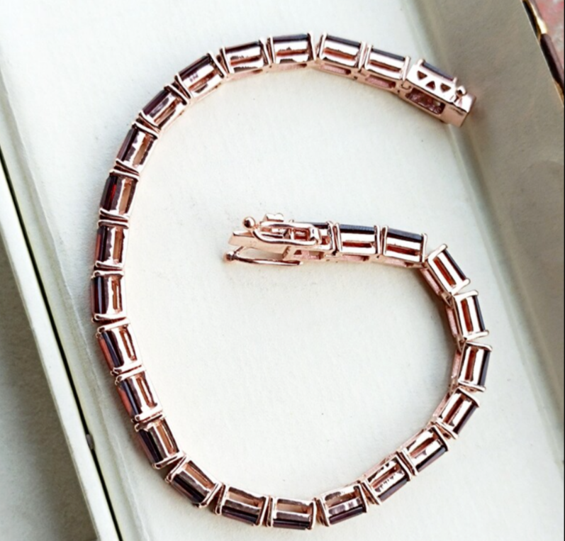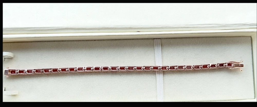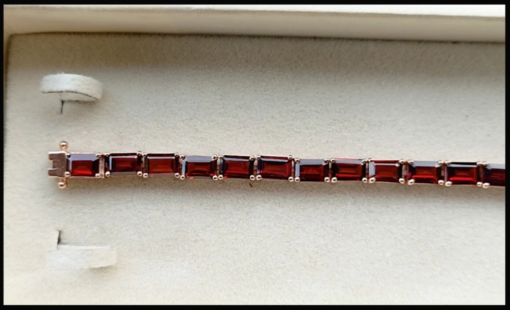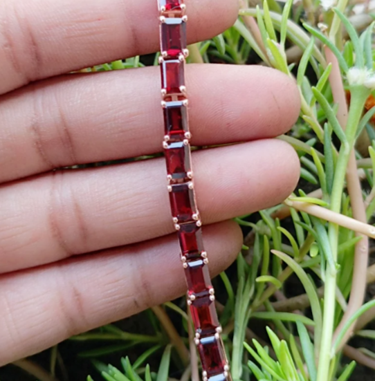 Elevate your jewelry collection with the Red Garnet Octagon Tennis Bracelet, a timeless piece that marries elegance with a touch of sparkle. Crafted with meticulous attention to detail, this 7-inch bracelet features a stunning array of 22 natural red garnets, each meticulously cut to enhance its emerald shape and set in a lustrous yellow gold over sterling silver that lends a warm, classic finish. The bracelet's curb link chain provides a comfortable fit, while the box closure ensures security on your wrist. Whether you're commemorating an anniversary or simply adding a dash of luxury to your everyday look, this nickel-free, handmade bracelet is a versatile accessory that promises to be a cherished addition to any ensemble.