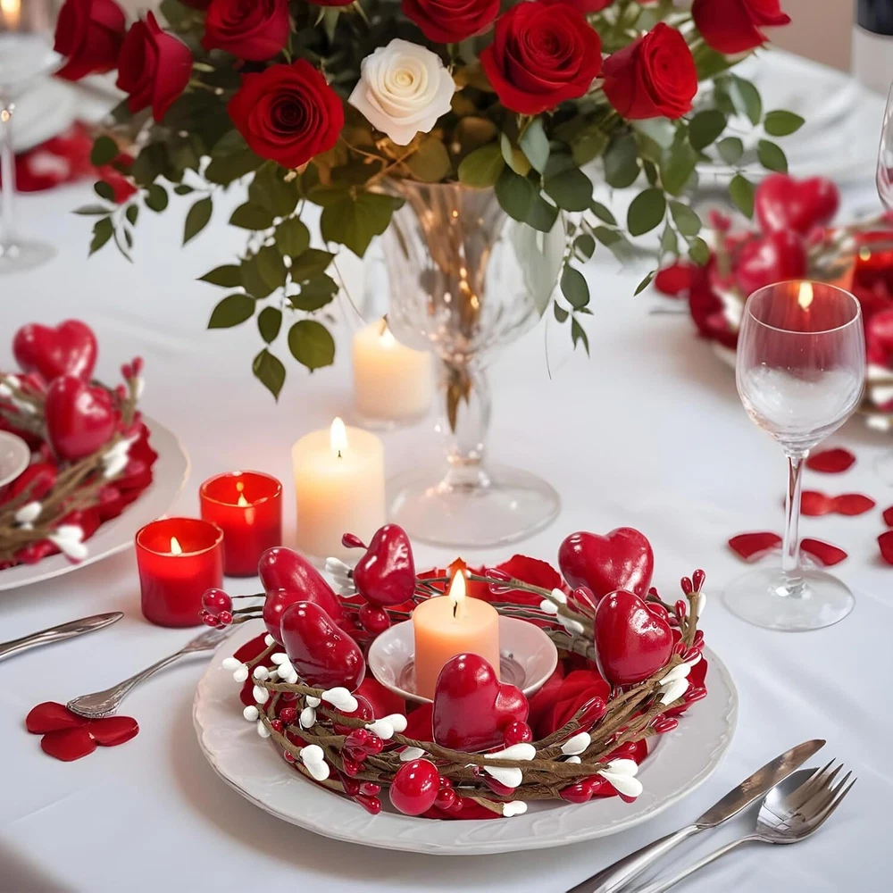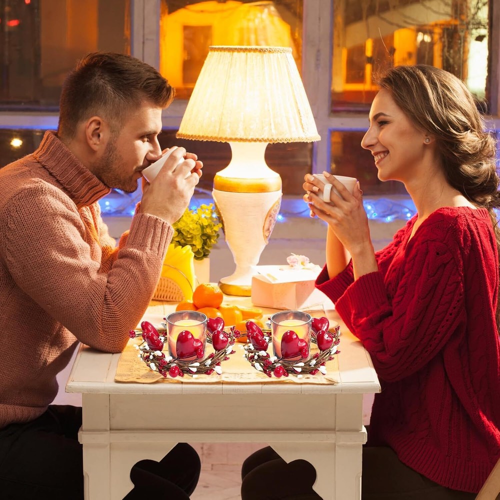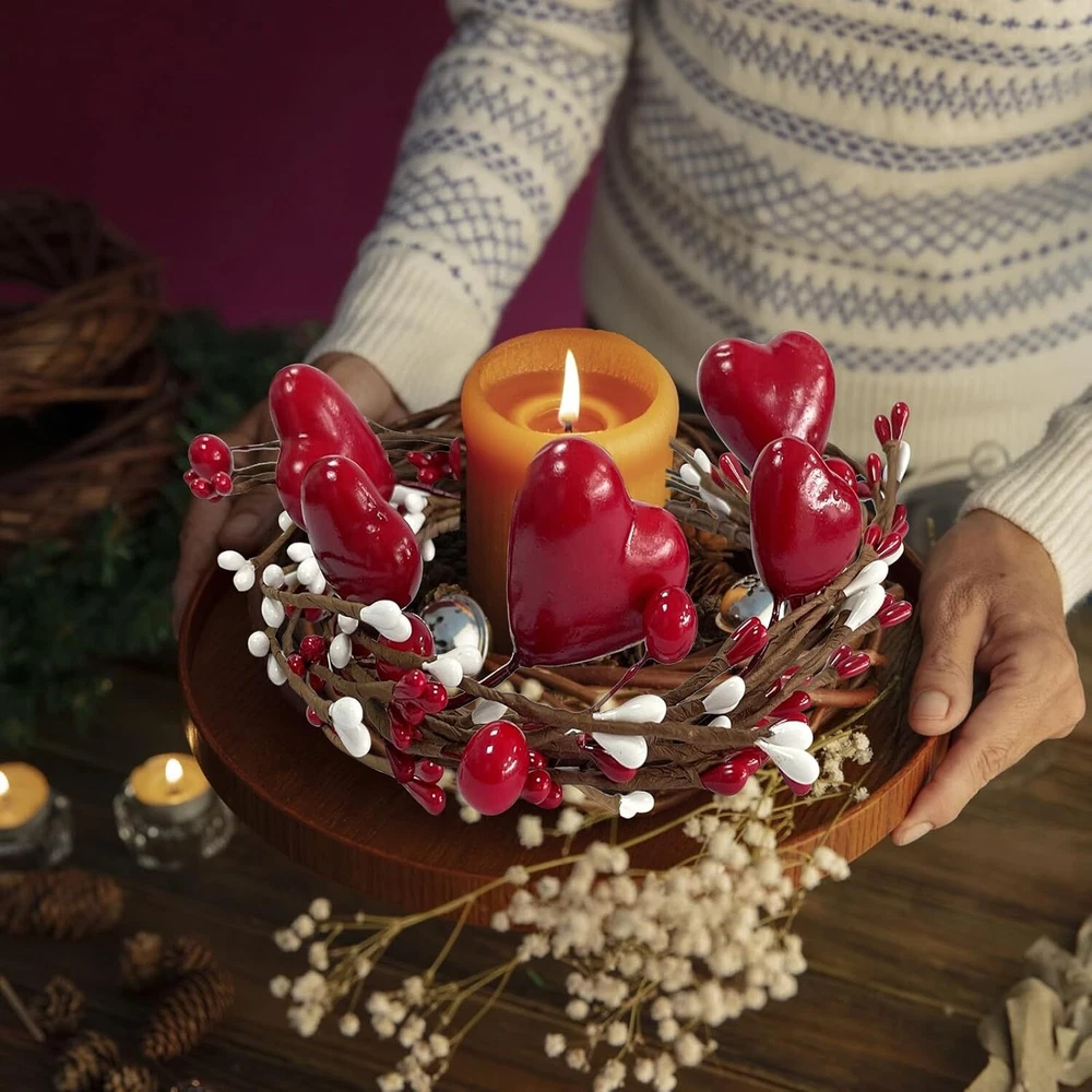 9.5" Woven Thread Heart-Shaped Candle Ring Wreath Core Parameters Material: Foam hearts/berries, woven thread branches, floral tape Size: Inner diameter 3.9" (9.9cm), Overall diameter 9.5" (24.1cm) Color: Bright red hearts with burgundy berries Technical Specifications • Includes 2 adjustable wreaths with bendable wire branches • Heart-shaped design with faux red berries for romantic decor • Suitable for pillar candles (3.9" inner diameter) or hanging • Flexible branches allow custom shaping and fluffing • Multi-purpose: Valentine's Day, weddings, home decoration Package Information Package Dimensions: Not specified Contents: 2 candle ring wreaths