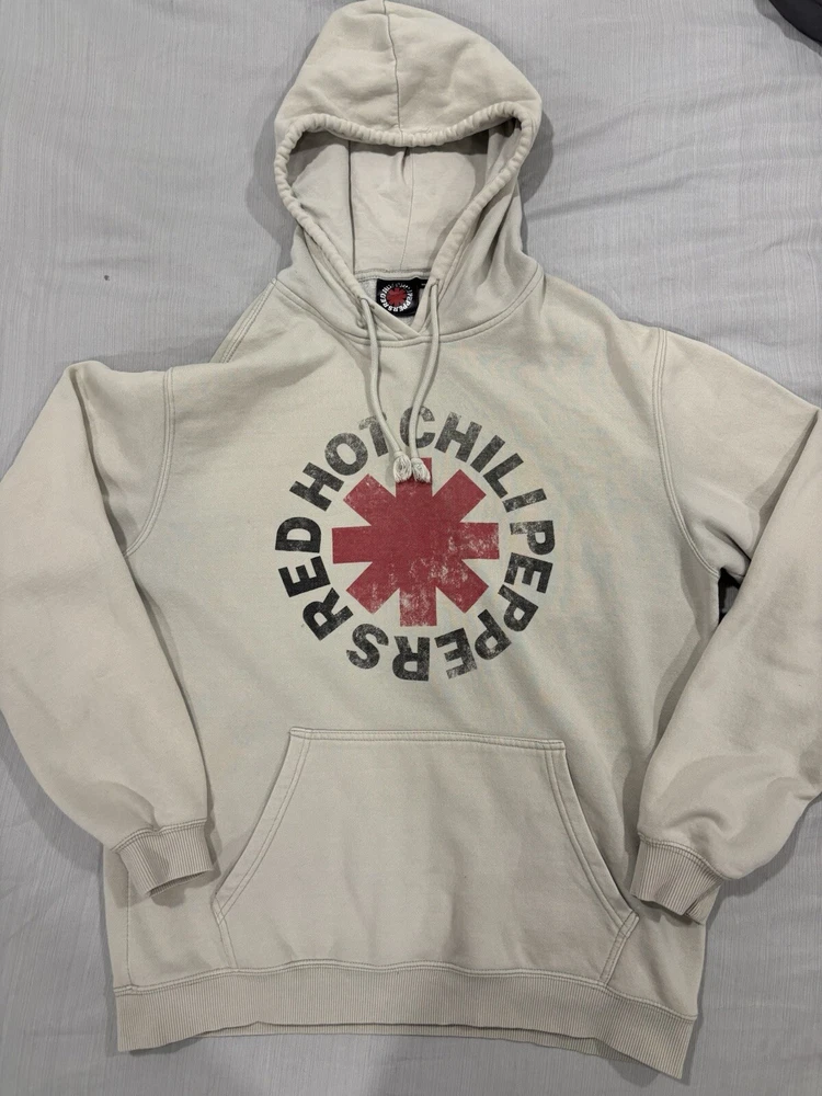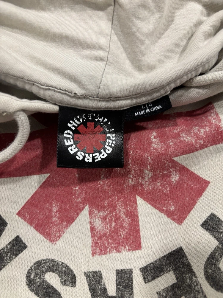 Show your love for the Red Hot Chili Peppers with this Y2K band hoodie sweatshirt. The ivory red color and graphic print of the hoodie make it a stylish addition to your wardrobe. The hoodie features a crew neck and long sleeves, perfect for cooler weather. It is made of a comfortable poly-cotton blend fleece material that is machine washable. The drawstring hood, front kangaroo pocket, and ribbed cuffs and hem add to the overall look of the hoodie. This unisex adult hoodie is available in size L and is perfect for any fan of the Red Hot Chili Peppers.