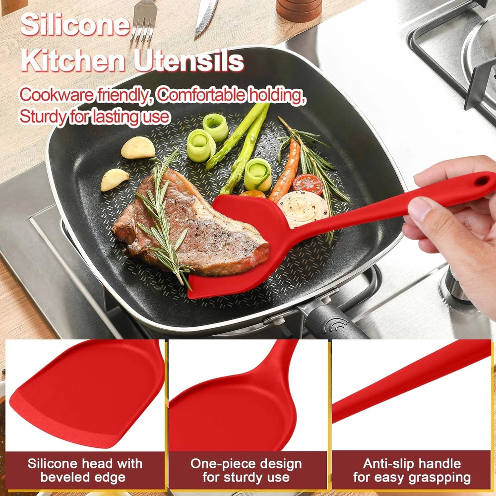 4 Piece Red Kitchen Cooking Utensils Set, which made of premium food silicone, will not have any harmful substance into your food, and can bring you a healthier cooking experience. The 4-Piece cooking utensils will meet your needs, such as cooking/serving/ mixing/ preparing etc., ideal kitchen tools for your everyday cooking. Why choose silicone cooking utensils? Our Advantages - No breaking off, No peculiar smell, No rust Easy clean- Less-stick silicone surface is easy to clean by hands and dishwasher safe -piece Design - Reduce risk of the buildup of food & NOT breaking off Heat Proof - Avoid your hands from being scalded & Easy to serve hot food Smooth Surface - Protect your hands roundly and scratch-free for your cookware 4-Piece Silicone Kitchen Utensil Kit A Full Set Of Red ☑ Solid Turner ☑ Slotted Turner ☑ Solid Spoon ☑ Slotted Spoon Warm Tips: 1.Please wash with soft dishcloth in soapy water before first use. 2.Please do not rub them with a sharp metal. 3.Please do not directly flame fire on the utensil. 4.Please dry them after washing, in dry place for their long service time. 【4 Pieces In A Set】Kitchen utensil set includes solid turner, slotted turner, solid spoon, slotted spoon, Common kitchenware set could meet your different cooking needs, such as cooking, frying, mixing, serving, draining, 4-pieces set can save your time and money of purchasing them separately, Beautiful red color will decor your kitchen 【Premium Material】Cooking utensils are made of food-silicone, No worries any material or coating leeching into your food, No peculiar smell, Smooth silicone is cookware friendly to protect your non-stick cookware, Proper maintenance could extend their service life for long-term use, A better alternative to metal or wooden utensils 【Heat-resistant】Silicone utensils can withstant high temperature up to 446℉ without melting or deforming, No harmful substance releasing and will not react with your food when cooking, Turners can stir and fry egg meat vegetable, Spoons will be convenient to scoop food from hot soup, Silicone long handles are not easy to conduct heat and can protect your hands from being scalded 【Fine Designs】The handle of the utensil conform to ergonomic, Anti-slip and comfortable to hold in hand, -piece design ensure utensils will not fall apart, Sturdy and lasting for daily use, Flexible turner silicone heads with beveled edge help to flip food easily, Large spoons can scoop more food, The big hole on the handle end for easily hanging on the pothook, Also can put them in your holder, Easy to and save space 【Easy Clean】Nonstick silicone surface make it release food easily without food sticking on it, Easy to clean utensil under running water and wipe with sponge or dishcloth by hands, Rust free and non warping, Also dishwasher safe to save your effor and time of doing dishes, Make cleaning be a breeze