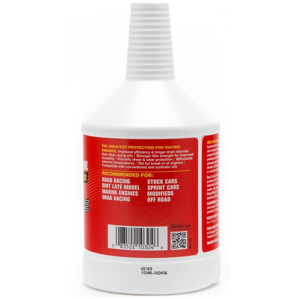 https://ebaystores.s3.us-east-2.amazonaws.com/trendsauto/Redline/REDLINE-10304-QTY8-1.jpg Redline, Red Line, 10304, 30WT, Quart, Motor Oil, Engine Oil, Race Oil, Racing Oil, 10W30, 10W-30, Off-Road, Offroad, Full Synthetic, Synthetic Red Line 10W30 30WT Drag Race Motor Oil 1-Quart - Pack of 8 10304 PART NUMBER: 10304 BRAND: Red Line Oil DESCRIPTION Set of 8, Full Synthetic 30WT Motor/Racing Oil 10W30, 1 Quart 30WT Race Oil (10W30) Popular in NASCAR and Road Racing Racing oils provide more wear protection than motor oils for passenger vehicles, however, these products contain fewer detergents and are not suitable for street use. Reformulated for improved frictional properties Special detergents for improved lubricity and less detonation Polyol ester base stocks provide more stability and film strength when exposed to excess fuel dilution Each of these products has no less than 2200ppm of zinc and phosphorus for antiwear Each race oil product is a multi-grade, offering 2-4% more power than oil of a similar viscosity - 30WT is a 10W30 Improved protection at startup, lower oil temp, cleanliness Remember to change these oils more frequently than regular motor oils Typical Properties Phosphorus, Avg PPM 2000 Zinc, Avg PPM 2250 SAE Viscosity Grade 10W30 Vis at 100 Celcius, CSt 10.0 Vis at 40 Celcius, CSt 64 Viscosity Index 141 CCS Viscosity, Poise, at Celcius 34 at -20 Celcius Pour Point, Celcius -50 Pour Point, Fahrenheit -58 Red Line Race Oils contain lower detergent and higher antiwear levels for the perfect no-compromise lubricant for engines used in racing VEHICLE COMPATIBILITY Universal / No Fitment