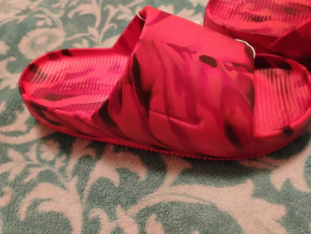 Red Nike slides for men in size 10. The iconic Nike brand ensures quality and style, making these slides a great addition to any man's shoe collection.