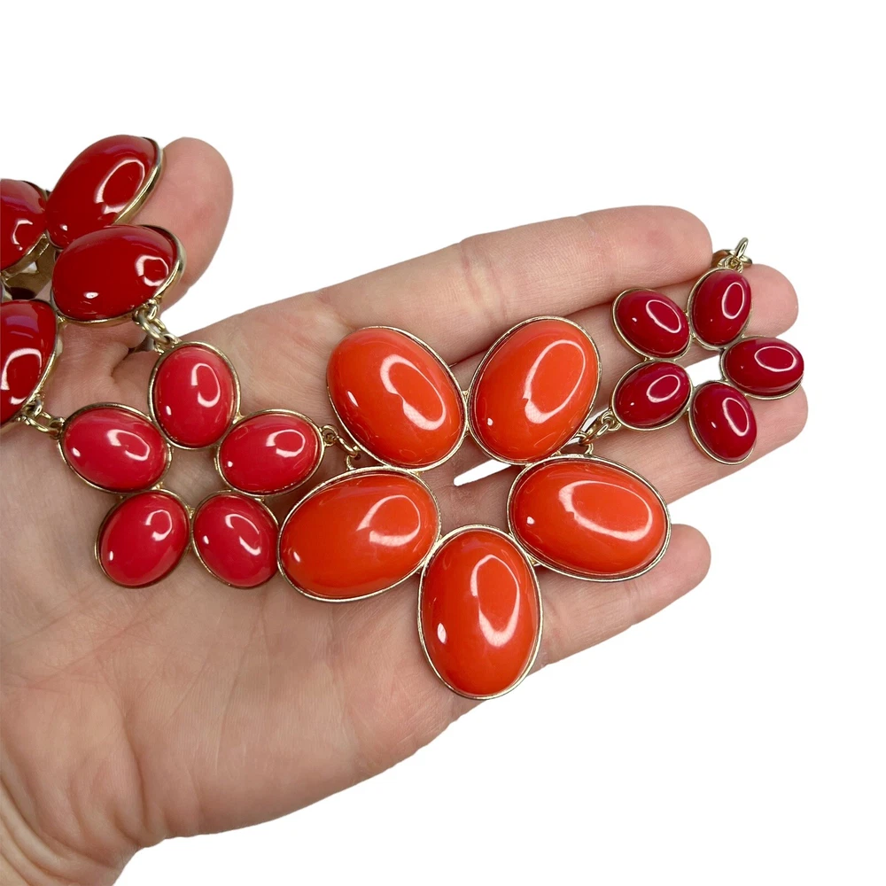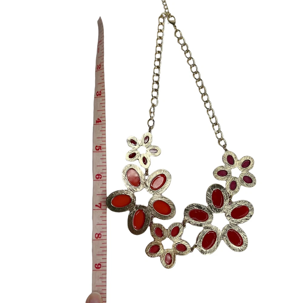 Red, Orange & Burgandy Floral Shaped Gold Tone Chain Statement Necklace. In gently preowned condition. No markings or branding and no precious metals. The floral petals are plastic and the entire piece is pretty lightweight. Extender included. Perfect necklace spring and summer.