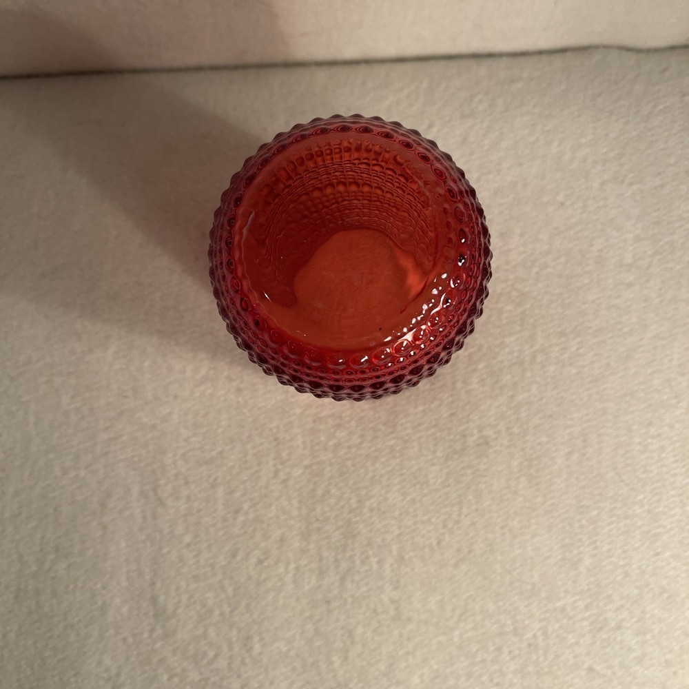 Elevate your home decor with the striking Red Textured Hobnail Glass Votive Holder. Exuding a sense of Art Deco elegance, this round candle holder features an all-over intricate pattern that catches the light beautifully, creating a mesmerizing effect on any surface. The rich red hue adds a pop of color to your space, making it a versatile piece that can complement various room themes. Crafted from high-quality glass, this original piece is designed to suit mini candles, providing a cozy and intimate ambiance. Measuring 5 inches in height and 3 inches in width, it's the perfect size for a subtle yet impactful statement. The item weighs 14.1 ounces, ensuring it's a sturdy and durable addition to your decorative collectibles. Excellent condition. No chips or cracks.