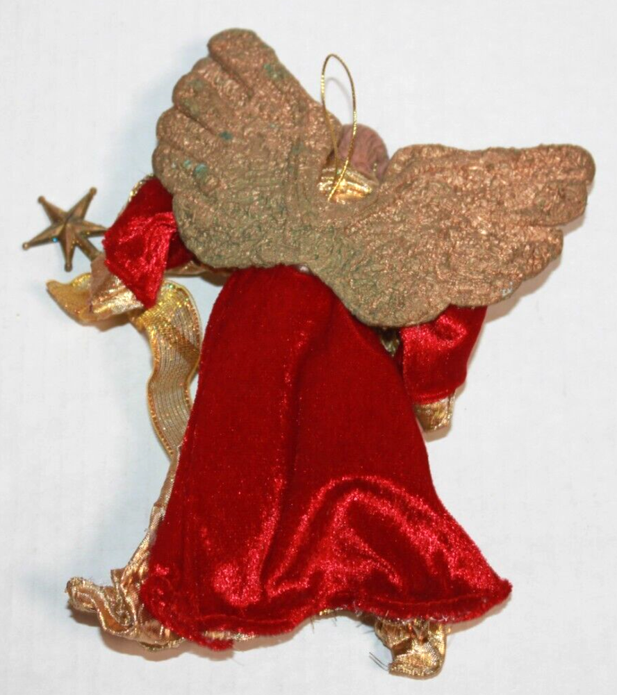 Red Velvet Gold Trim Ceramic Angel Christmas Ornament with Wand