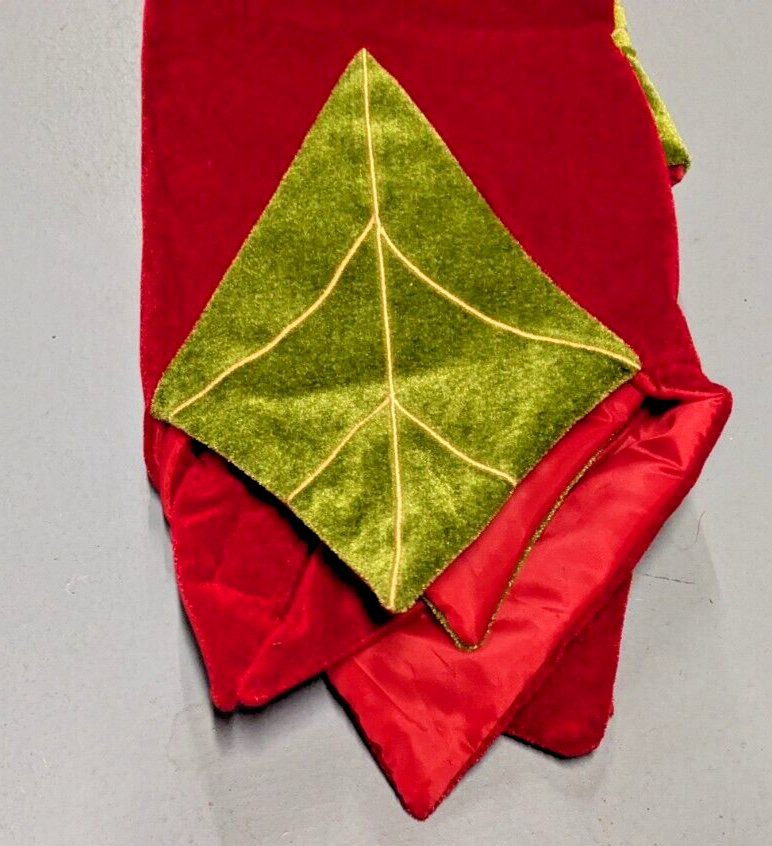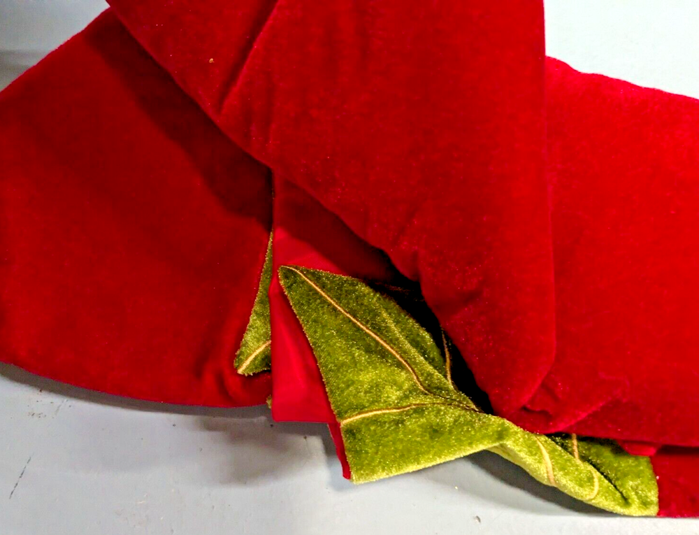 Add a festive touch to your Christmas tree with this beautiful red velvet tree skirt from The Christmas Shoppe. The skirt features a solid pattern with green leaves, adding a pop of color to your holiday decor. Measuring 52 inches in length, it's perfect for large trees and will cover the tree stand, making it a great addition to your Christmas decorations. Made of high-quality polyester and velvet materials, this tree skirt is not only stylish but also durable. It's designed with a textured feature and comes in a set of one piece. Please contact me with any questions. Thank you for looking.