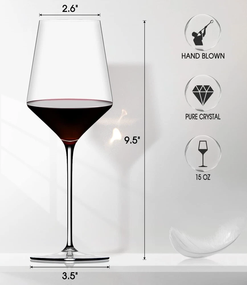 PURE CRYSTAL: LUNA&MANTHA comes from the brand,it's red wine glasses have passed the European certification, using premium titanium crystal, making the wine glasses ultra-thin (as thin as 0.8mm), brilliant and light enough. Its sparkling appearance, resonant sound and pleasant hold are indeed a gift you can cherish for years 100% HAND BLOWN: Inheriting traditional hand-blown craftsmanship, LUNA&MANTHA red wine glasses are carefully blown through 27 processes by sophisticated craftsmen with over 12 years experience. Unique glasses with its unique pulled stem, there is no seam between stem and bowl ENHANCE WINE TASTING: Tulip glassware is the best shape for wine glasses. The bowl is not only aesthetically pleasing, but it allows wine to breathe without over-oxygenating. The rim of the glass feels ultra-thin and inconspicuous in your mouth, like floating in the air and drinking. These make to better experience the wine itself while tasting it LONG STEM: The slender 4 3/4in stem allows to easily hold, and the decanent feeling in your hand makes it easier to swirl wine. Long crystal stem adds an elegant and refined visual feel to the wine glass. Not only exquisite artwork placed at home, but also a must-have for serving the most important guests GIFT BOX: Its modern packaging style is best for your friends and families as birthday or wedding gift. The intimately designed handle allows you to take crystal wine glass to anywhere safely. We also provide the perfect , any problem after receiving the wine glasses, please us, we will solve the problem for you soon