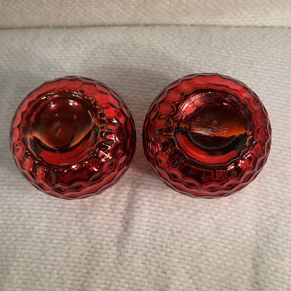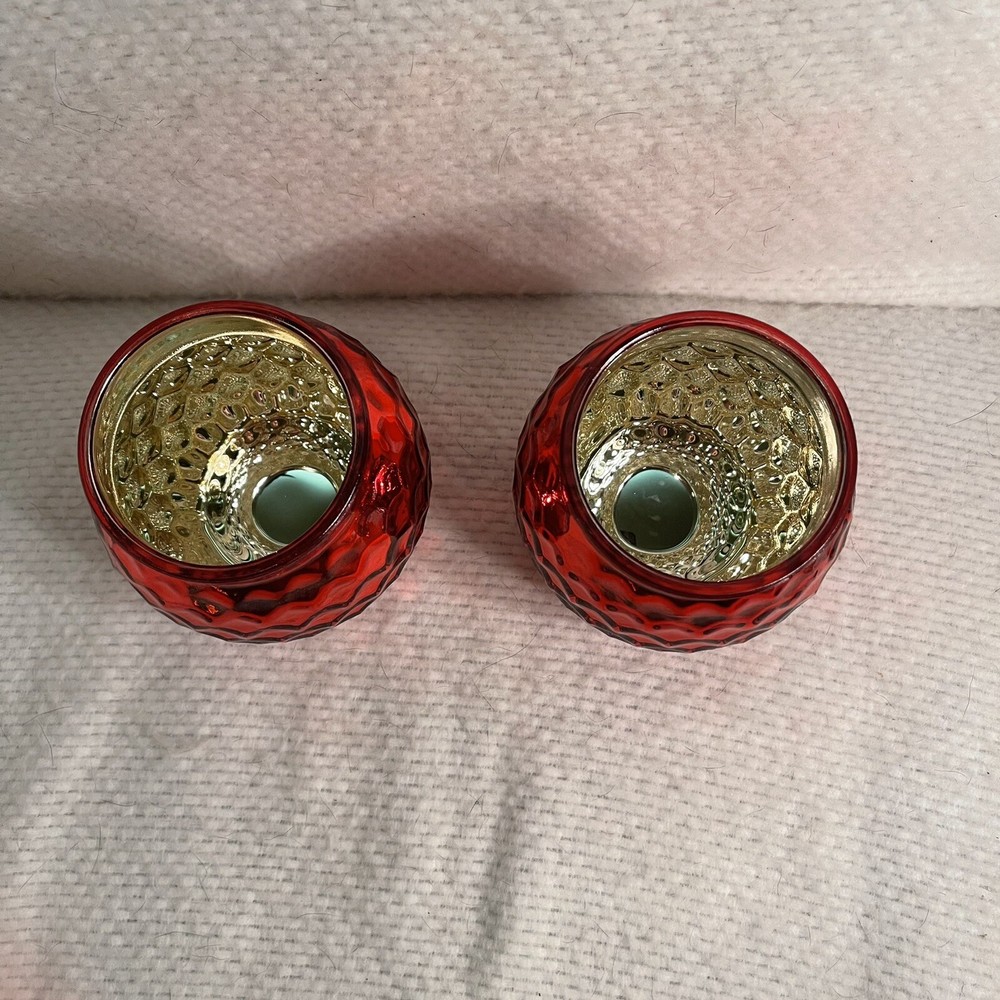 Add a touch of elegance to your Christmas decor with these beautiful votive holders. The round glass holders are designed with a unique fingerprint pattern in red and gold, perfect for adding a pop of color to any room. These contemporary style holders are suitable for mini candles and come in a pack of two. Crafted from high-quality glass and finished with a beautiful gold touch, these votive holders are a must-have for any collector. Measuring 3.25" in height and 3" in width, they are the perfect size for any occasion. Don't miss out on the opportunity to add these stunning holders to your collection. Excellent condition. No chips or cracks.