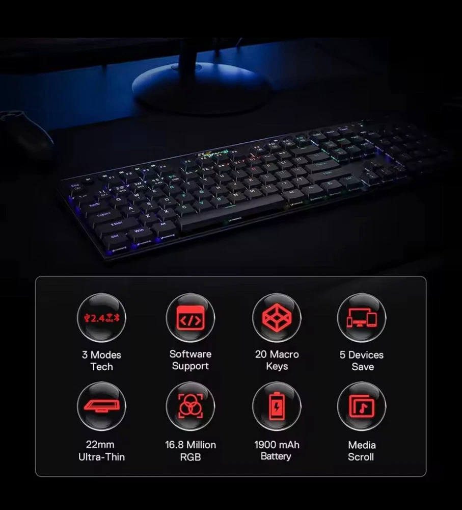 The Redragon K618 Horus Wireless RGB Mechanical Keyboard with Red Switches is a high-quality keyboard designed for gaming and computer use. It features a sleek black design, ABS material construction, and a QWERTY layout for standard typing. With wireless connectivity and multimedia integration, this keyboard offers convenient features for an enhanced typing experience. The 3-mode connection and enhanced function keys make it versatile for various tasks, while the illuminated RGB lights add a stylish touch. The rechargeable battery with a 1-3 months battery life ensures long-lasting use, making it a reliable choice for users looking for a durable and efficient keyboard.