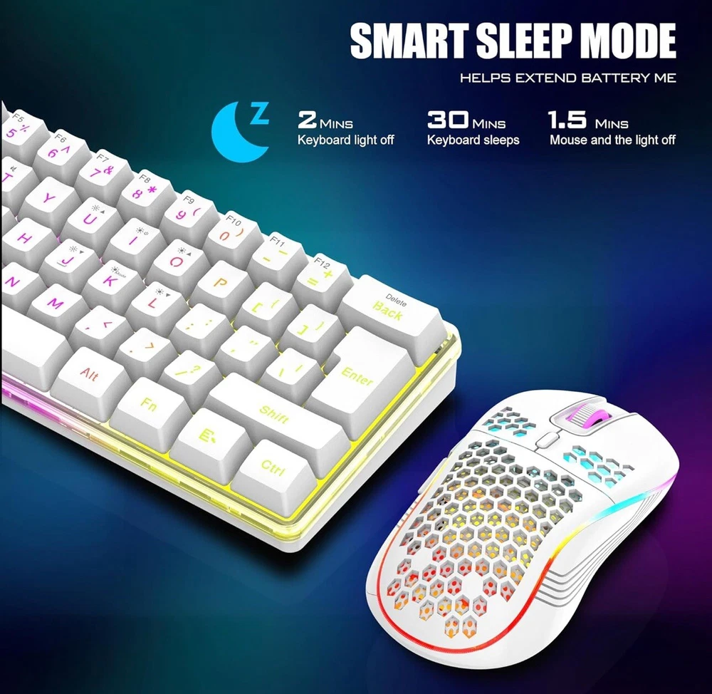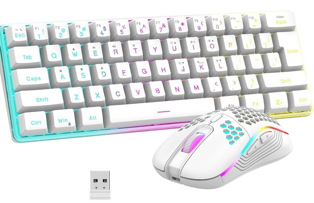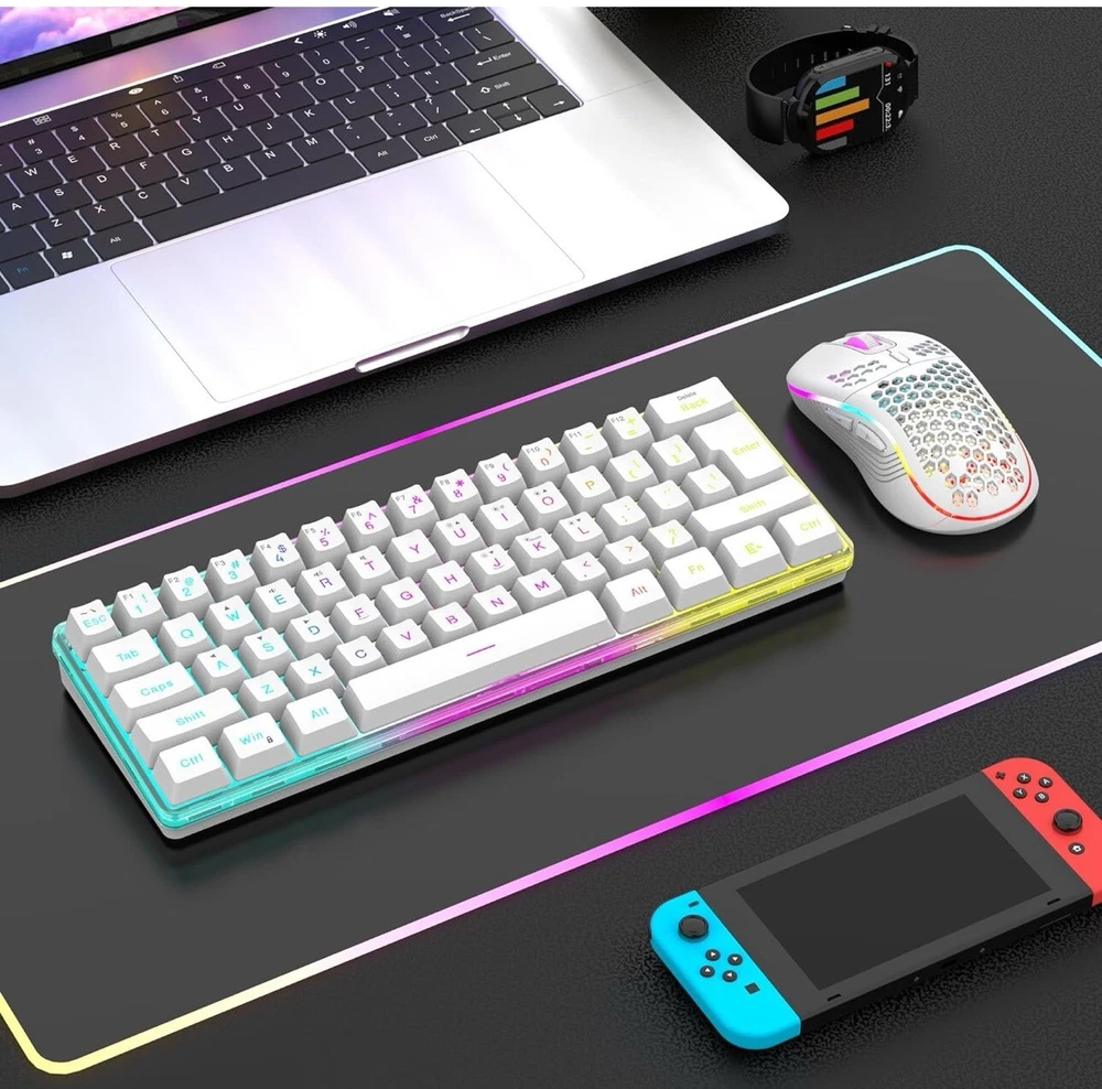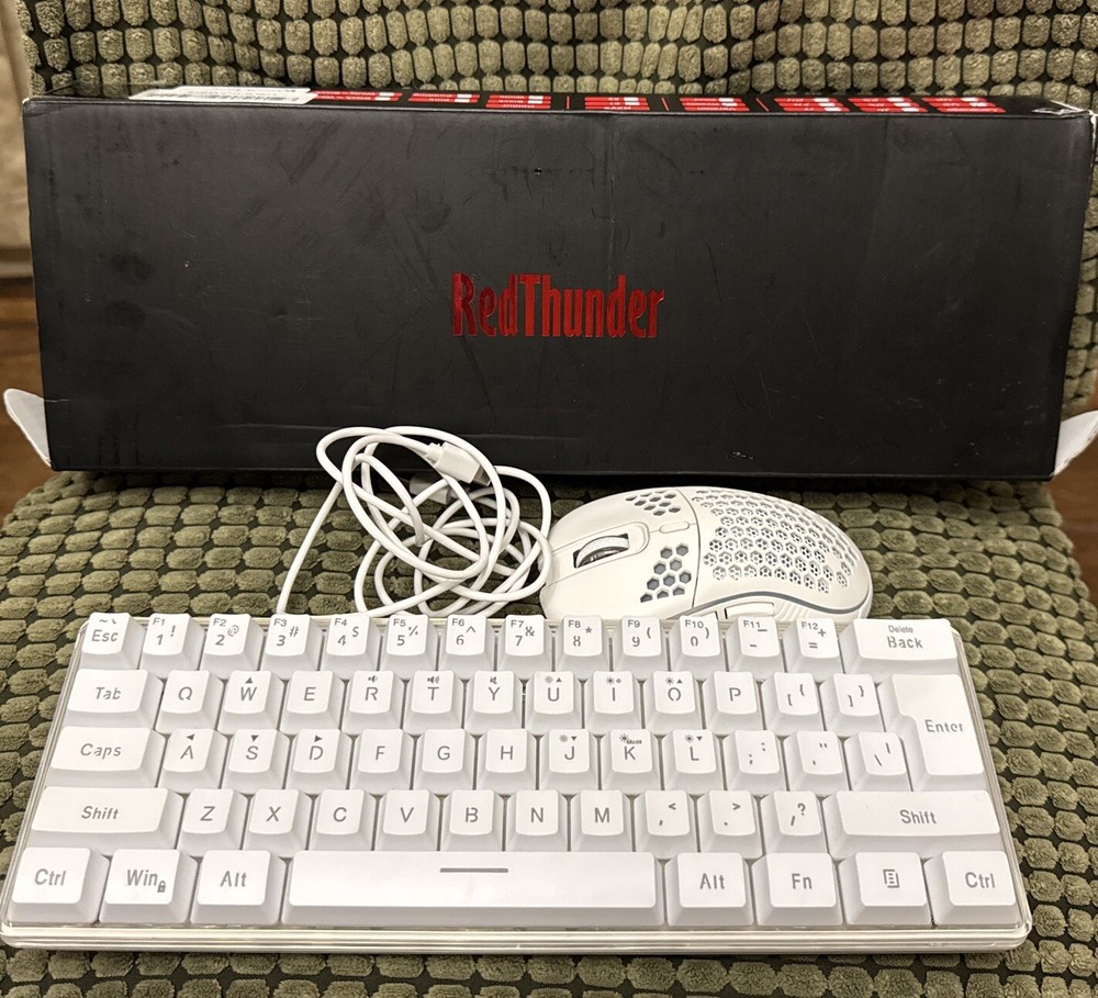 The Redthunder 60% Gaming Keyboard and Mouse Combo in white is a compact and portable unit with 61 keys featuring RGB lighting. The keyboard has a QWERTY layout and uses Bluetooth connectivity. The brand, Redthunder, is known for gaming peripherals, making this combo ideal for gaming enthusiasts looking for a sleek and stylish setup. The unit is designed for convenience and ease of use, perfect for gamers on the go.