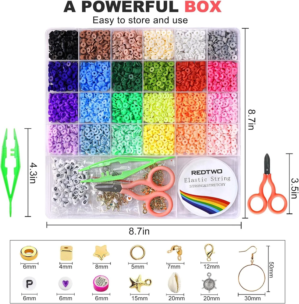 Redtwo Clay Beads for Bracelets Making Kit, 4200 Friendship Small, 24 Colors Product Details Color: 24 Colors Material: Clay Size: Small Brand: Redtwo Shape: Round Item Weight: 12 Ounces Number of Pieces: 4200 Manufacturer: Redtwo Product Dimensions: 8.7 x 8.6 x 0.67 inches Item Weight: 12 ounces Item model number: 4200 clay beads BRACELET MAKING KIT: All you need included,about 4000 pcs flat polymer clay beads and 200 pcs pendant set( contains letter beads, colored heart beads, Gold beads, shells, lobster claspetc.)1 rolls stretchy strings, a scissors, 1 plastic tweezer , to meet all your needs for bracelets making & jewelry making. PREMIUM QUALITY-SAFE TO USE:The diameter of clay beads is 6mm with a 2mm hole and the thickness is 1mm. the premium polymer clay beads refill are handmade with soft clay, The edge of clay beads are smooth, which can avoid hands being injured. The bands are high stretchy, soft and durable, and not break easily. so they are safe, eco-friendly, waterproof, skin-friendly and can be worn every day without fading quickly. All materials provided are completely safe and Gifts for Teen Girls ENDLESS CREATIVITY: Not only do bracelet making kits, but with this polymer clay bead kit, you can play with your children during holidays, improve parent-child relationships, keep your children away from electronic products, stimulate their creativity and imagination,and cultivate the interest of handicrafts. IDEAL GIFT CHOICE: A great gift for children as it helps improve hand eye coordination, hand flexibility, and attention. Choose meaningful and joyful gifts for birthdays, Valentine's Day, Mother's Day, Christmas, Thanksgiving, and more! QUALITY PROMISE:Redtwo have professional staff to control the quality of the bracelet making kit to ensure that the bead kits you receive are flawless. If you have any dissatisfaction or questions, please contact our customer service team. We promise to give you a satisfactory solution within 24 hours ,Thank you for supporting our brand REDTWO.