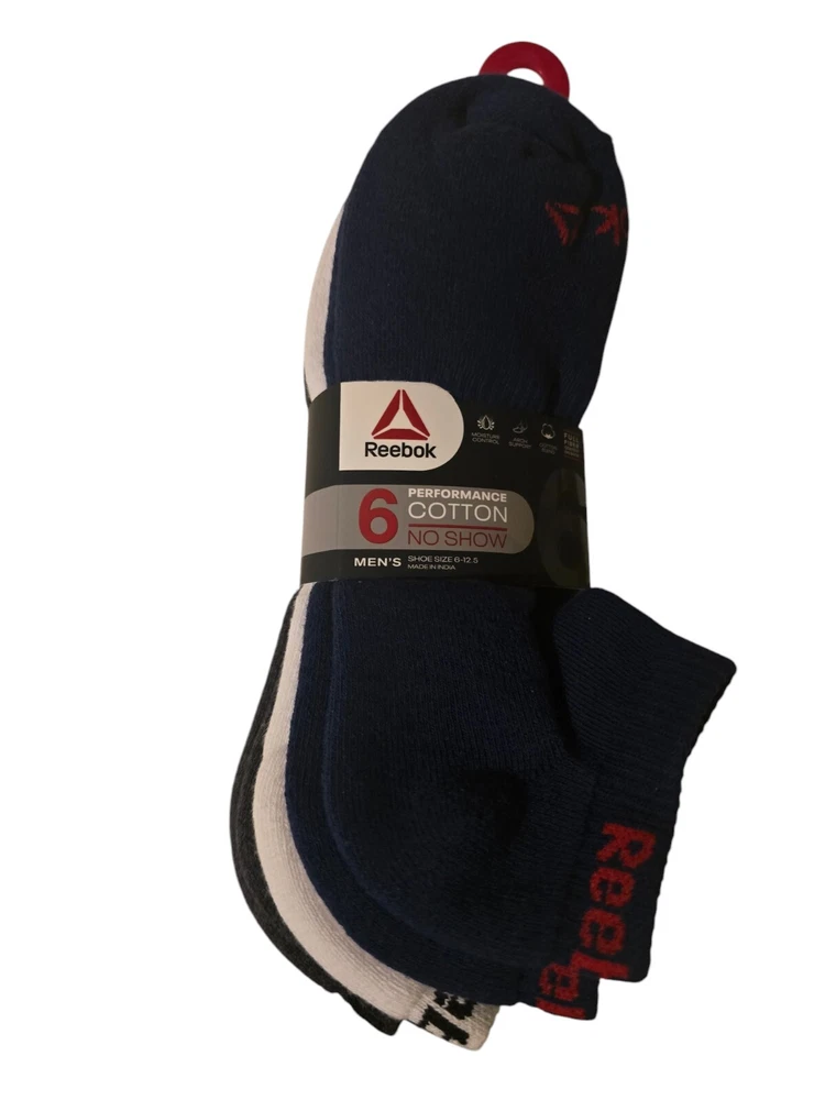 The Reebok 6-Pack Performance Cotton No Show Socks for men come in sizes 6-12.5 with a navy assorted color scheme. Made of polyester, spandex, and cotton, these athletic socks feature cushioning and moisture-wicking properties. Suitable for casual, formal, or business occasions, they are ideal for activities like gym training, walking, cycling, cross-training, and hiking in summer, fall, and spring seasons.