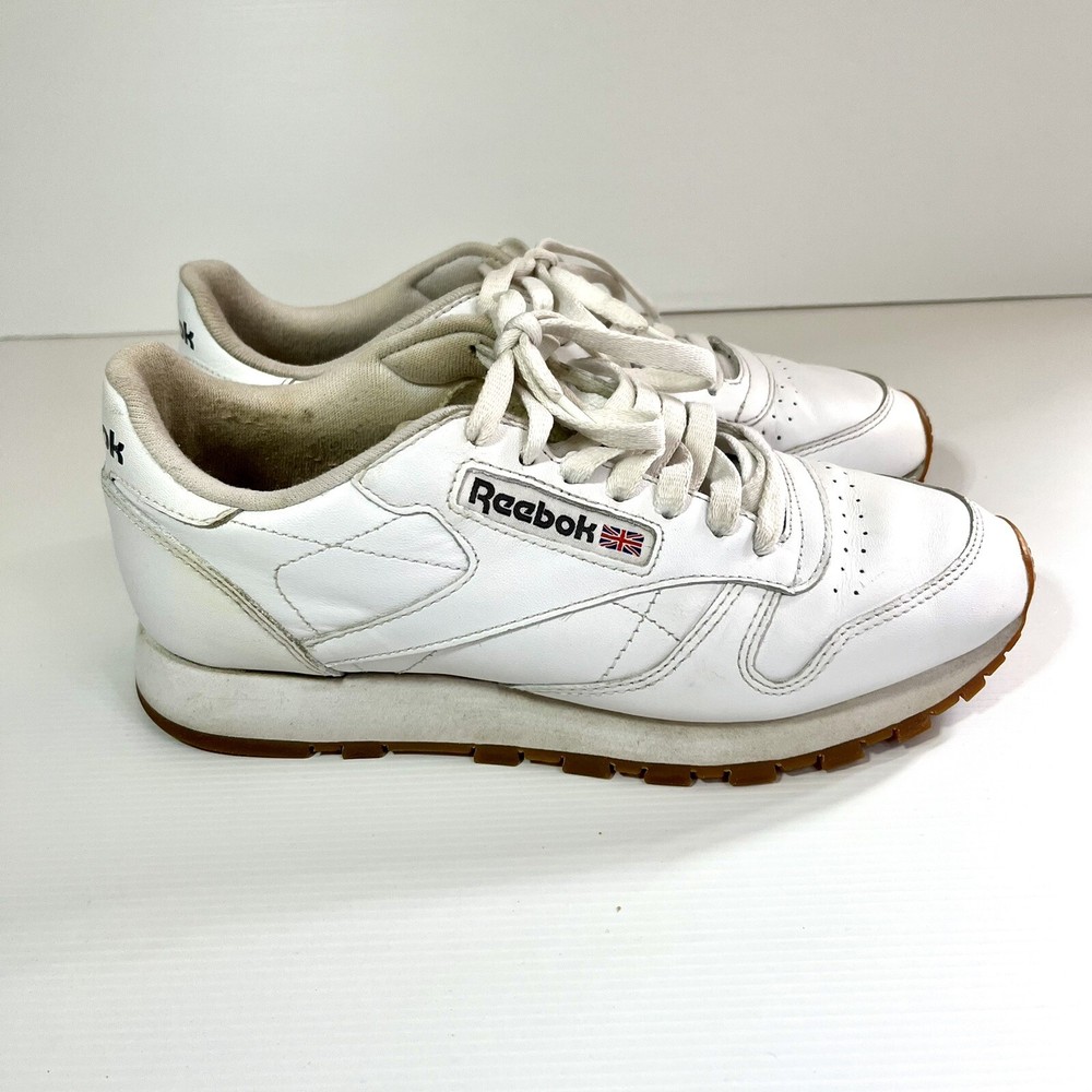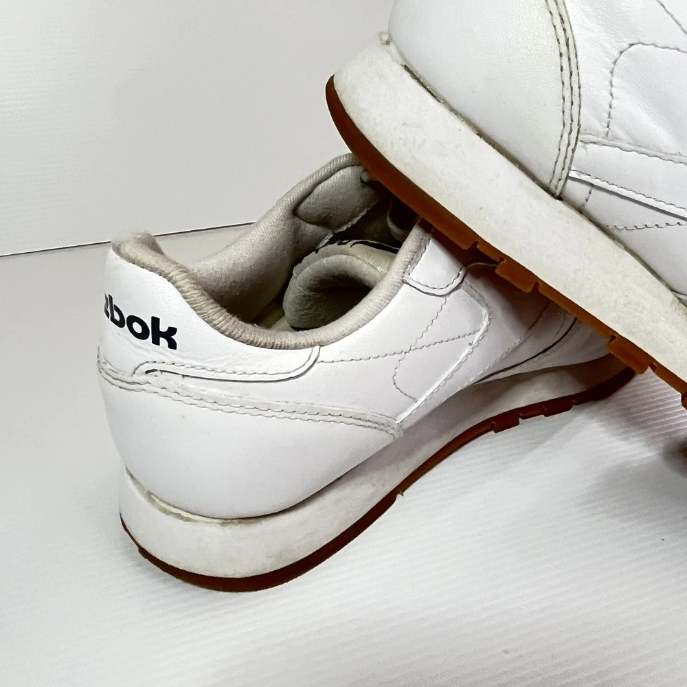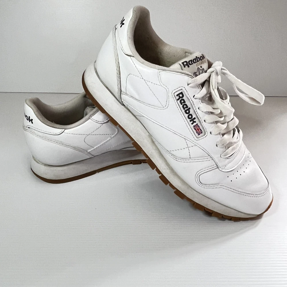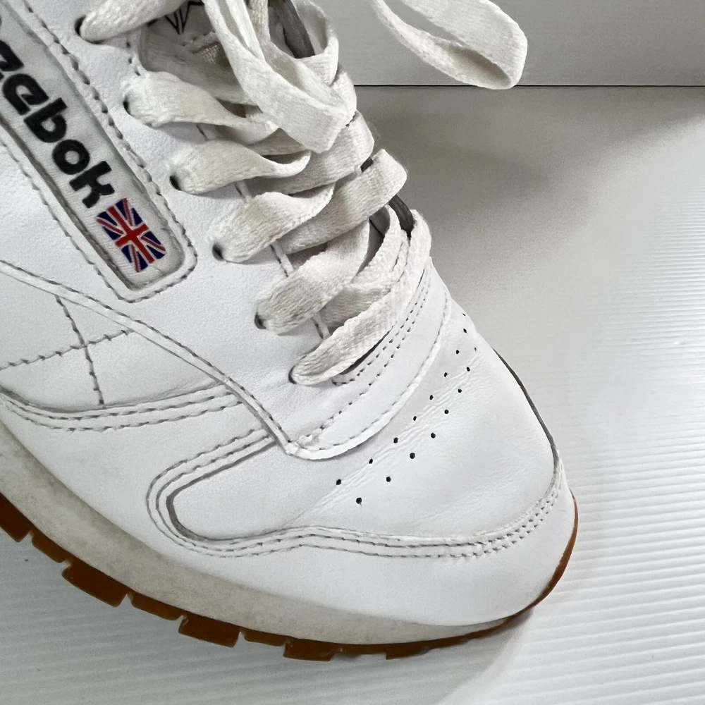 Step up your sneaker game with these pre-owned Reebok Classics Leather Athletic Shoes in intense white gum. Designed for unisex adults, these sneakers boast a UK shoe size of 6, a US shoe size of 7, and an EU shoe size of 39. The upper material is made of durable leather, ensuring both comfort and style. ———— Please see photos for condition. Also see measurements if applicable. Check out my other listings! All clothing have been washed and cleaned. All items are sent by tracked mail Vintage / secondhand items possibly show signs of age. See images for any wear, fading, stains, holes, marks or damage.