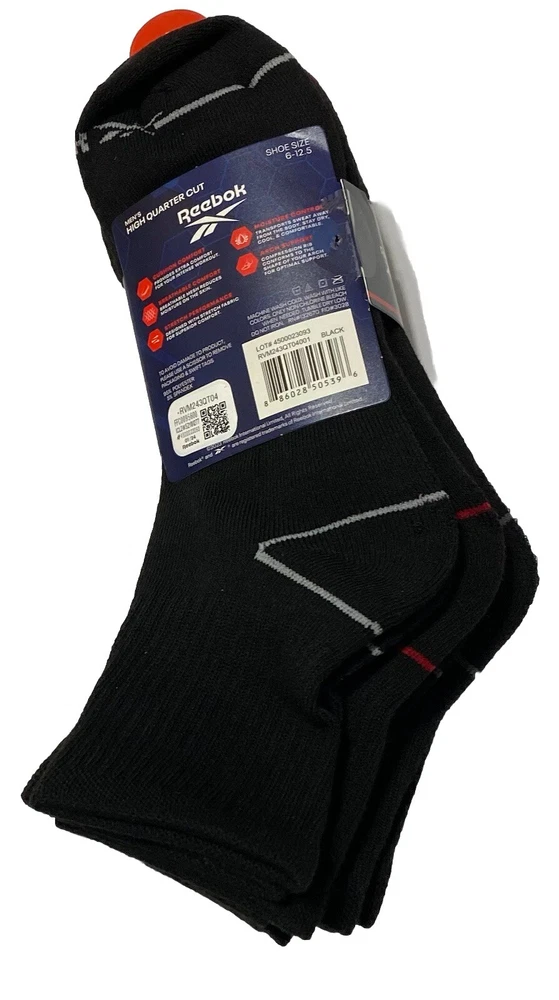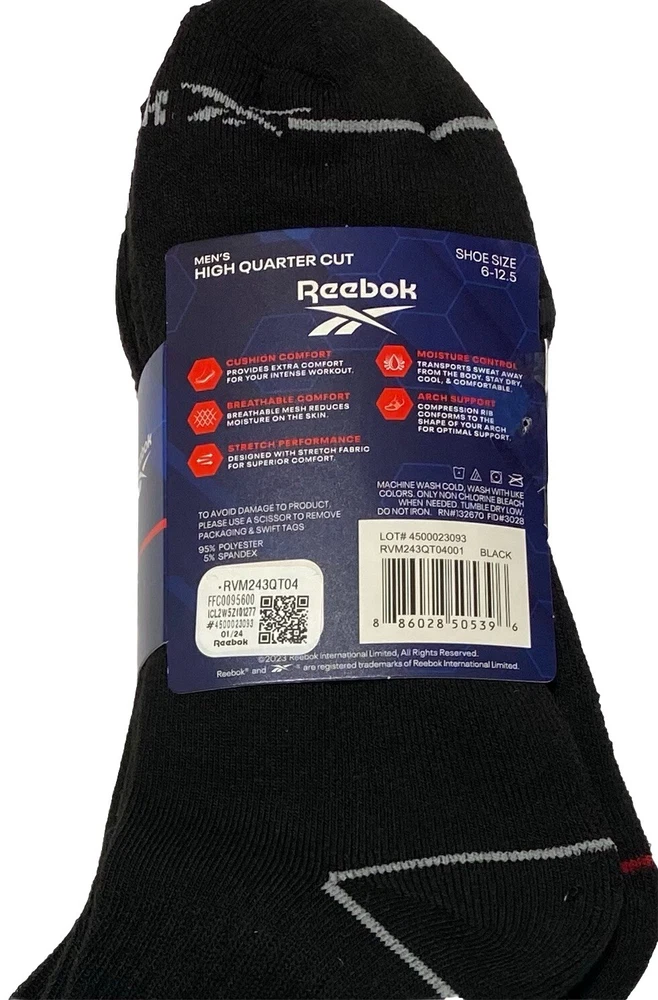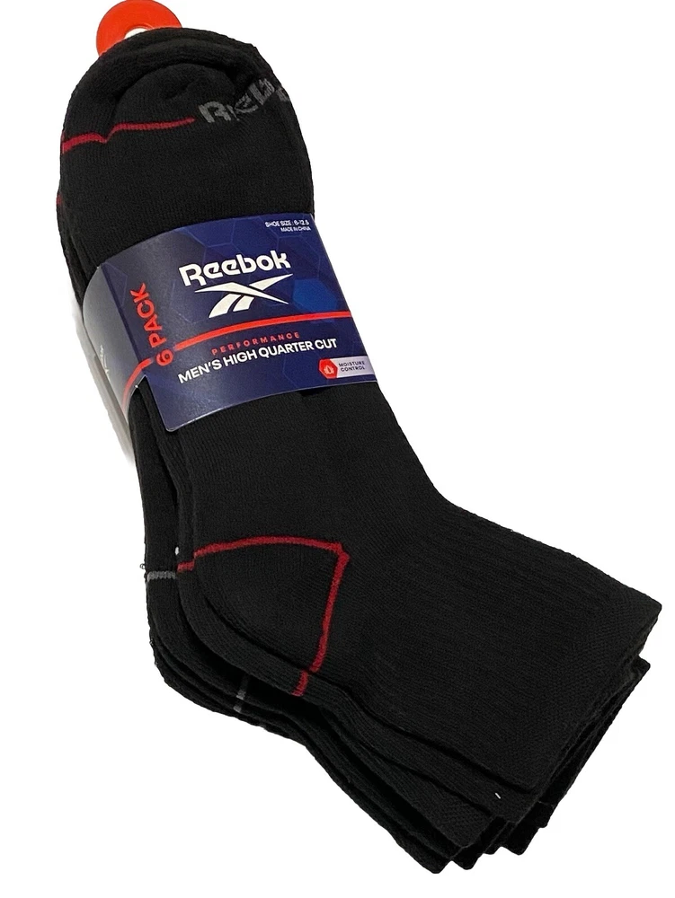 Reebok 6-Pair Men's High Quarter Cut Socks Black 95% Polyester 5% Spandex Sock Size: 10-13 fits Shoe Size: 6-12