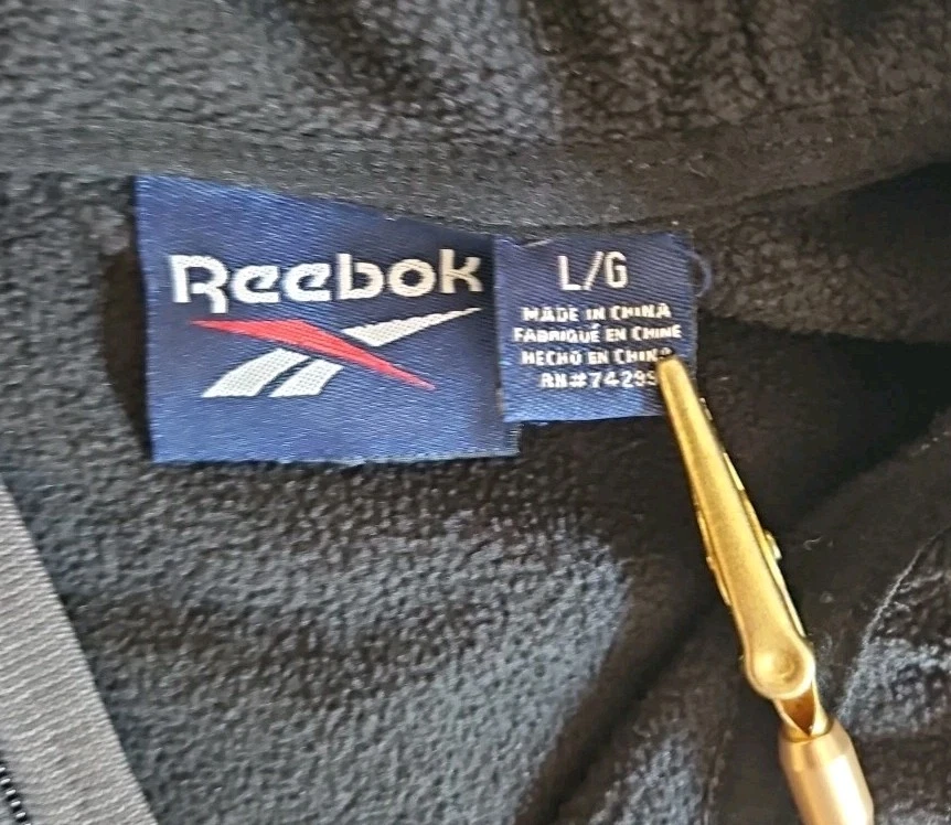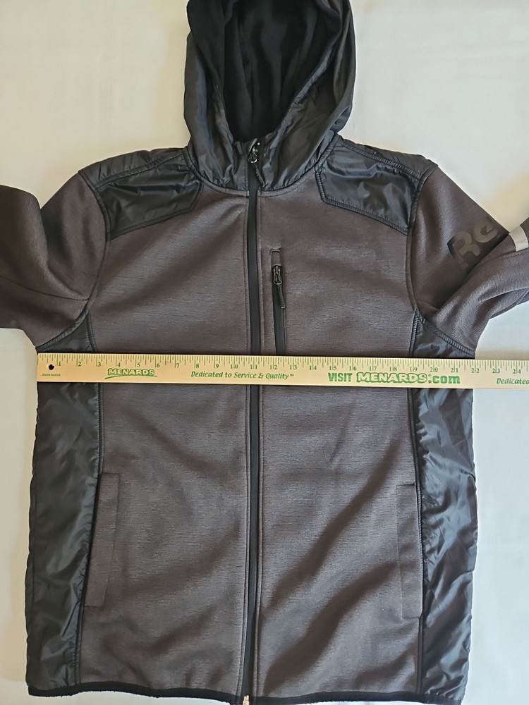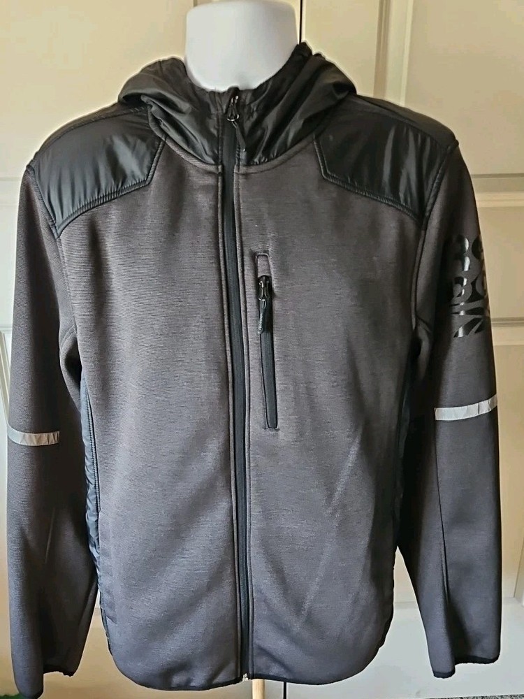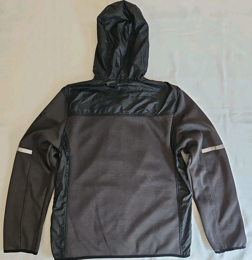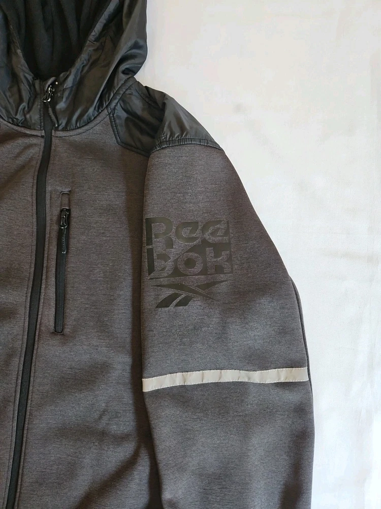 The Reebok Men's Hybrid Softshell Fleece Hooded Jacket in Black is a versatile and stylish outerwear piece perfect for casual occasions. Made with polyester outer shell material and featuring a softshell fabric type, this jacket offers both comfort and protection. The full zip closure, stand-up collar, and hood make it convenient for layering in various seasons. With accents like zippers and logos, this jacket also includes elastic waist, pockets, and a stretch fit for added functionality. The mid-length design and long sleeves make it a practical choice for activities like walking, cycling, or running. Pre-owned Excellent Condition Logo on the left side of chest is completely gone.