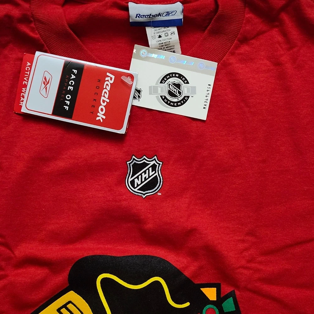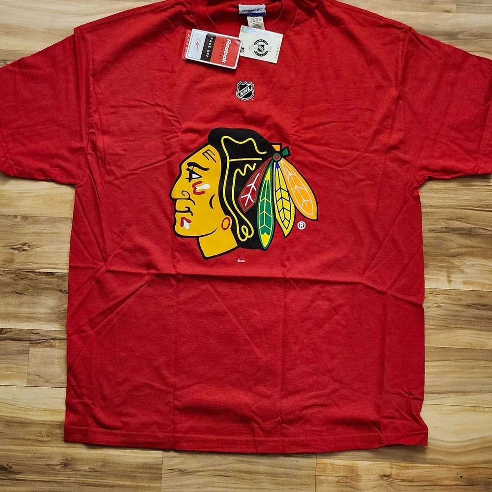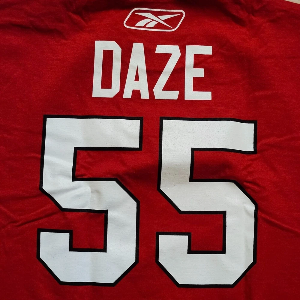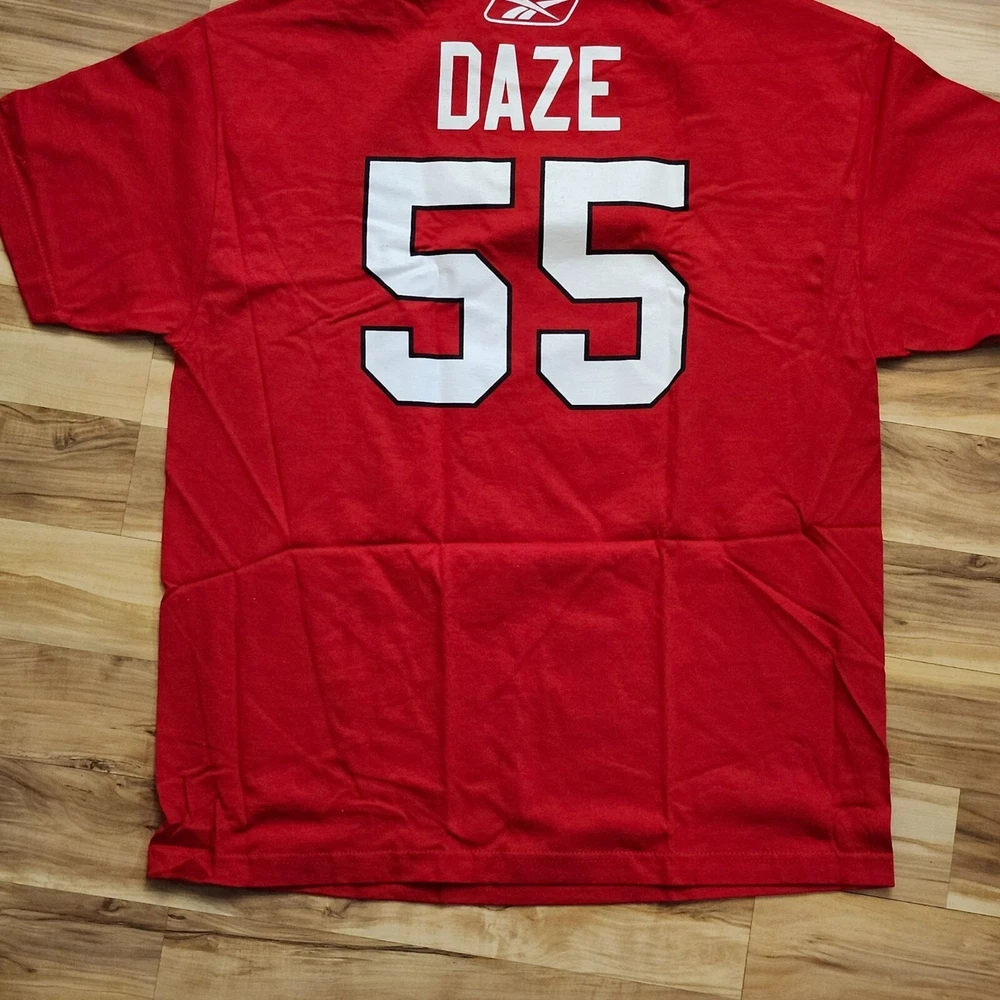 Show your support for the Chicago Blackhawks with this comfortable and stylish Reebok T-shirt. Ideal for hockey enthusiasts. • 100% Cotton • Official NHL Merchandise • Chicago Blackhawks Logo • Daze #55 on Back • Red Color • X-Large Size
