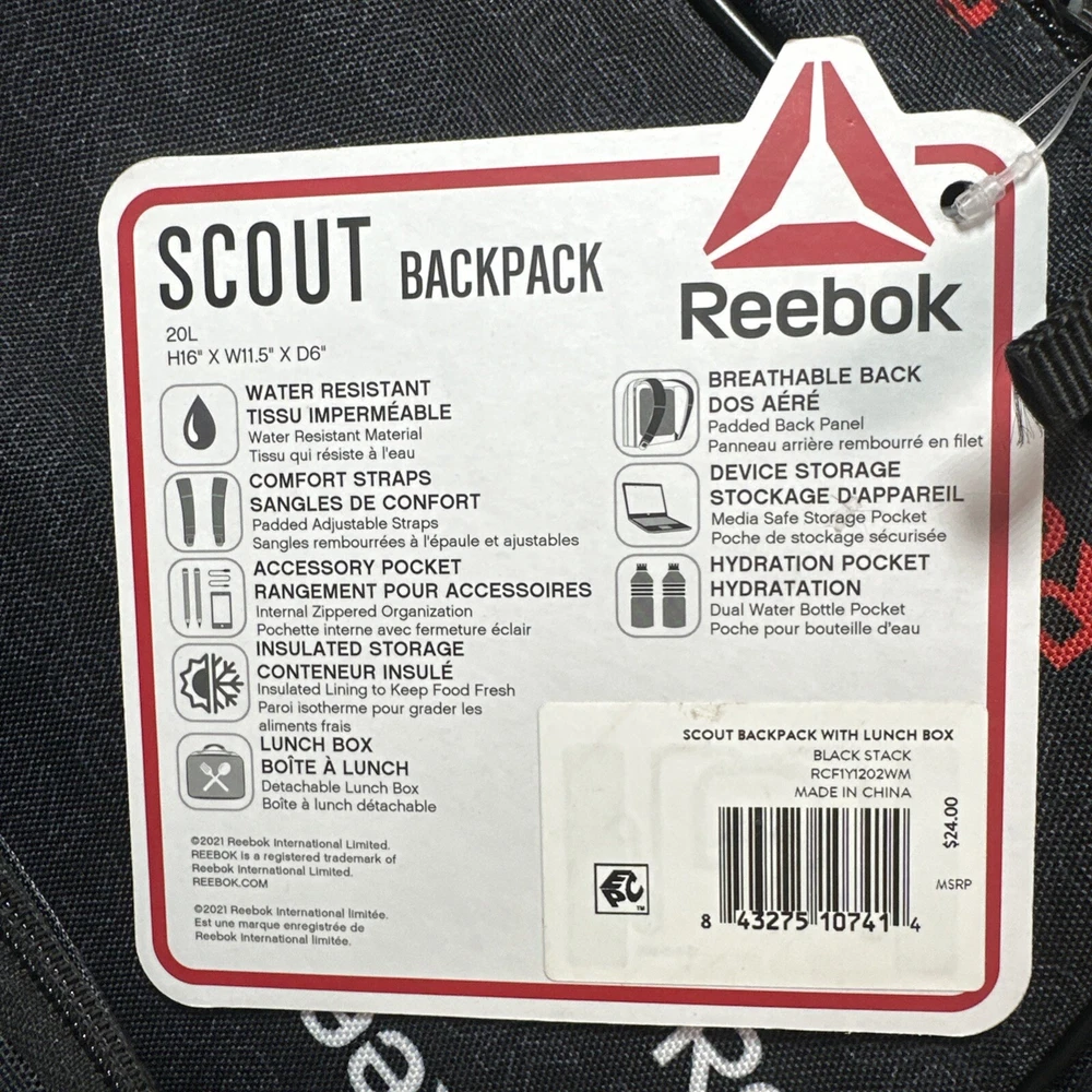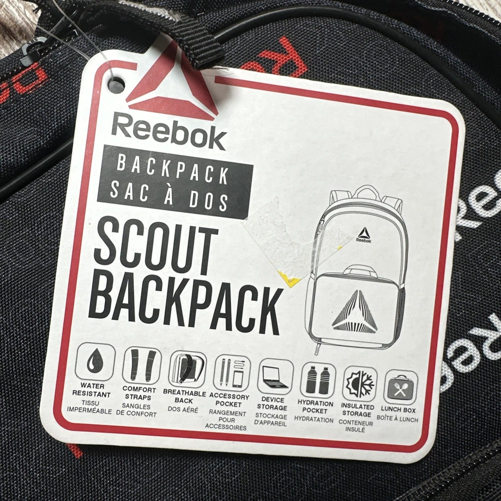 The Reebok Scout Backpack in Navy is a large, polyester backpack designed for both men and women. It features a zip closure and adjustable straps for comfortable wear. The backpack includes a detachable insulated lunch box, making it convenient for carrying meals on the go. With a sporty theme, this backpack is ideal for those who lead an active lifestyle. It also includes a bottle pocket for easy access to hydration during activities.