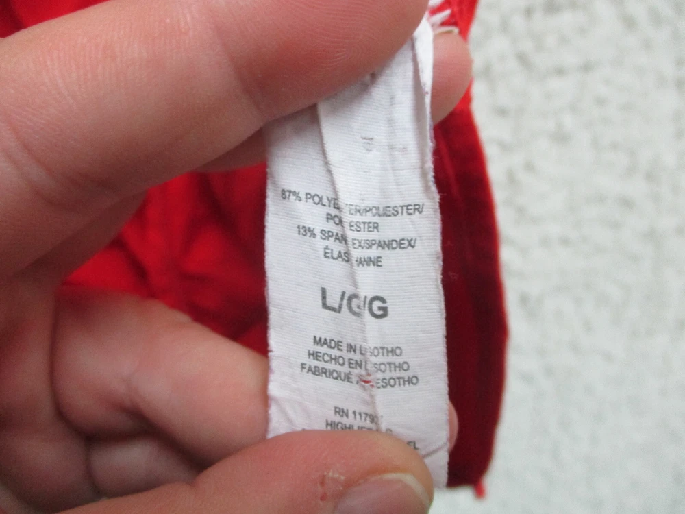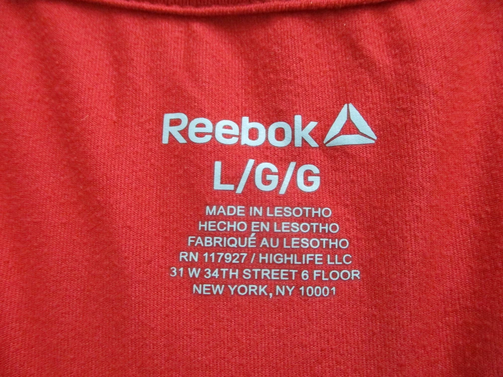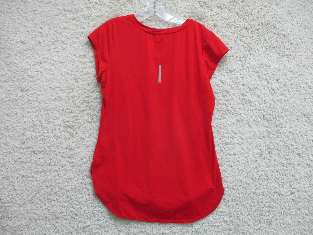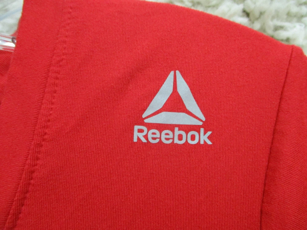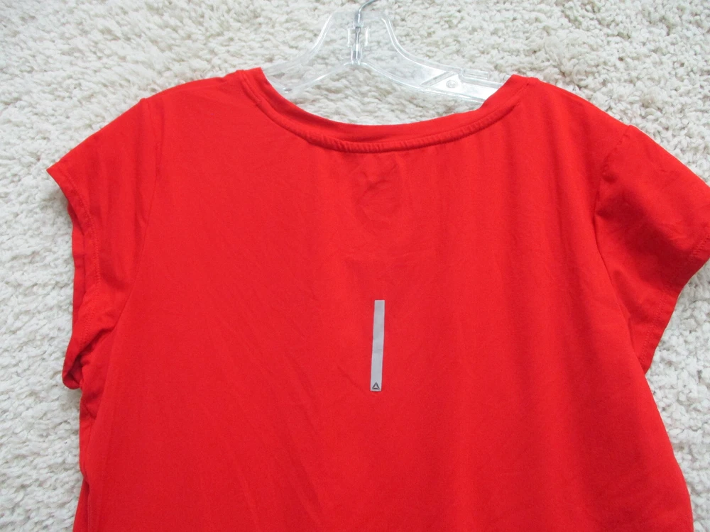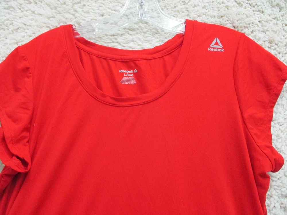 Size: L Season: Fall, Spring, Summer, Winter Sleeve Length: Short Sleeve Closure: Pullover Pattern: Solid Sleeve Type: Casual Sleeve Theme: Love Type: T-Shirt Style: Basic Country/Region of Manufacture: China Fit: Athletic Brand: Reebok Occasion: Casual Department: Women Color: Red Features: All Seasons, Easy Care, Stretch Neckline: Crew Neck Material: Polyester Blend Size Type: Regular Seller Notes: “Very Good Used Condition. Please, See Pictures for Full Condition and Measurements.”