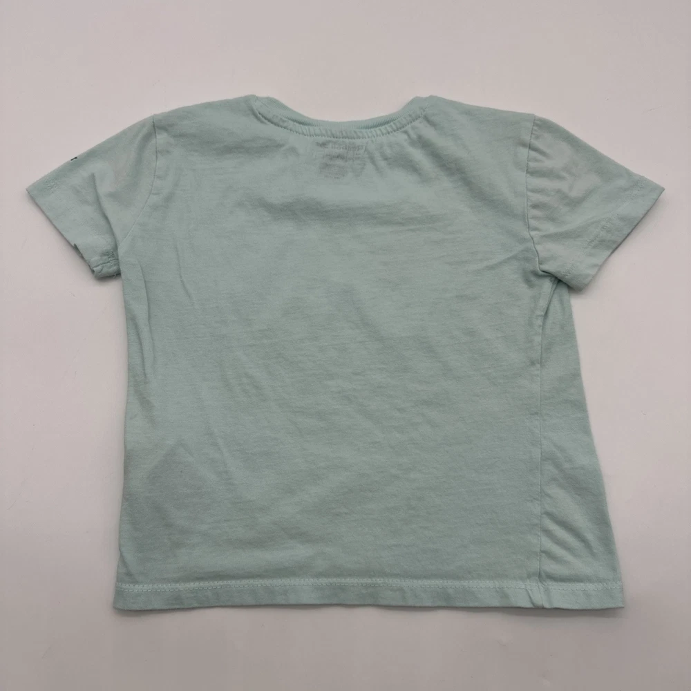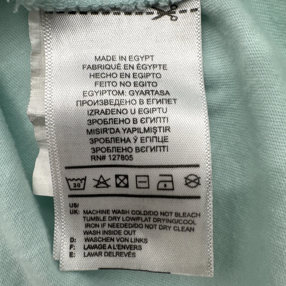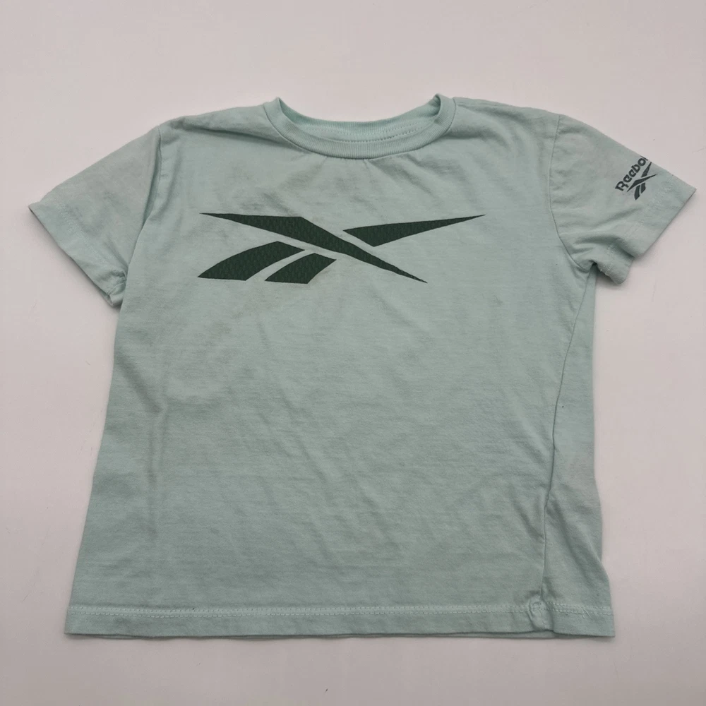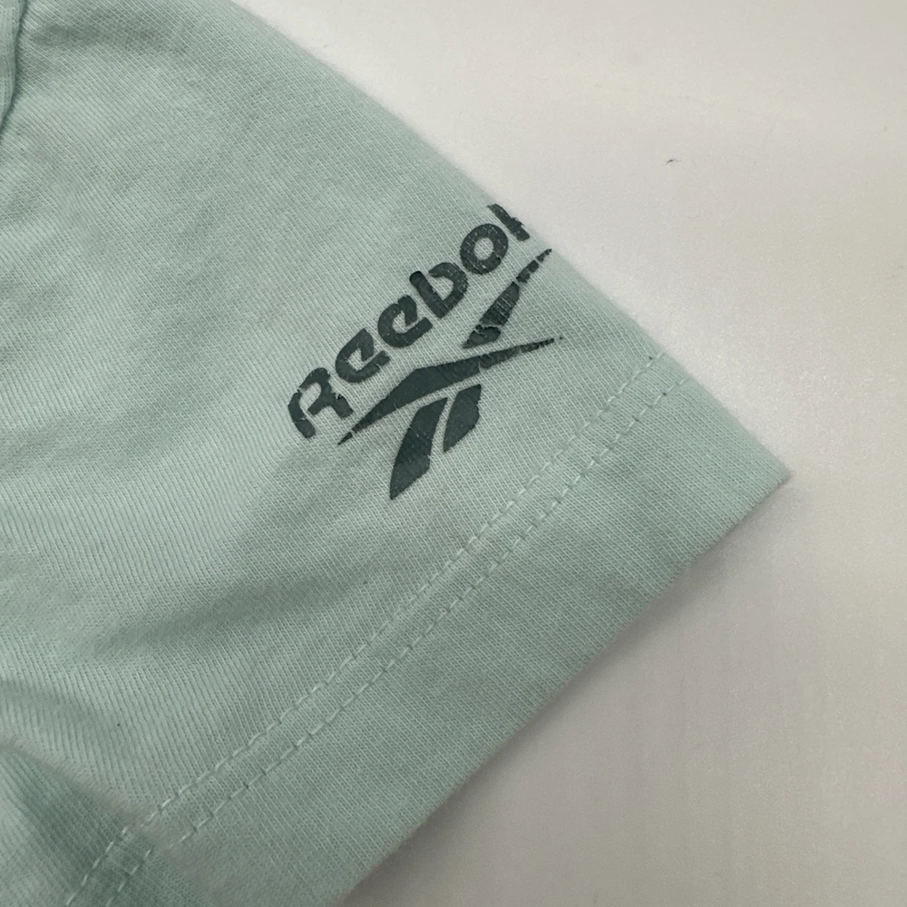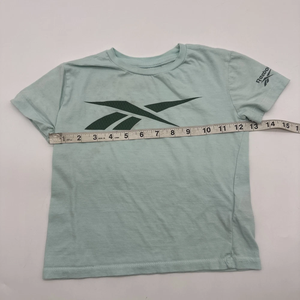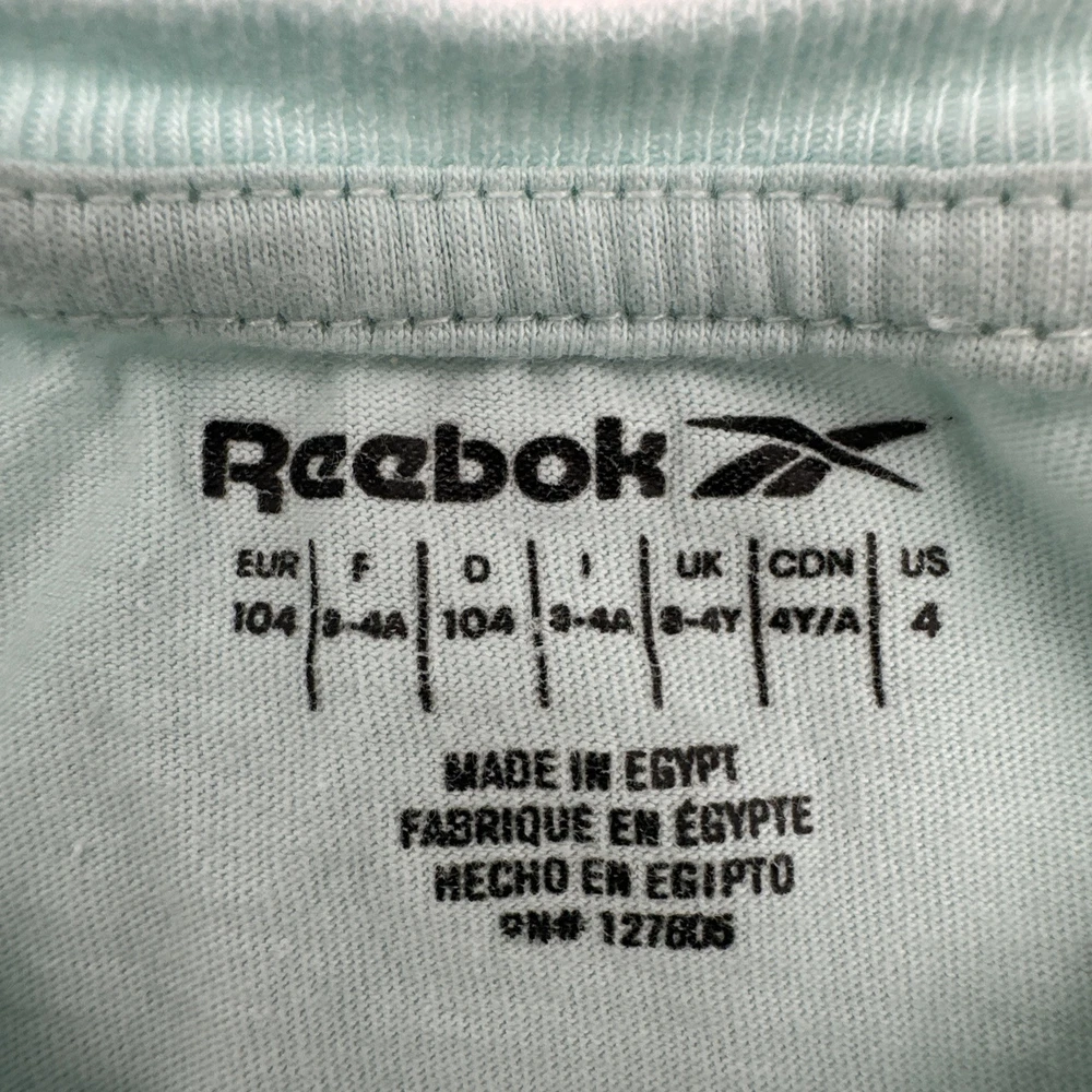 This is a Reebok T-shirt for youth girls in size 4, featuring a green color with a graphic print logo. It has a crew neck, short sleeves, and a relaxed fit. Made from a blend of polyester and cotton, the T-shirt is designed for casual wear and suits all seasons. Perfect for activities like walking or the beach, this top offers comfort and style with a sports theme. Check pictures for flaws and measurements