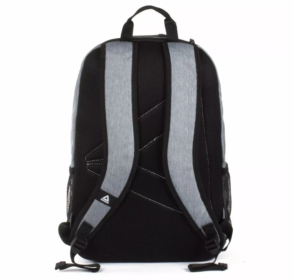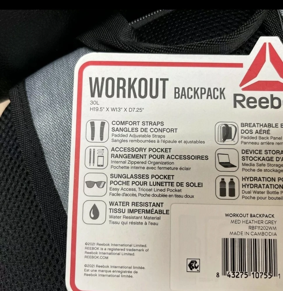 This Reebok workout backpack is the perfect accessory for any gym session or outdoor adventure. With a spacious 12" width and 5" depth, it offers plenty of room for all your essentials. The bag is made of durable polyester fabric and features a water-resistant design, making it suitable for any weather conditions. The backpack also comes with adjustable straps for comfortable carrying and a shoulder strap handle style. Additionally, it includes several inside pockets, a laptop sleeve/protection, and a bottle pocket for your convenience. The backpack is adorned with the Reebok logo and is a part of the Reebok product line. It is a regular-sized bag and was manufactured between 2020-2029 in Cambodia.