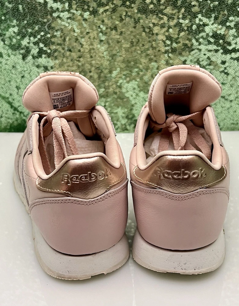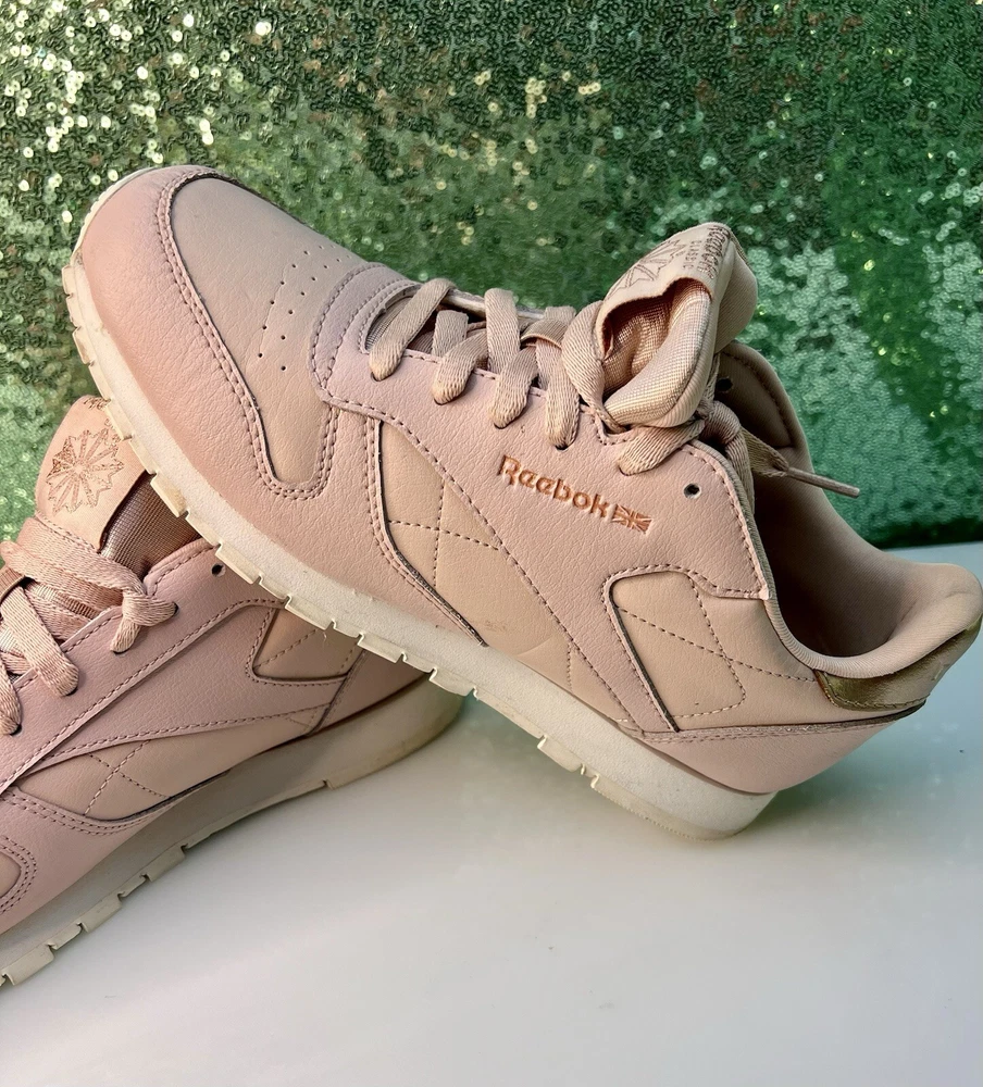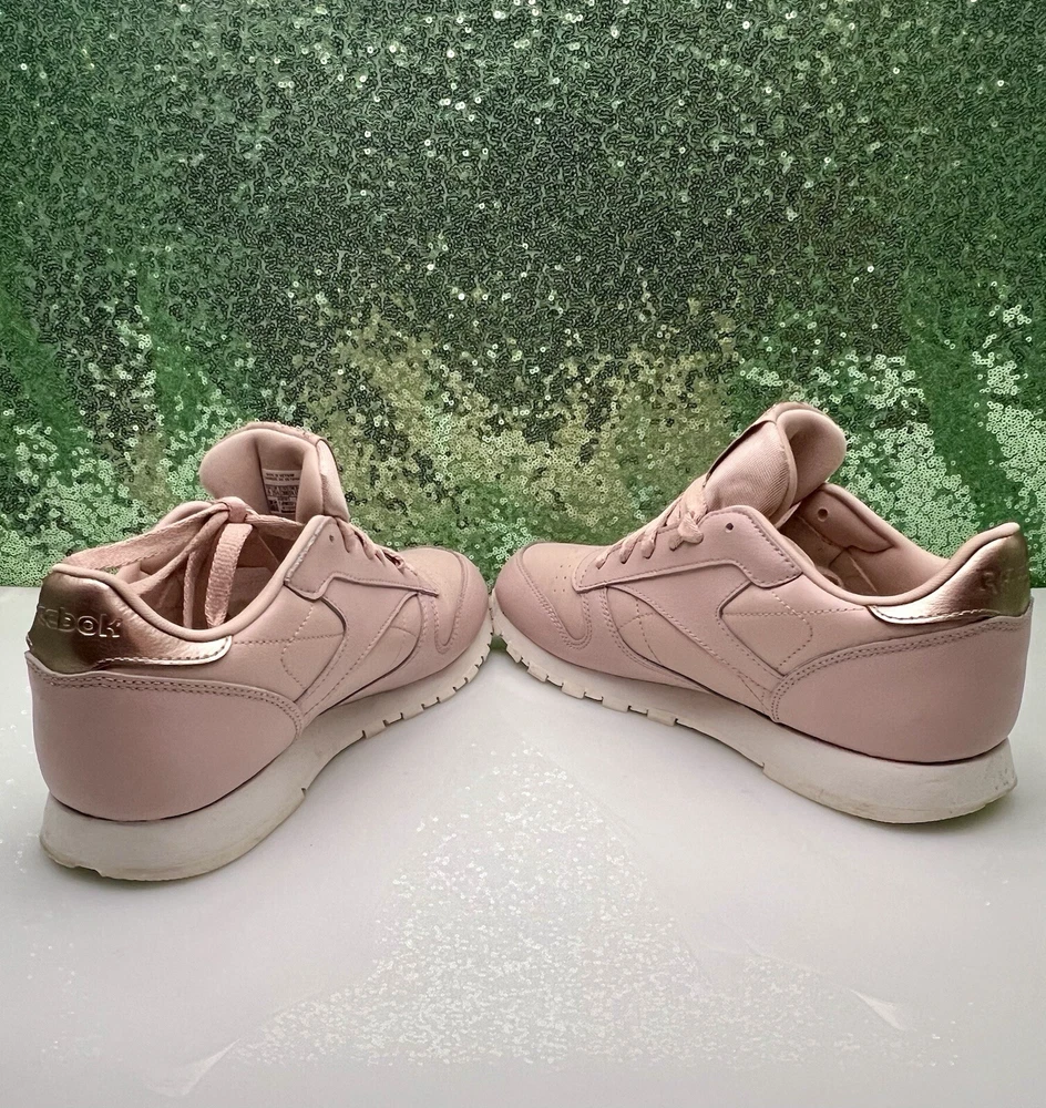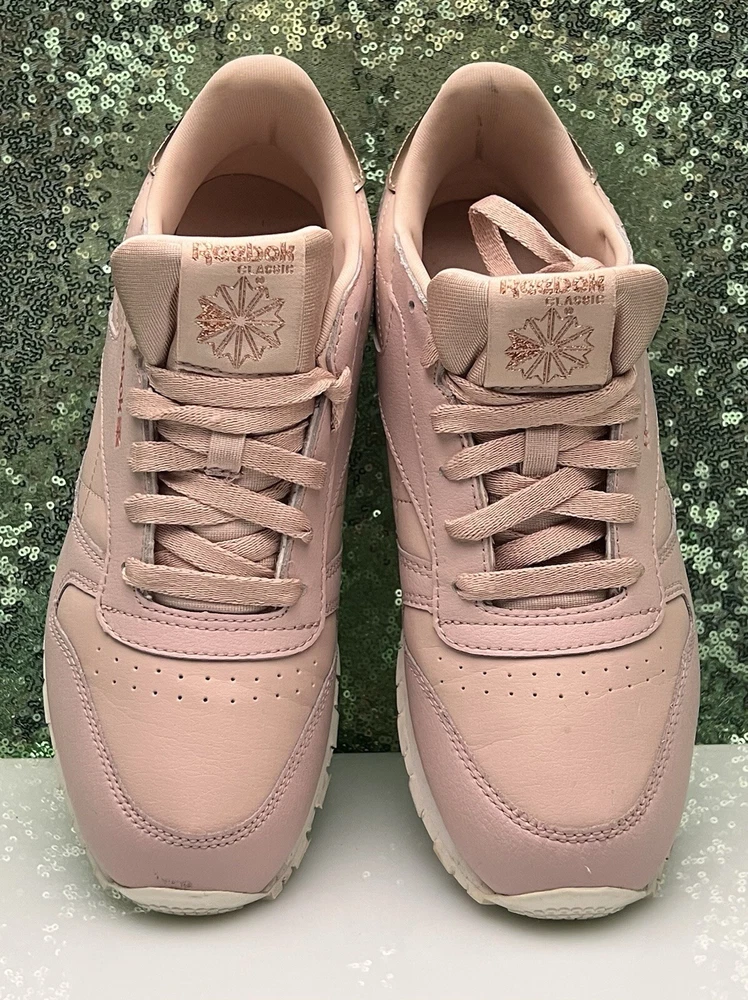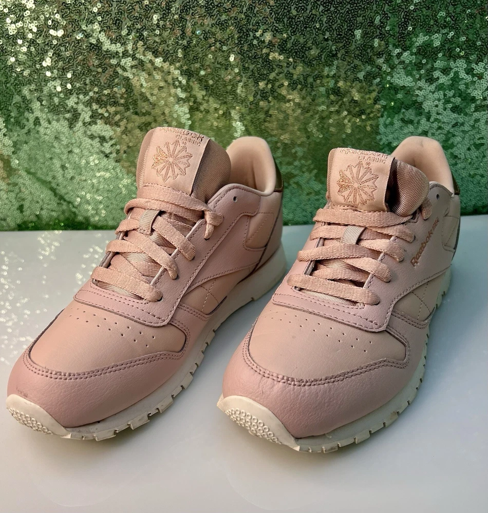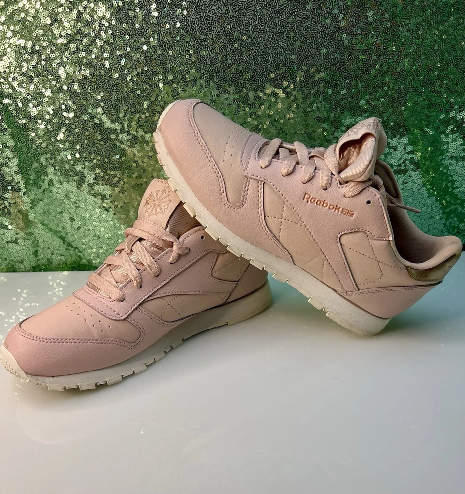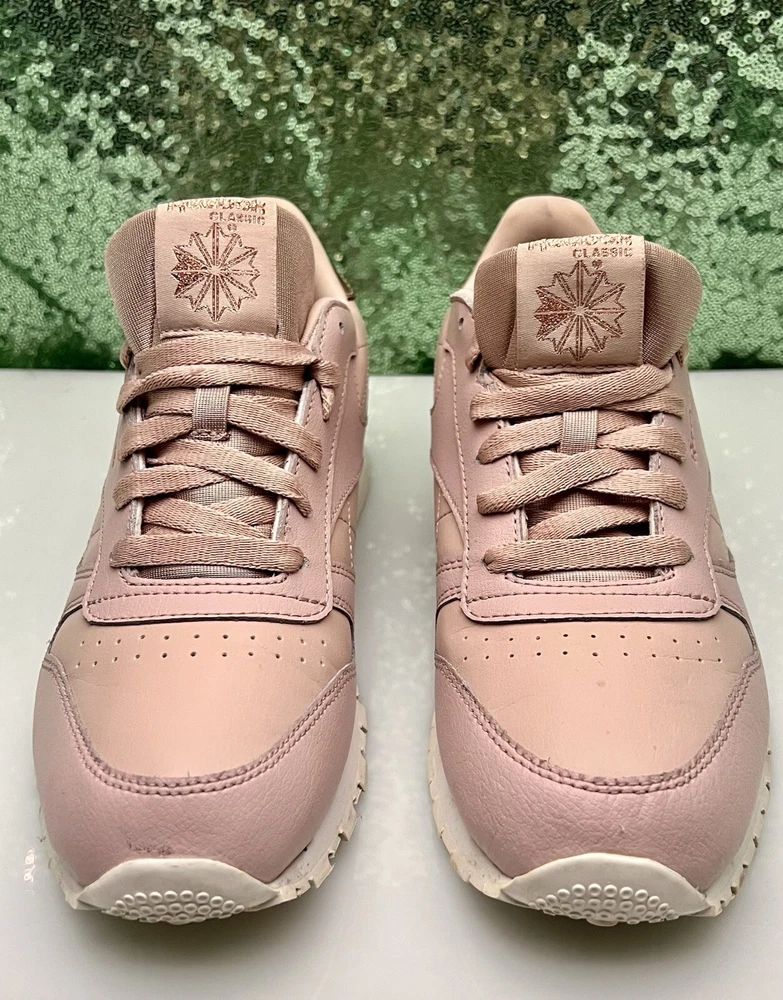 Reebok Women Athletic Shoes in Chalk Pink, size 6. These Classic Leather sneakers feature a lace-up closure and are crafted from leather. They offer cushioning, comfort, and breathability, making them ideal for activities like gym training, walking, and running. With a standard shoe width and a classic theme, these Reebok Classics Leather shoes are perfect for casual or activewear in the summer, fall, and spring seasons.