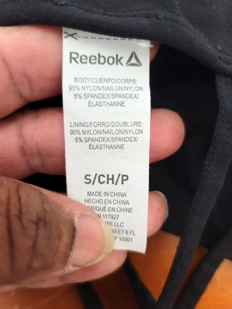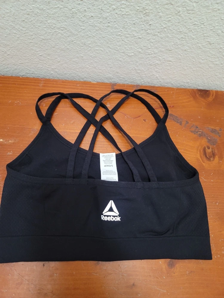 This Reebok sports bra, crafted from a nylon-spandex blend, offers support and style with crisscross straps and a sleek black design. • Strappy design • 95% Nylon, 5% Spandex • Reebok logo • Black color • Small size Underarm to underarm = 13 inches. No visible flaws detected. CONDITIONS use, good conditions. see photos for more details.