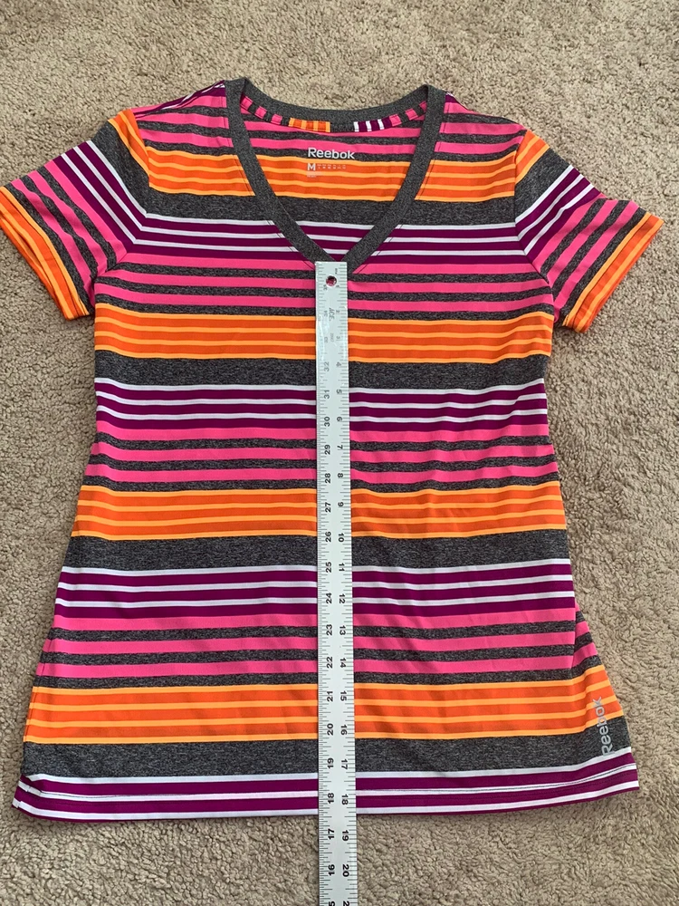 Item is preowned in great condition Reebok Womens shirt. Items are carefully inspected and sealed after photos. We cannot check additional measurements or details for you. Please note, item measurements are approximate and in the photos. Previous washings may change the sizing. Please compare our measurement photos to your favorite garments to ensure fit. Colors remain vivid, we store our items in a smoke free environment If the item is pre-owned, it's cleaned per eBay standards. We do not use any freshener or scents. Shipping and Return Details We ship daily so that you receive your item quickly. I have a 30 day return policy. Please feel free to ask any questions you may have. I try to answer as quickly as possible.
