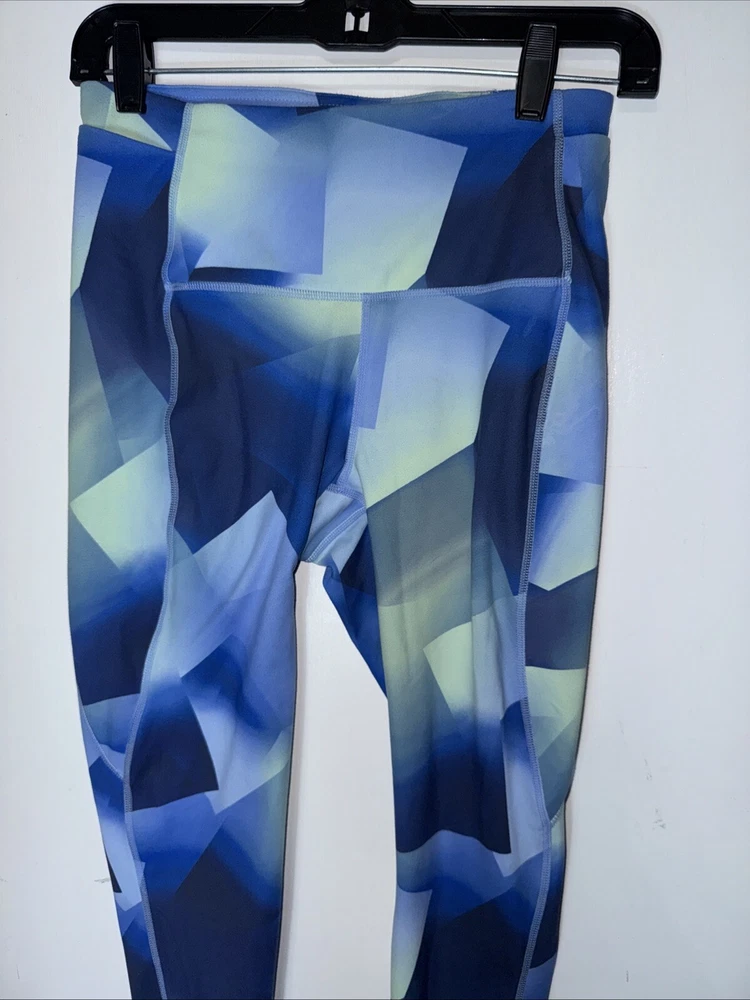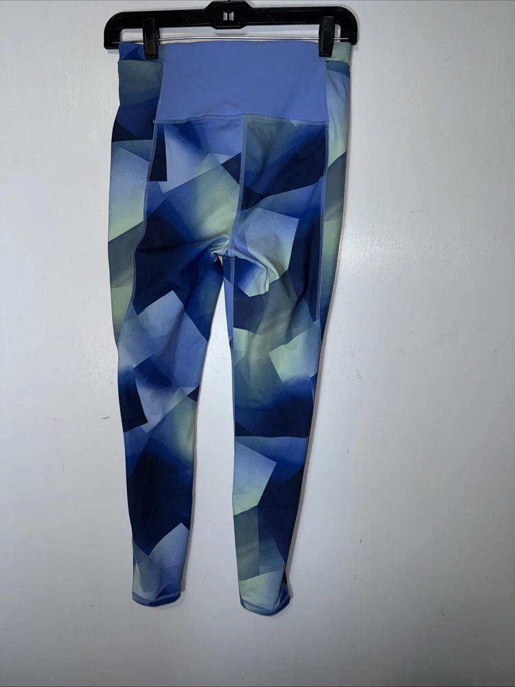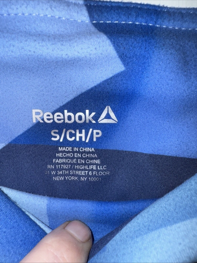 These are Reebok Women's Printed Evolution Mid Rise Leggings in size Small, featuring a blue geometric pattern. Made from a polyester blend fabric, these compression leggings have a 24-inch inseam and a 26-inch waist size. They are designed for activewear purposes such as CrossFit, yoga, and running, and include pockets for convenience. The leggings are part of the Reebok CrossFit product line, suitable for athleisure wear in summer, fall, and spring.