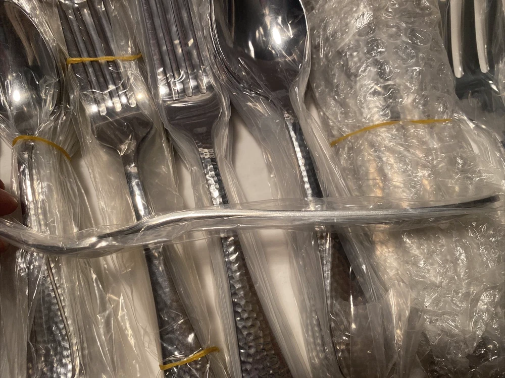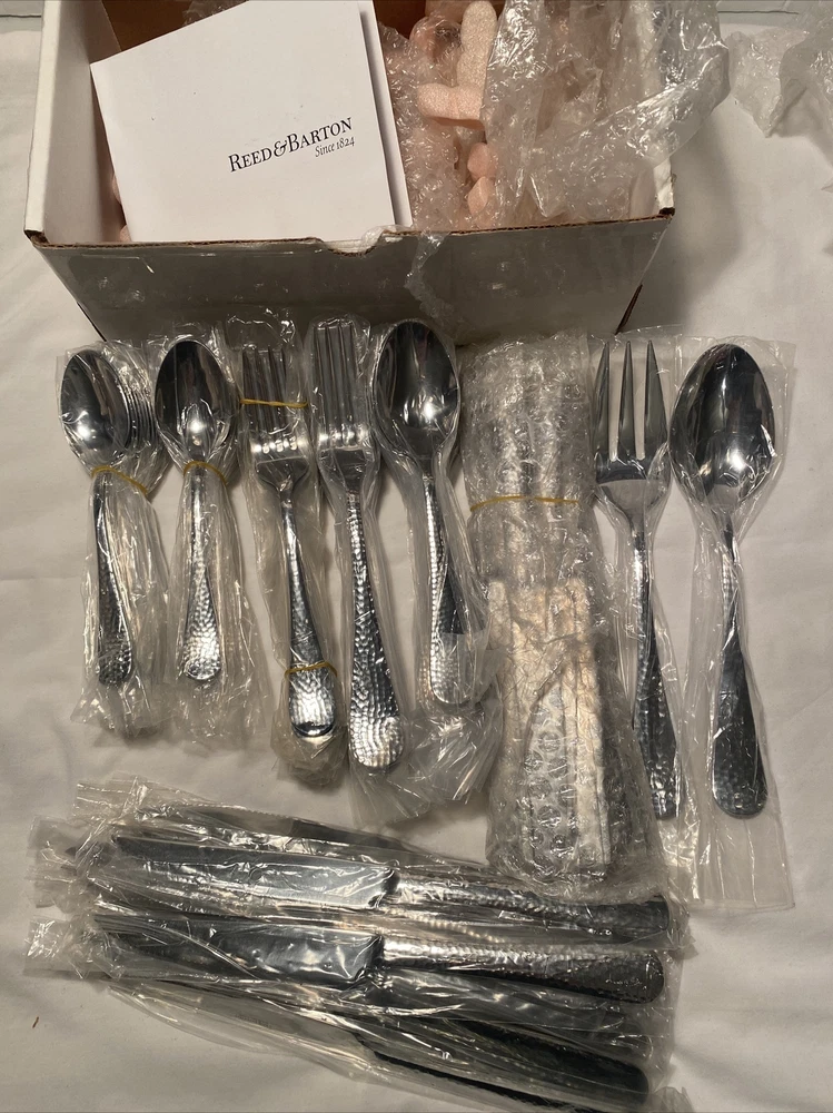 New Old Stock, all wrapped in plastic and unused. Reed & Barton Stainless Steel 86 pc Flatware Set - service for 12 You get: 24 teaspoons 12 place spoons 12 Dinner forks 12 salad/dessert forks 12 dinner knives 12 steak knives 1 serving meat fork 1 serving solid spoon Backs say R&B Every Day Stainless China I think it is 18/0, doesn't say Note I have had several of these sets, box might be white or brown but contents the same.