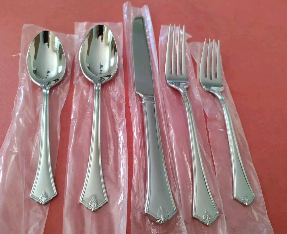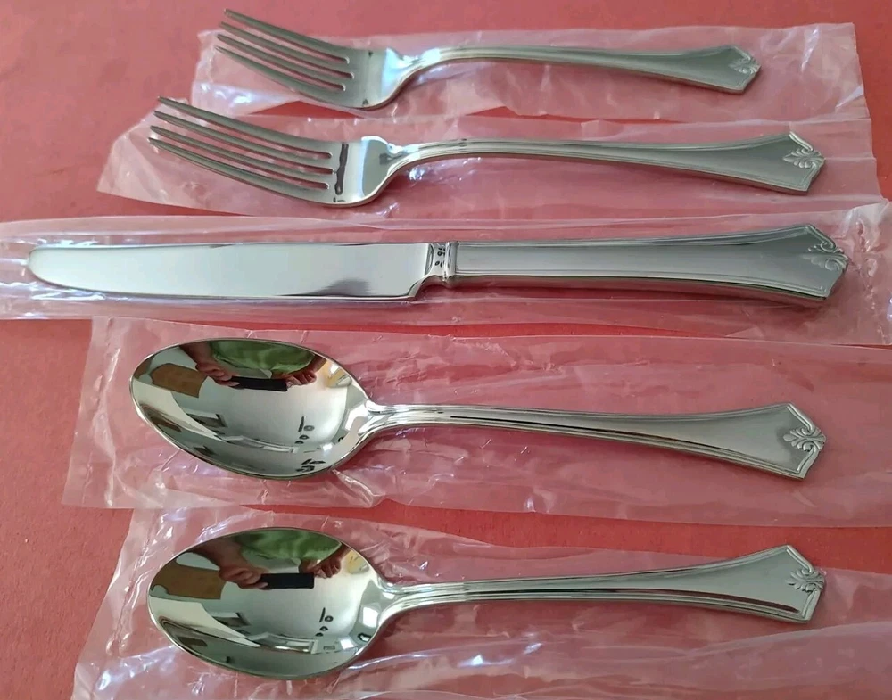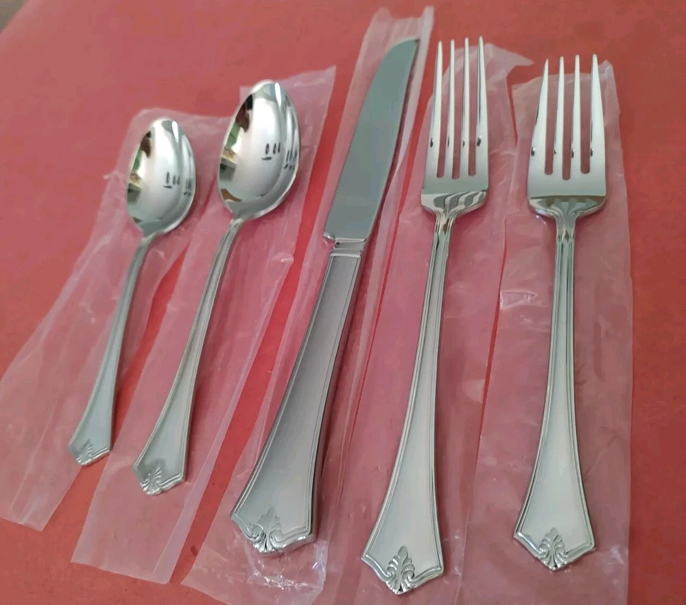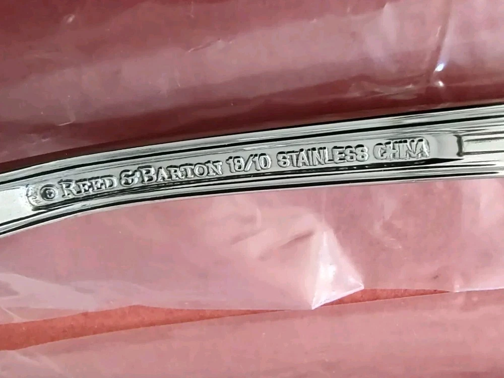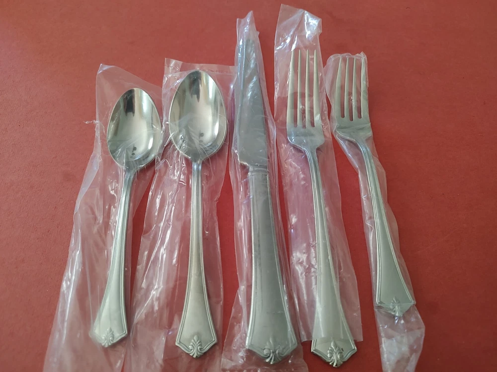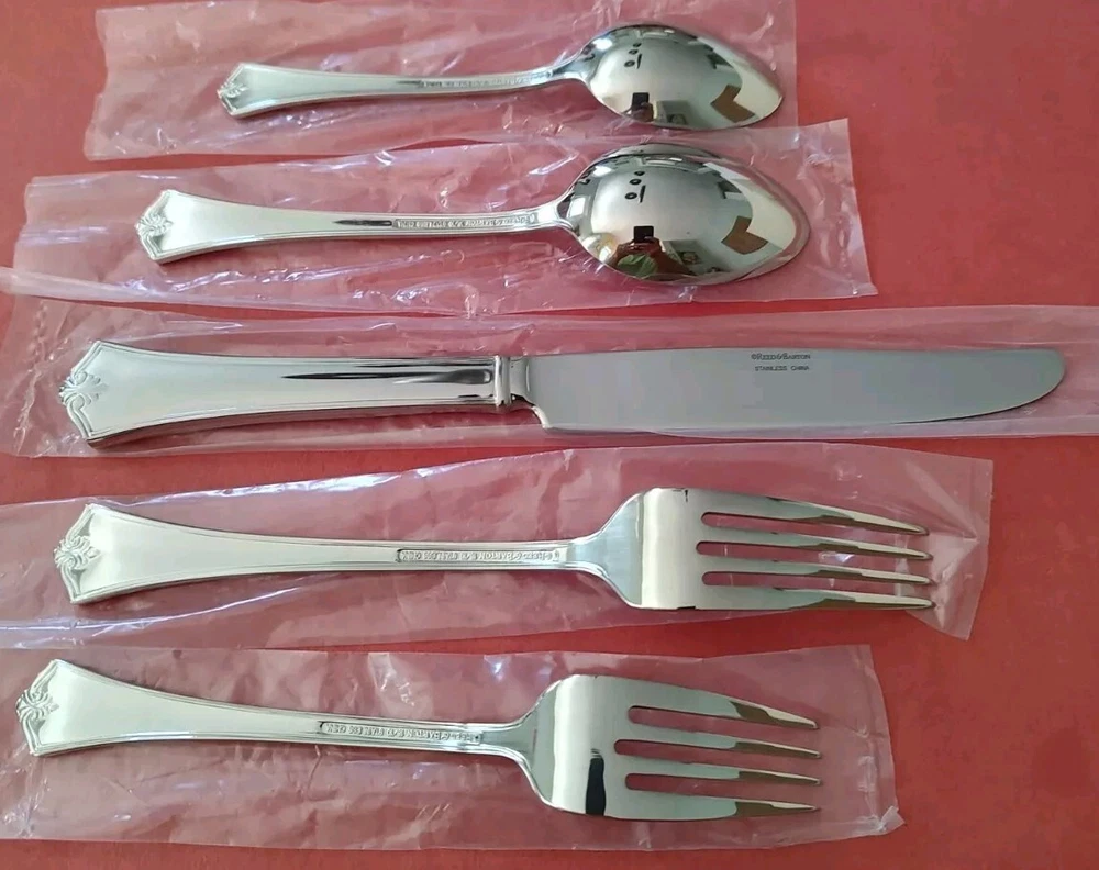 5 Piece Reed & Barton "Churchill" Pattern 18/10 Stainless Steel Place Setting All unused in original plastic sleeves Includes: 1 Dinner Fork (8") 1 Salad Fork (7") 1 Dinner Knife (9 5/8") 1 Teaspoon (6 1/4") 1 Soup Spoon (7") Discontinued Pattern. Was produced from 2004 to 2006 Please see my other listings in this pattern Free Shipping in the USA