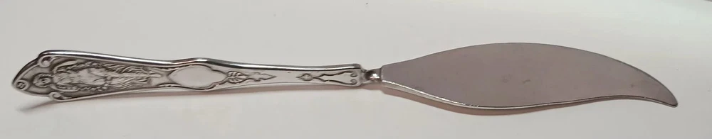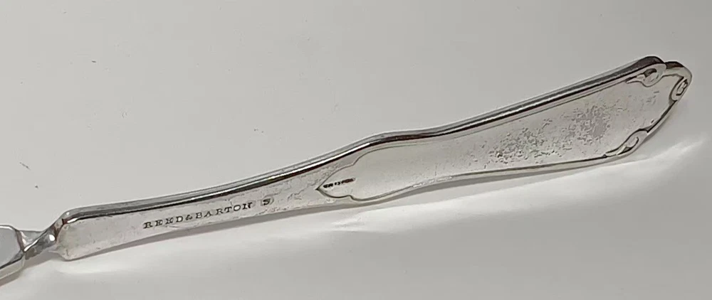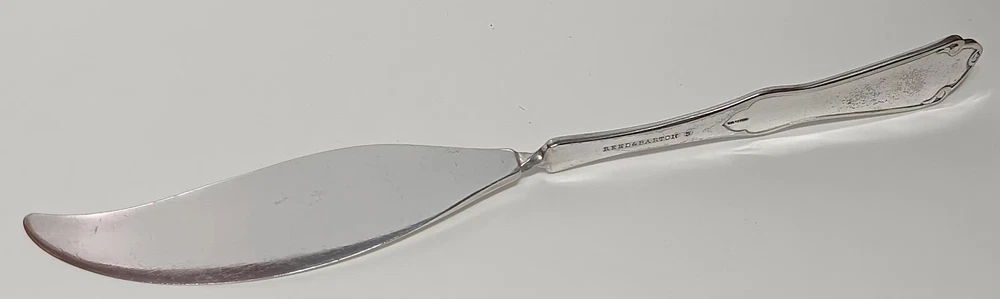 This is an antique Reed & Barton silver plated, 7 7/8" twist handle fish knife. It is in good used condition with light exposure or brassing of the back of the handle where it rested on the table. There is also the expected polishing wear, scuffs and scratches on a used piece that is likely over a century old. It has never been monogrammed. Please examine the photos for further details about design and condition.