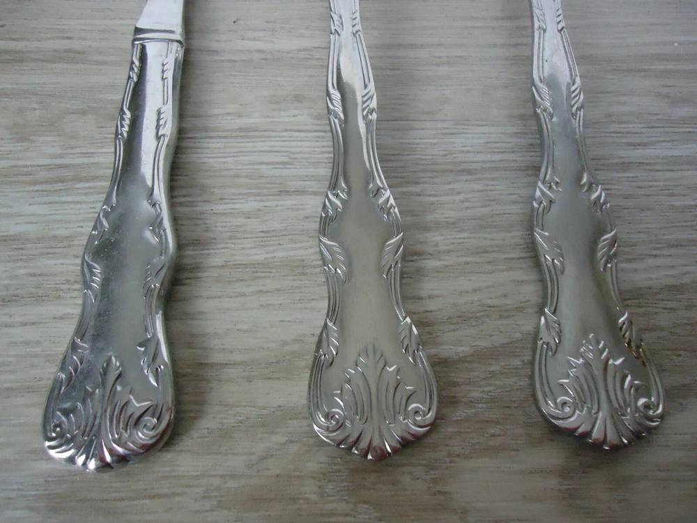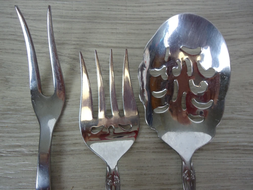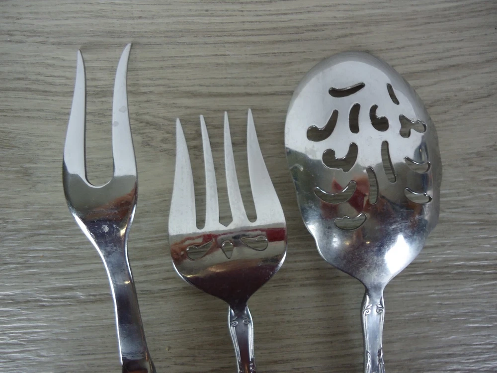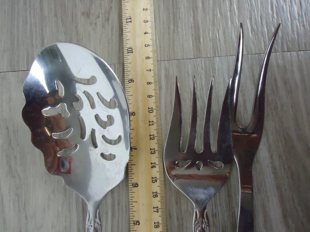 Material:Stainless SteelSeller Notes:“These are preowned used and have scuffs watermarks and other such signs of wear and use.”Handle Material:Stainless SteelType:3 pc Serving Fork and SpoonsCountry/Region of Manufacture:ChinaStyle:Victoria patternBrand:VictoriaSet Includes:3 pc serving utensils