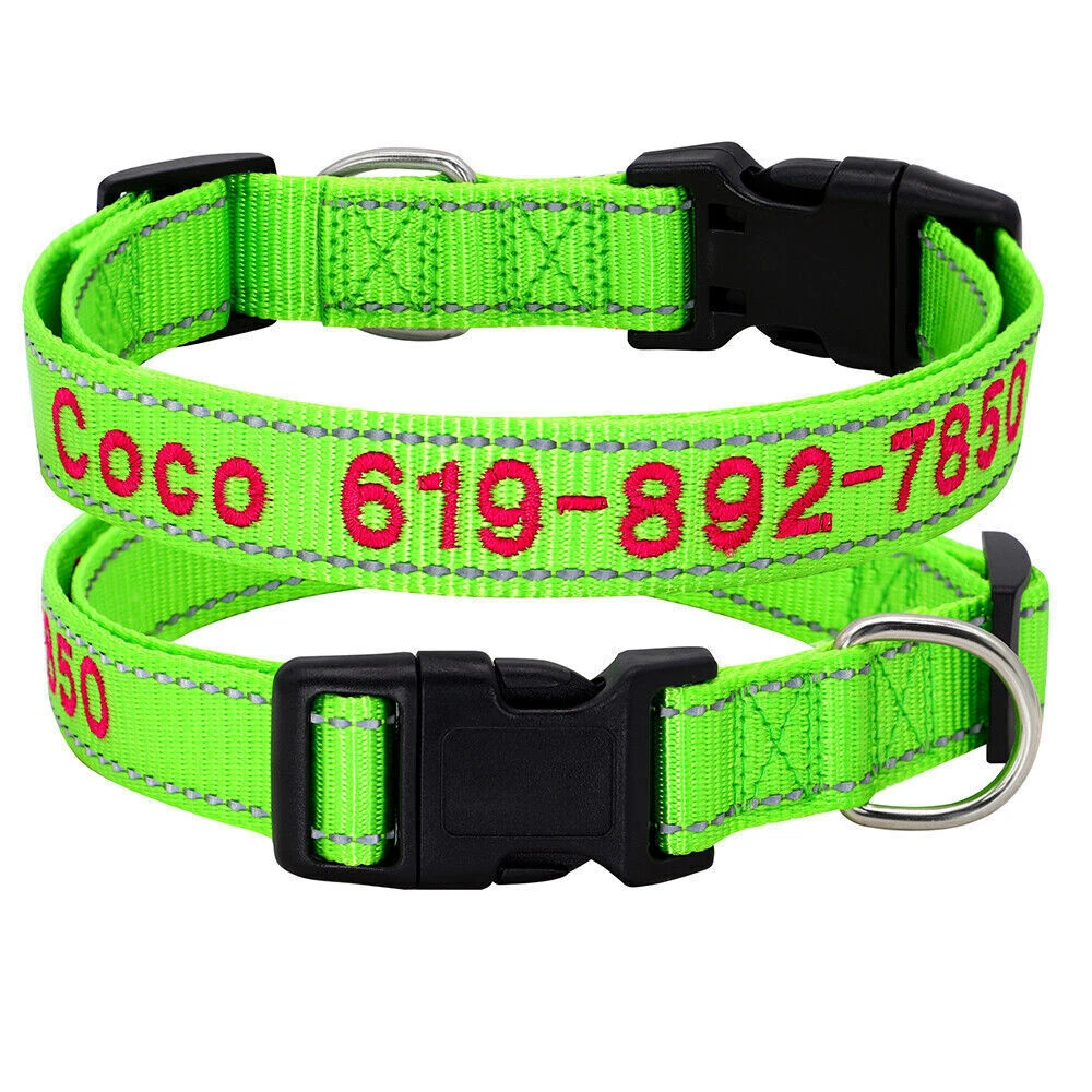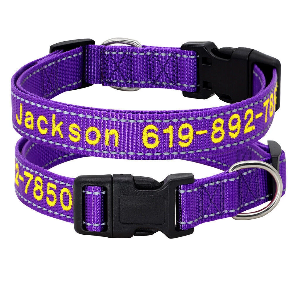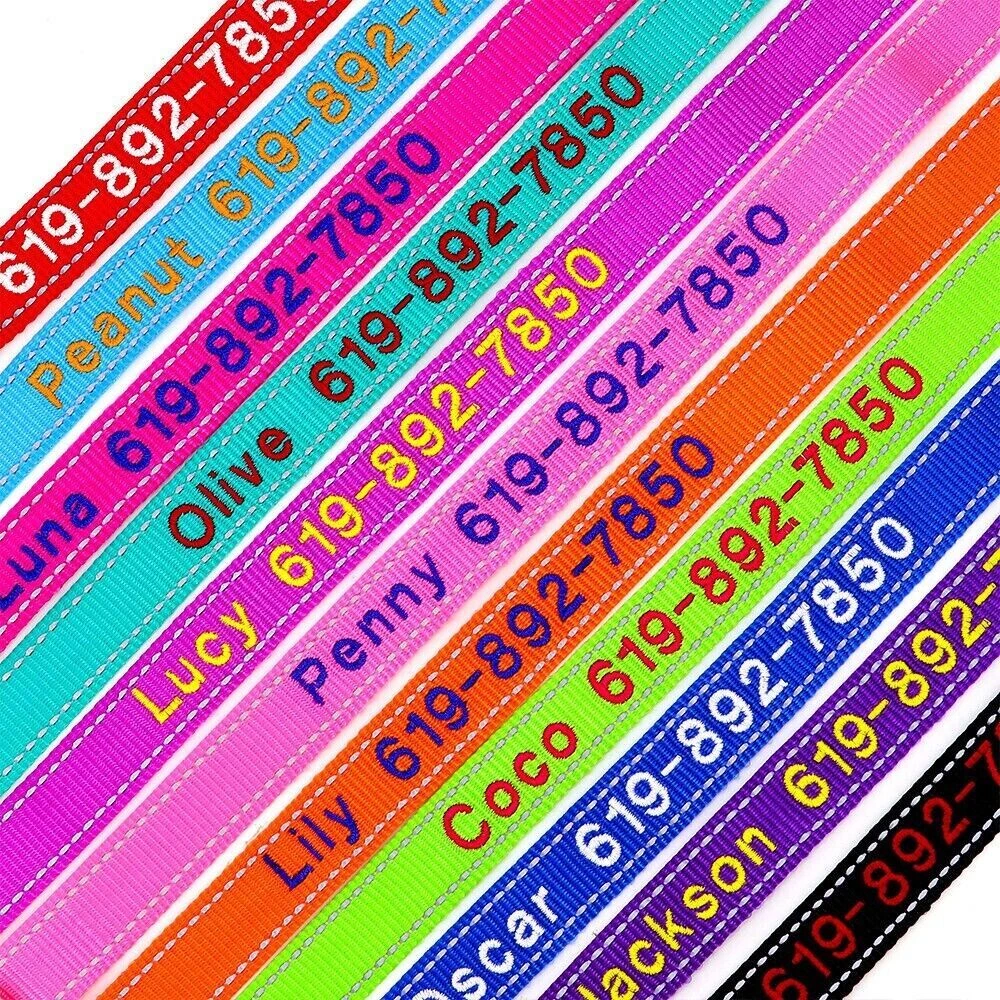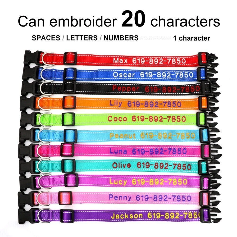 If you need to purchase multiple, You first choose a color to fill in the text you need, then add it to the shopping cart, and the other one will do the same. Finally, you can make the payment together. You can get the discount. Embroidered Dog Collar Type: ReflectiveEmbroidered Personalised Custom Name Phone Collar for Small Medium Dogs Material:Nylon 11 Colours:Black/Dark Blue/Blue/Green/Light Green/Dark Purple/Purple/Hot Pink/Pink/Orange/Red Features: Soft Durable nylon material,it's comfortable for your pet to wear. A great way to know that someone can contact you if something happens and your dog gets away from you. Personalized dog collars are made from the strongest and most durable products Reflective design,safety walking at night. The collar features a secure side-release buckle and a non-corrosive D-ring. Embroidered design will make your dog more cool . The stitching can be done in color as picture shows Different colors and sizes,you can choose a right 1 pcs for your pet. Measurement of current collar. This will make it much easier for me to keep from covering the embroidery. Fit for small to large dogs.e.g.Chihuahua/Yorkie/Pug/Bichon Frise/Dachshund/Schnauzer/French Bulldog/Beagle/Pitbull/Labardor/German Shepherd, Golden Retriever,Rottweiler.etc Package Include:1xDog Collar. If you need to purchase multiple, You first choose a color to fill in the text you need, then add it to the shopping cart, and the other one will do the same. Finally, you can make the payment together.You can get the discount. Sample Text:(Please leave us engrave information at check out,we will embroidery it for you ) Abby*012-345-6789 Size Neck Adjustable Width S 10-16"(25-40cm) 5/8"(1.5cm) M 12-19"(30-47cm) 3/4"(2.0cm) L 15-24"(37-60cm) 1.0"(2.5cm) XL 17-28"(42-70cm) 1.0"(2.5cm) Note: Please measure the neck size of your pet before ordering.That's important! Please allow 0.5-1 inch(1-3cm) error due to manual measurement.