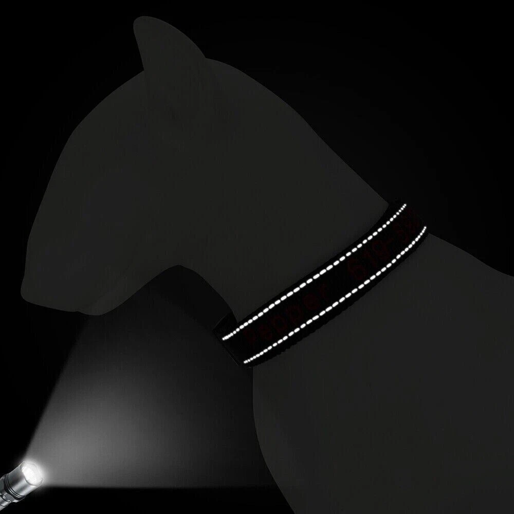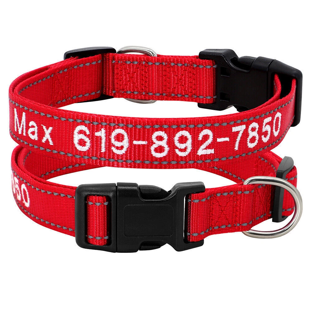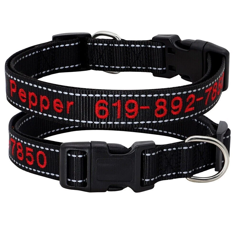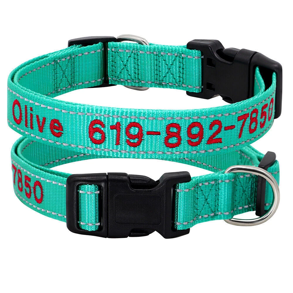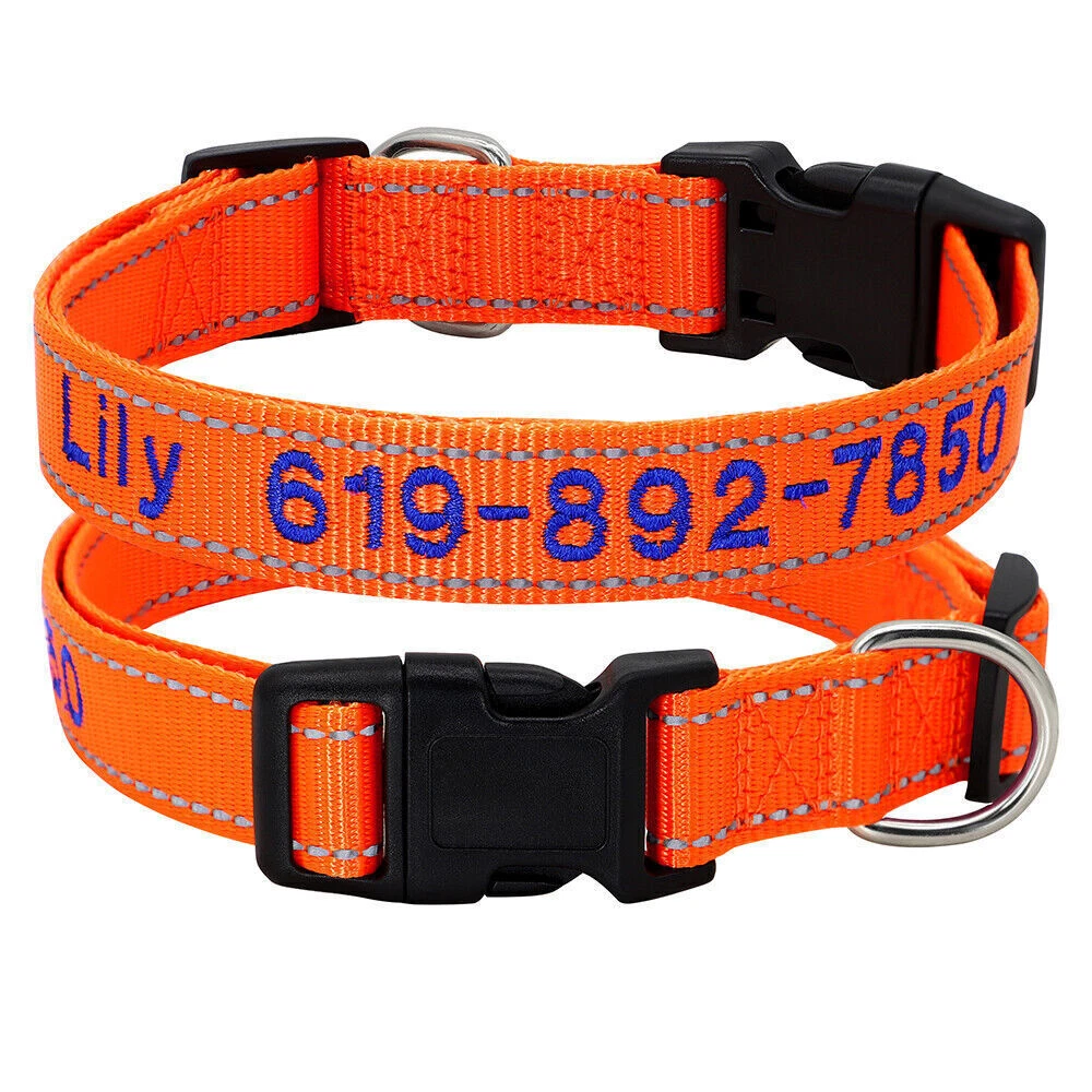 If you need to purchase multiple, You first choose a color to fill in the text you need, then add it to the shopping cart, and the other one will do the same. Finally, you can make the payment together. You can get the discount. Embroidered Dog Collar Type: ReflectiveEmbroidered Personalised Custom Name Phone Collar for Small Medium Dogs Material:Nylon 11 Colours:Black/Dark Blue/Blue/Green/Light Green/Dark Purple/Purple/Hot Pink/Pink/Orange/Red Features: Soft Durable nylon material,it's comfortable for your pet to wear. A great way to know that someone can contact you if something happens and your dog gets away from you. Personalized dog collars are made from the strongest and most durable products Reflective design,safety walking at night. The collar features a secure side-release buckle and a non-corrosive D-ring. Embroidered design will make your dog more cool . The stitching can be done in color as picture shows Different colors and sizes,you can choose a right 1 pcs for your pet. Measurement of current collar. This will make it much easier for me to keep from covering the embroidery. Fit for small to large dogs.e.g.Chihuahua/Yorkie/Pug/Bichon Frise/Dachshund/Schnauzer/French Bulldog/Beagle/Pitbull/Labardor/German Shepherd, Golden Retriever,Rottweiler.etc Package Include:1xDog Collar. If you need to purchase multiple, You first choose a color to fill in the text you need, then add it to the shopping cart, and the other one will do the same. Finally, you can make the payment together.You can get the discount. Sample Text:(Please leave us engrave information at check out,we will embroidery it for you ) Abby*012-345-6789 Size Neck Adjustable Width S 10-16"(25-40cm) 5/8"(1.5cm) M 12-19"(30-47cm) 3/4"(2.0cm) L 15-24"(37-60cm) 1.0"(2.5cm) XL 17-28"(42-70cm) 1.0"(2.5cm) Note: Please measure the neck size of your pet before ordering.That's important! Please allow 0.5-1 inch(1-3cm) error due to manual measurement.