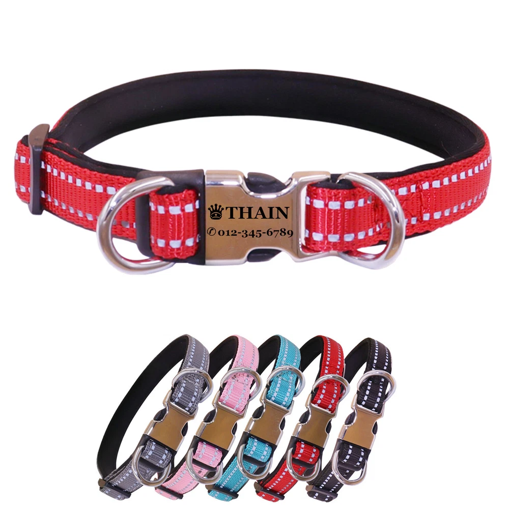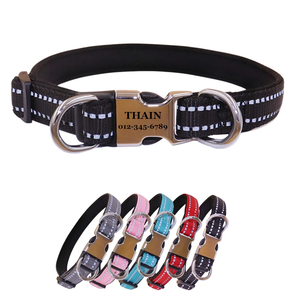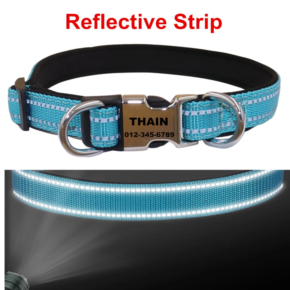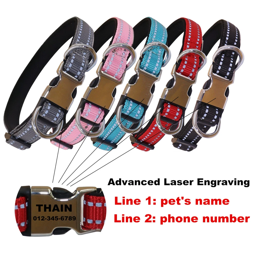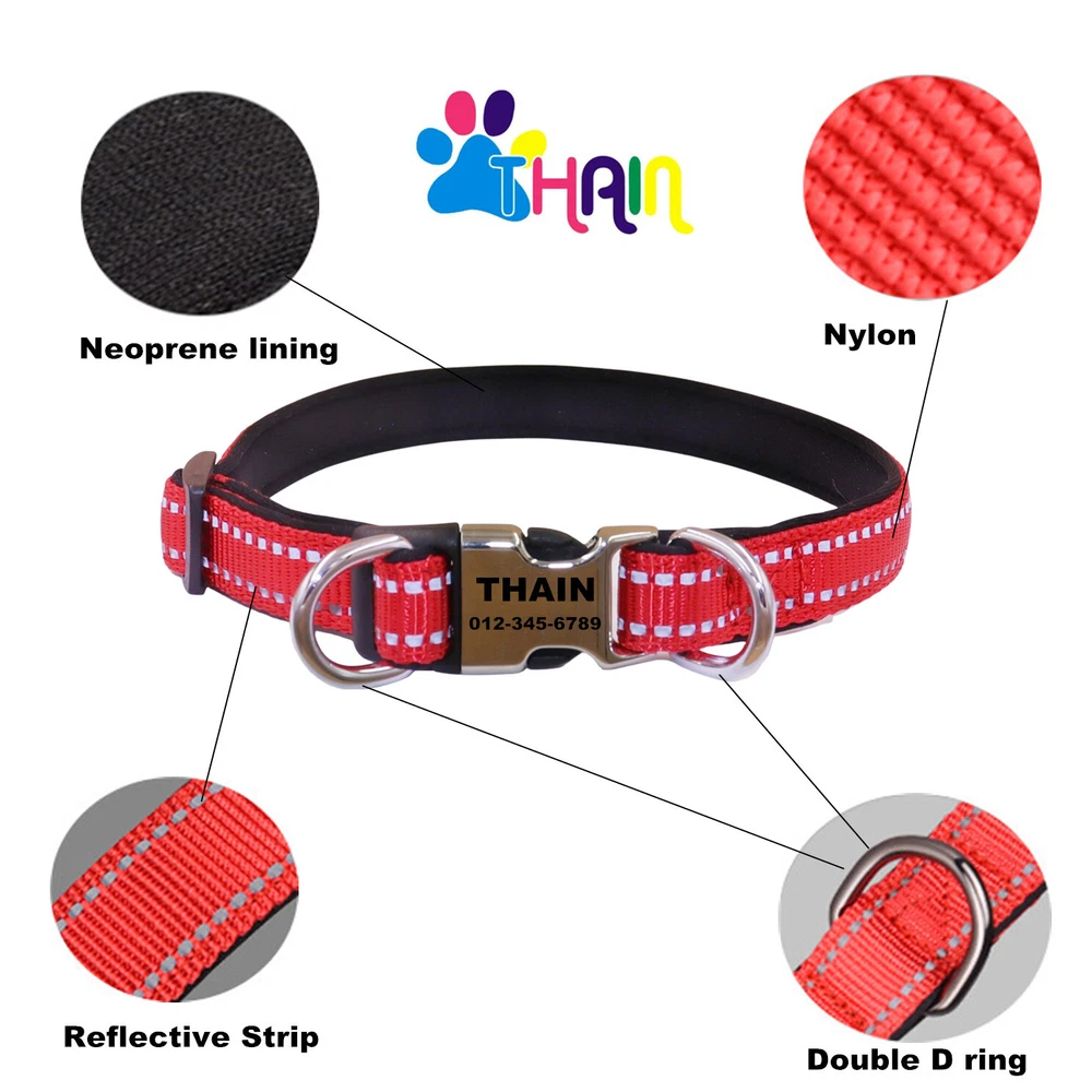 Product Name: THAIN Reflective Personalized Dog Collar Engraved Custom Buckle- Soft Nylon Pet Collar with Name Plate engraved Name, Phone Number, Silent,No Noise Adjustable Material: Nylon+Metal Buckle Size: XS/S / M/L(See the measurement on the size picture) Font used: Arial or Georgia How to Order Please write engraving details in box at the top of listing page. Product Features: ★ 【 Premium Reflective 】 Each collar will utilize 2 special lines of reflective thread. Would be reflective when lights shine on them at night. Walking in the dark would be safe. ★ 【 Durably Nylon and Soft Lining 】 Made of high-quality nylon webbing with soft neoprene lining. Soft lining ensure the comfortable. durable nylon and good sewing ensure the durability. ★ 【 Durable half-Metal Hardware 】 Thick welded double D-ring Double D ring ensures the balance of force on the dog's neck when you walk the dog. Adjustable plastic buckle ensure the collar fit most dogs and puppies. Engraved half-metal clasp appropriately reduces the weight of the collar, ensure it also fits small dogs. Half Metal Buckle where we will engrave the pet's name and phone number or address Laser engraving makes words are clear, keeps pet's information engraved permanent. This dog collar fits for many kinds of dogs, like Poodle, Pugs, Dachshund, Terrier, Beagle, Pitbull, Labrador, Bulldog and so on. Note: For engraved words,please send us a message as below: Line 1: pet's name ( you can add one symbol ★ ♂ ✿ ❤ ♛ ) Line 2: phone number (you can add one symbol ☎ ✆ ) Smaple: Line 1: ❤ Bella Line 2: ☎ 012-345-6789 How to choose the right size? Measurement Tips: Please use a soft ruler around your Cat's neck, to measure the surrounding of it. Please don't make it too tight. Better leave a space that can put 2 fingers. So your puppy may feel more comfortable. Size Width Neck Adjustable Weight XS 0.6"(1.5cm) 7-11"(18-28cm) 38g S 0.6"(1.5cm) 10-15"(25-38cm) 42g M 0.8"(2.0cm) 14-19"(36-48cm) 65g L 1.0"(2.5cm) 18-23"(45-58cm) 110g Package include: 1 pcs pet collar Shipping: 1.Items will be sent out in 24-48 hours on payment received from Monday to Saturday. Orders during weekends and holidays will be posted in the following working day. 2.it usually will take 15-20 business days to arrive by SPEEDPAK. 3.Please make sure your shipping address and the order information is correct before placing an order. We will not be responsible for item loss due to wrong or unknown address. 4.International buyers are responsible for duties and customs fees. Return Policy & Warranty: 1. In our store, you will enjoy 30 days return/refund guarantee (Excluding misuse of the item and damaged item). 2. If the item you received is faulty, damaged or incorrect, or any further problems, you can return it for replacement or refund, please contact our customer service on eBay within 30 days from item received. 3.For damaged items on arrival, please contact us immediately, sending us an email with a photo is preferred. We will offer solutions to such cases. Full refund or replacement will be guaranteed. Contact us: Customer satisfaction is very important to us, our goal is to earn 5 star positive feedback on every sale! We would appreciate the chance to correct any problems before posting anything other than 5 stars positive feedback. So if for ANY reason you are not happy, please contact us directly through “My Massage” or "Ask Seller Q". We will get back to you as soon as we are available. We are always stand-by to help for any questions or concerns.