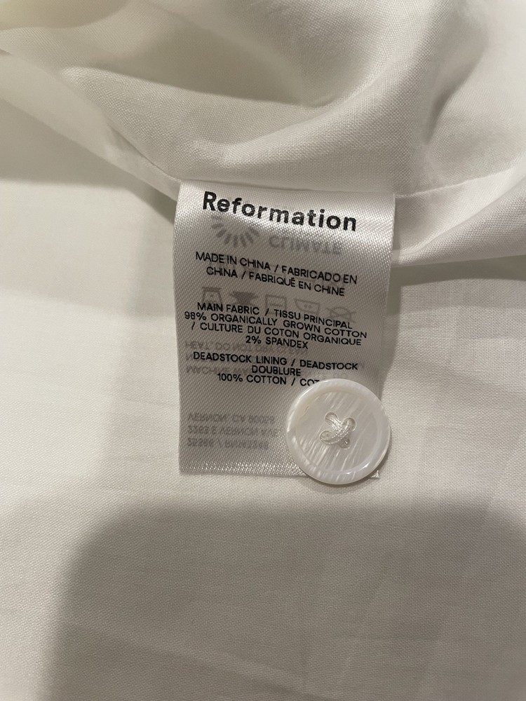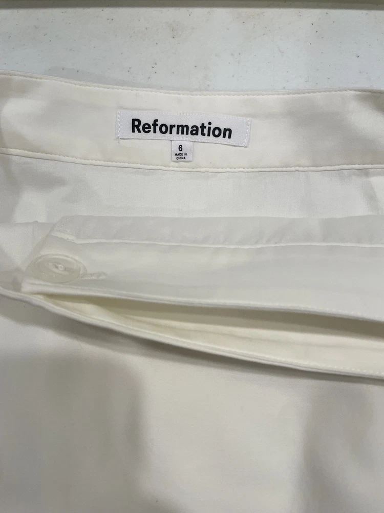 Country of Origin: China Pattern: Solid Type: Skirt Personalize: No Occasion: Party/Cocktail, Travel, Casual, Formal, Workwear, Business Closure: Button Material: Cotton, Spandex Department: Women Size: 6 Rise: High Color: White Brand: Reformation Theme: Classic Season: Fall, Spring Style: Wrap Size Type: Regular Skirt Length: Midi