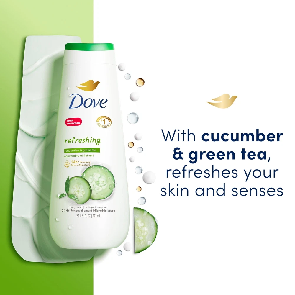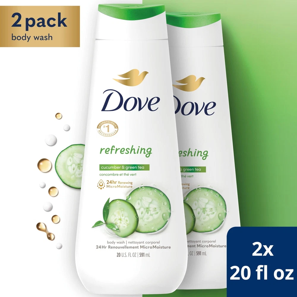 Dove Refreshing Long Lasting Gentle Body Wash Twin Pack, Cucumber and Green Tea, 20 fl oz, Looking for a skin cleanser that helps energize your senses and soften skin? The #1 dermatologist-recommended body wash, Dove Refreshing Body Wash revitalizes your skin and senses with cucumber and green tea extracts while moisturizing your skin. This body wash is sulfate and paraben-free with a mild, pH-balanced formula, making it a great body wash for dry skin, unlike typical bath soap or shower gel. This body wash uses Dove Moisture Renew Blend, a combination of skin-natural nourishers and plant-based moisturizers. The lipids and glycerin in our formula absorb deeply into the top layers of skin, where they get right to work! This proprietary blend of moisturizing ingredients is proven to work with your skin to nourish it, so it can maintain and create new moisture. For best results, squeeze the refreshing cucumber and green tea body wash into your hand or onto a shower pouf and work it into a rich lather. Massage it over your skin, taking time to allow the cooling green tea and cucumber to wake your senses. Rinse off, revealing revived and refreshed skin. Dove Refreshing Long Lasting Gentle Body Wash Twin Pack, Cucumber and Green Tea, 20 fl oz 24HR RENEWING MICRO-MOISTURE: Dove Refreshing Cucumber and Green Tea Body Wash refreshes and hydrates dry skin, leaving it renewed and healthy-looking for 24 hours FOR SOFT, SMOOTH SKIN: Our deeply nourishing body wash, formulated with millions of Micro-Moisture droplets, leaves skin soft as silk WITH CUCUMBER AND GREEN TEA: This gentle skin cleanser, infused with green tea and cucumber, deeply nourishes your skin and makes you feel refreshed HOW TO USE: Squeeze a generous amount of Dove Cucumber and Green Tea Body Wash into your palms. Massage the hydrating body wash onto your skin, enjoy the rich lather before rinsing off NUMBER 1 DERMATOLOGIST-RECOMMENDED BODY WASH BRAND: From the number 1 dermatologist-recommended body wash brand, this body wash, made with plant-based moisturizers, gently cleanses your skin and nourishes its microbiome Ingredients Water (Aqua), Sodium Chloride, Cocamidopropyl Betaine, Sodium Lauroyl Glycinate, Sodium Lauroyl Isethionate, Acrylates Copolymer, Lauric Acid, Glycerin, Fragrance (Parfum), Stearic Acid, Palmitic Acid, Cucumis Sativus (Cucumber) Juice, Camellia Sinensis Leaf Extract, Phenoxyethanol, Glycol Distearate, Bht, Tetrasodium Edta, Peg-150 Pentaerythrityl Tetrastearate, Ppg-2 Hydroxyethyl Cocamide, Iodopropynyl Butylcarbamate, Citric Acid, Linalool, Limonene, Hexyl Cinnamal, Hexyl Cinnamal, Alpha-Isomethyl Ionone, Yellow 5 (Ci 19140), Blue 1 (Ci 42090)/div>