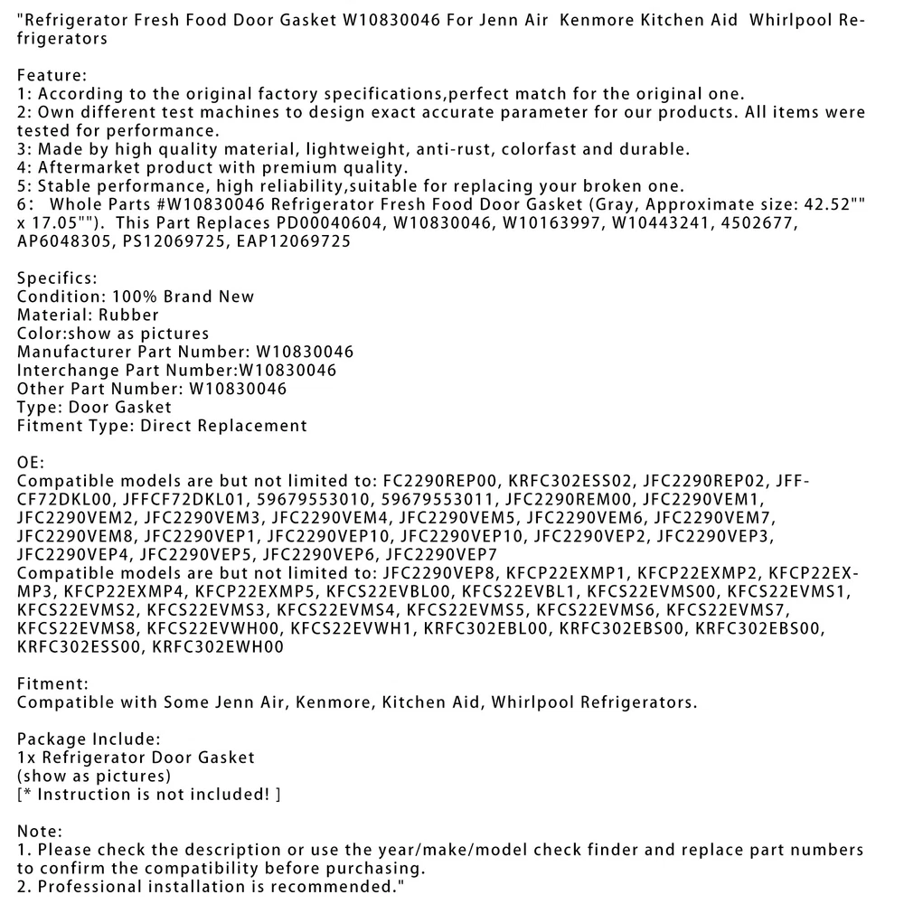Rainbow Effect 260W 10R Sharpy Moving Head Beam Light 3In1 DJ Stage Lighting 349.99 USD Free shipping 1Pcs 1Meter Power Cable For 350W/330W/280W/230W/200W Moving Head Light US Plug 12.87 USD Free shipping Fridge Defrost Thermostat for Kenmore, AP7116304, PS12199075, 60148-0007500 14.24 USD 14.99 USD Free shipping 5% off 250W MSD 8R Lamp Sharpy Beam Moving Head Replacement Bulb Stage Show Lighting 33.79 USD Free shipping Brushless Motor Pinion And Mount Set For Wltoys 144002 144010 124016 124017 9.99 USD Free shipping Sunbuck 2000W Stereo HiFi Power Amplifier Bluetooth 5.0 Karaoke FM USB EQ AUX 69.99 USD Free shipping 3.5mm Stereo Socket Jack Female Connector Panel Mount Solder For Headphone 12.87 USD Free shipping 1/2 inch Thread Float Ball Valve Floating Ballcock Stainless Steel Fittings 17.79 USD Free shipping Printhead fit for 10 Series ESP 3 5 7 9 5100 5300 3250 5210 5250 6150 9250 RL 23.79 USD Free shipping Charger USB Charging Data Cable for Garmin Watch Approach G10/S20/Vivomove HR 11.05 USD Free shipping NEW Carrying Handle Picatinny Rail Mount Iron Sights Removable Adjustable 22.79 USD Free shipping Archery 45/37 Degree Bow Peep Sight Hooked Housing 3 Inner Core Aperture Kit US 15.79 USD Free shipping A Fantastic Shop Send us a message Our Store Seller Profile Feedbacks Save this seller Contact Refrigerator Fresh Food Door Gasket W10830046 For Jenn Air Kenmore Kitchen Refrigerator Fresh Food Door Gasket W10830046 For Jenn Air Kenmore Kitchen Aid Whirlpool Refrigerators Feature: 1: According to the original factory specifications,perfect match for the original one. 2: Own different test machines to design exact accurate parameter for our products.All items were tested for performance. 3: Made by high quality material, lightweight, anti-rust, colorfast and durable. 4: Aftermarket product with premium quality. 5: Stable performance, high reliability,suitable for replacing your broken one. 6: Whole Parts #W10830046 Refrigerator Fresh Food Door Gasket (Gray, Approximate size: 42.52" x 17.05"). This Part Replaces PD00040604, W10830046, W10163997, W10443241, 4502677, AP6048305, PS12069725, EAP12069725 Specifics: Condition: 100% Brand New Material: Rubber Color:show as pictures Manufacturer Part Number: W10830046 Interchange Part Number:W10830046 Other Part Number: W10830046 Type: Door Gasket Fitment Type: Direct Replacement OE: Compatible models are but not limited to: FC2290REP00, KRFC302ESS02, JFC2290REP02, JFFCF72DKL00, JFFCF72DKL01, 59679553010, 59679553011, JFC2290REM00, JFC2290VEM1, JFC2290VEM2, JFC2290VEM3, JFC2290VEM4, JFC2290VEM5, JFC2290VEM6, JFC2290VEM7, JFC2290VEM8, JFC2290VEP1, JFC2290VEP10, JFC2290VEP10, JFC2290VEP2, JFC2290VEP3, JFC2290VEP4, JFC2290VEP5, JFC2290VEP6, JFC2290VEP7 Compatible models are but not limited to: JFC2290VEP8, KFCP22EXMP1, KFCP22EXMP2, KFCP22EXMP3, KFCP22EXMP4, KFCP22EXMP5, KFCS22EVBL00, KFCS22EVBL1, KFCS22EVMS00, KFCS22EVMS1, KFCS22EVMS2, KFCS22EVMS3, KFCS22EVMS4, KFCS22EVMS5, KFCS22EVMS6, KFCS22EVMS7, KFCS22EVMS8, KFCS22EVWH00, KFCS22EVWH1, KRFC302EBL00, KRFC302EBS00, KRFC302EBS00, KRFC302ESS00, KRFC302EWH00 Fitment: Compatible with Some Jenn Air, Kenmore, Kitchen Aid, Whirlpool Refrigerators. Package Include: 1x Refrigerator Door Gasket (show as pictures) [* Instruction is not included!] Note: 1.Please check the description or use the year/make/model check finder and replace part numbers to confirm the compatibility before purchasing. 2.Professional installation is recommended. About US About Our Items We strive to describe all items accurately and thoroughly, with the utmost care and attention to detail. However, to ensure a mutually satisfactory transaction, we kindly ask for your assistance in thoroughly reviewing the item description and photos, and addressing any questions before placing a bid. Customer Satisfaction We stand behind our commitment with exceptional service, a 100% money-back guarantee, and a dedication to customer satisfaction. I am readily available to address any inquiries or concerns you may have, both before and after your purchase. Our aim is to ensure your shopping experience is enjoyable and that you're delighted with your purchase. Feedback Your feedback is crucial to our business's success. If you're satisfied with your purchase and the service you received, we would greatly appreciate your positive feedback, along with an overall Detailed Selling Rating (DSR) of 5. Please take a moment to leave us positive feedback. Our eBay account is set up to automatically reciprocate positive feedback once yours is received. If you're considering leaving neutral/negative feedback or opening an eBay/PayPal case, we encourage you to reach out to us immediately. We're committed to resolving any issues to the best of our ability. Shipping Parcel will be shipped using Standard shipping method. For security purposes, items will be shipped exclusively to the confirmed address on Paypal. Please ensure your Shipping address is up to date before proceeding with payment. Estimated delivery time within the United States ranges from 3 to 10 business days, depending on your location. Returns We accept returns within 60 days from the date the buyer receives the item. If the item is found to be defective upon receipt, the customer has up to 30 days from the date of receipt to request an exchange for a new item or a refund. For returns due to a change of mind, we accept items in their original selling condition. However, if the package has been opened due to a mistaken order, it does not qualify for our return policy. Please note that the buyer is responsible for covering the cost of return postage. If you encounter any issues, please reach out to us via eBay message, and we'll respond within 24 hours. Fridge Defrost Thermostat for Kenmore, AP7116304, PS12199075, 60148-0007500 14.24 USD 14.99 USD Free shipping 5% off DC12V 0.3A Refrigerator Freezer Rotary Motor Fan Assy For Samsung 3612JL-04W-S49 20.87 USD Free shipping 5304507199 Freezer Door G
