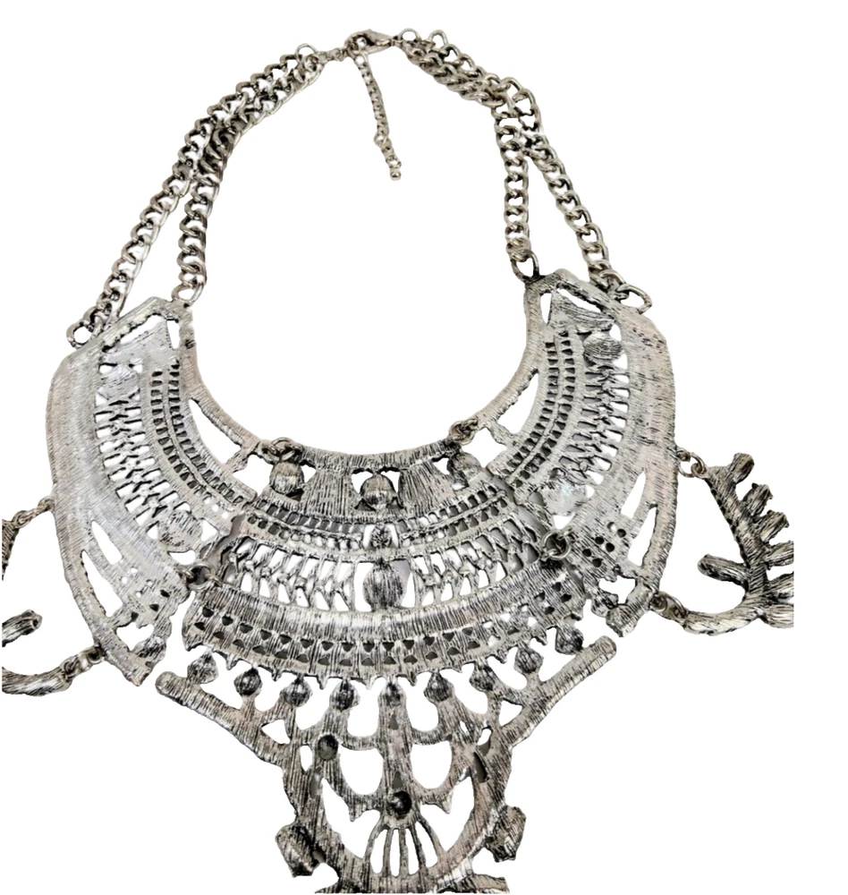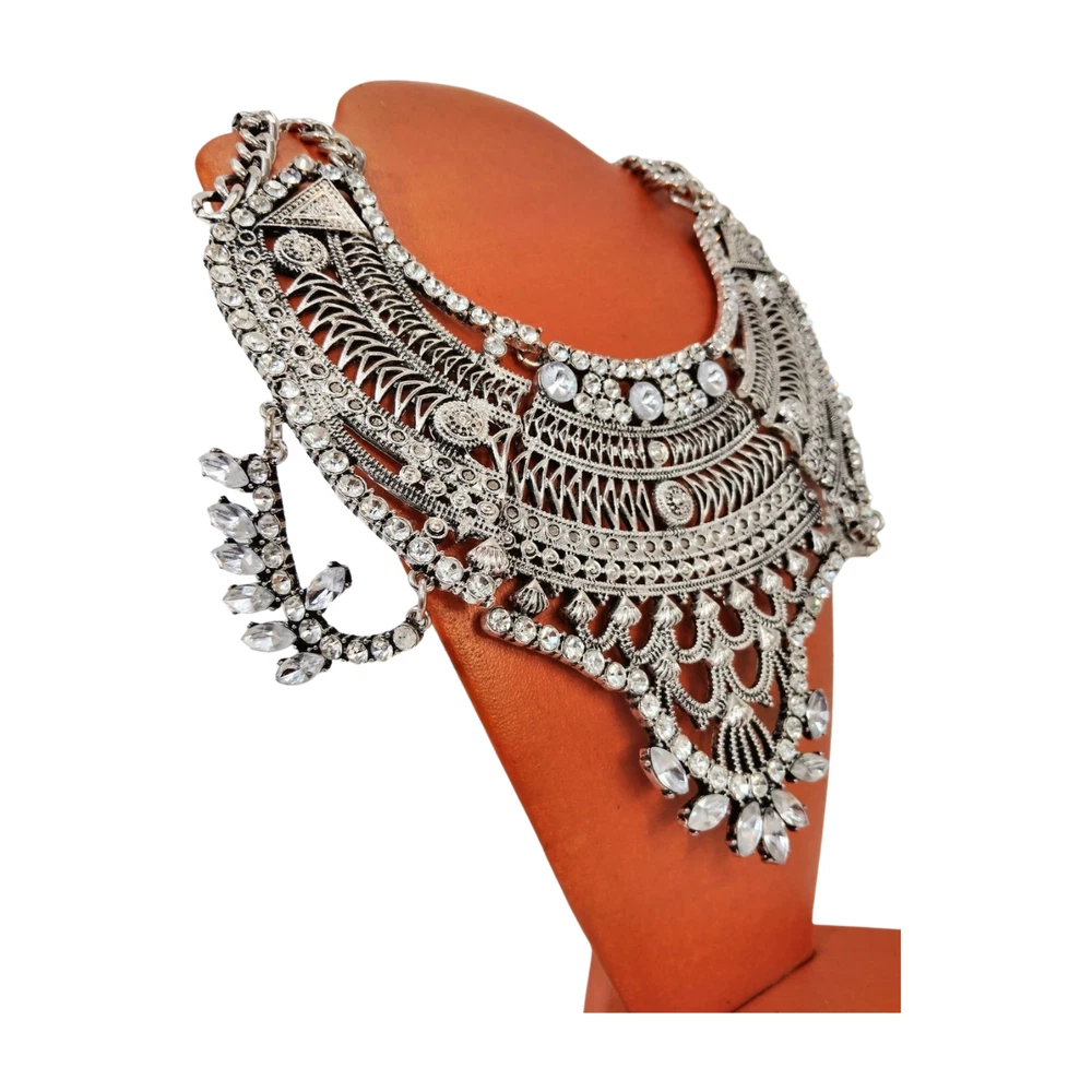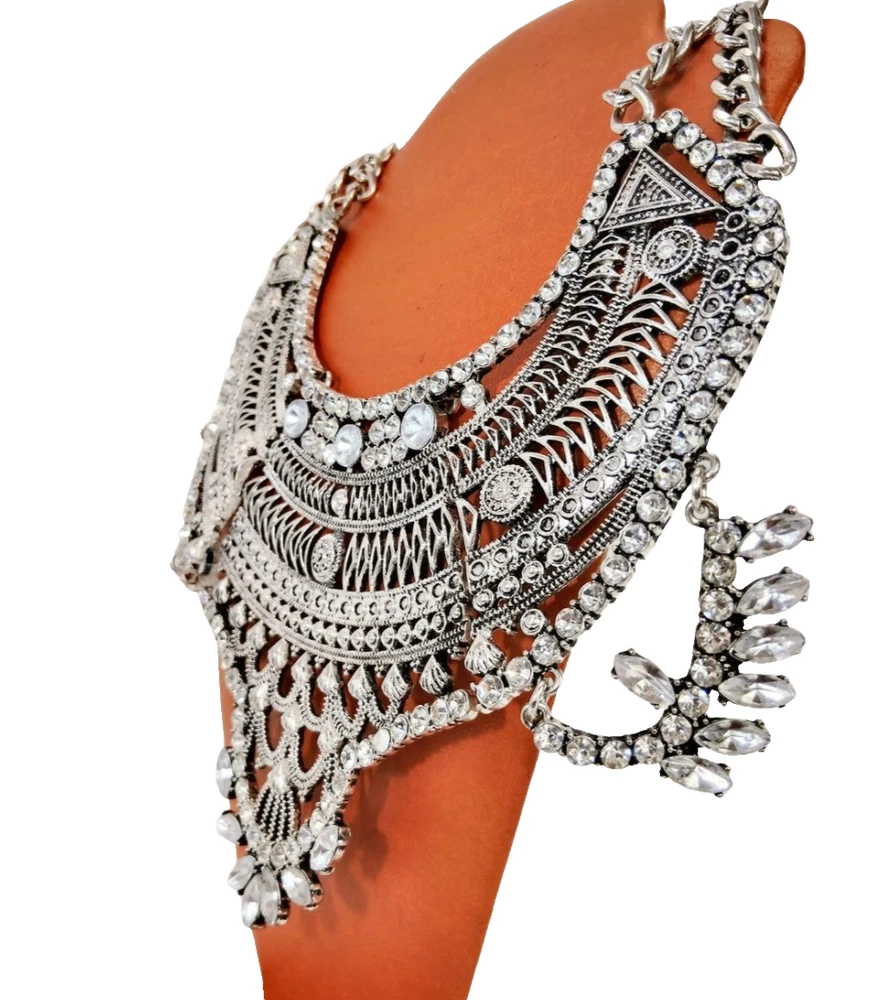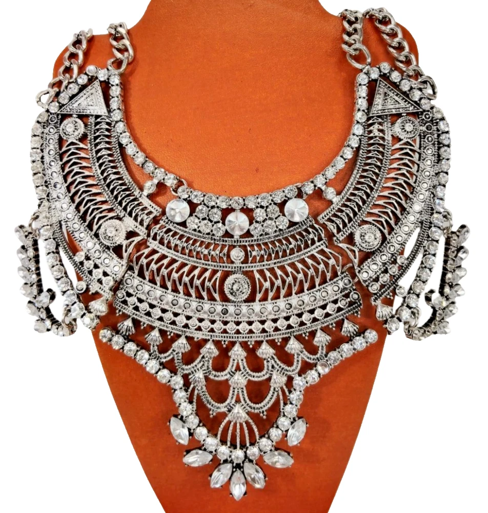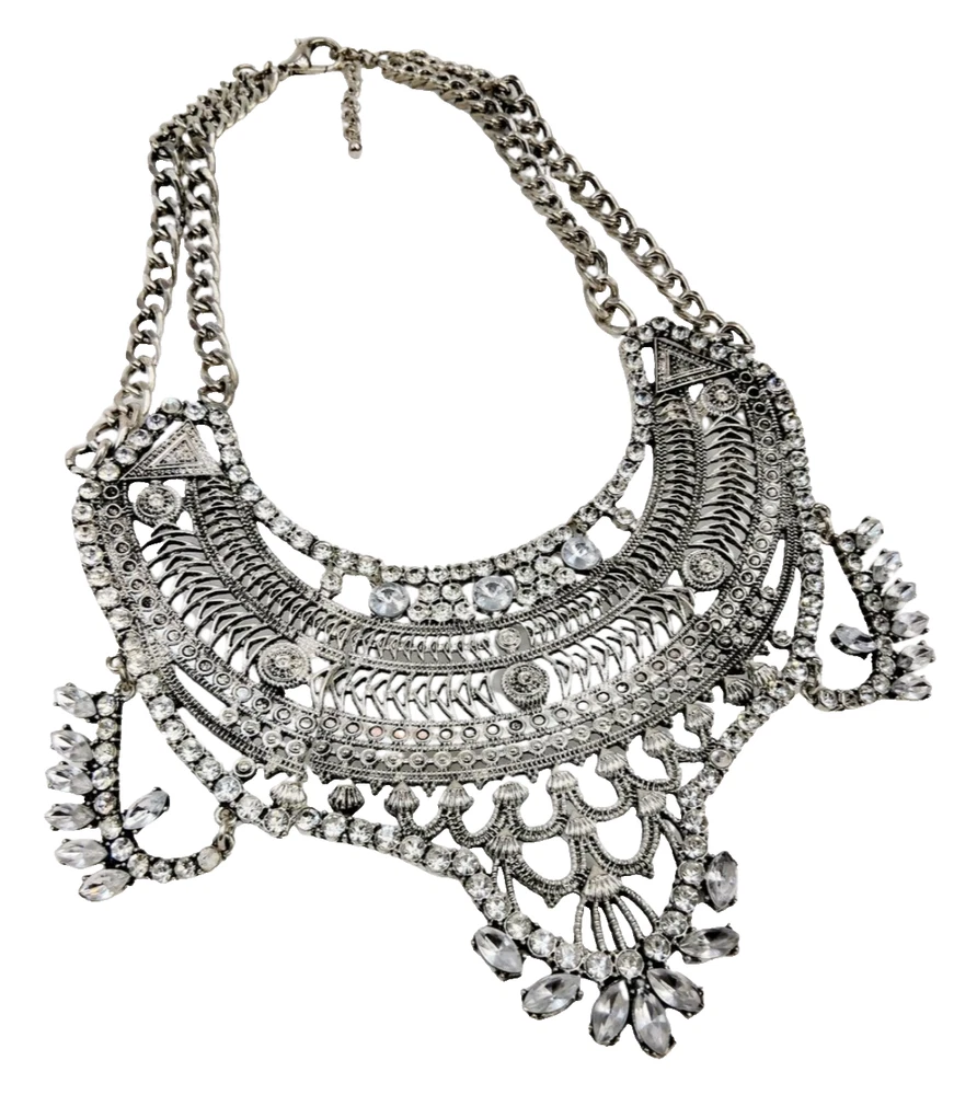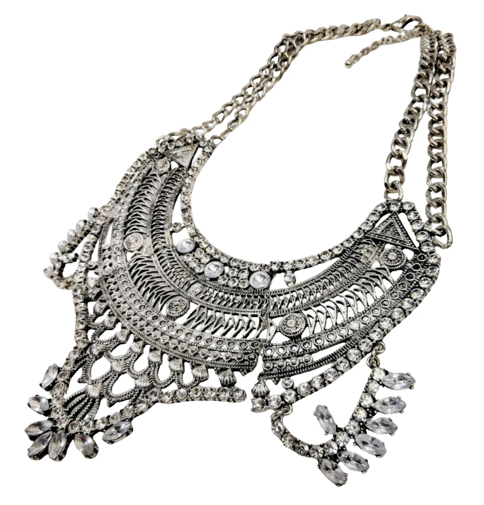Regal Bohemian 17.5" Ornate Silver Tone Crystal Bib Statement Necklace w/ 4" Extender JN1472 Fierce yet refined, this silver rhinestone collar is a wardrobe essential. Make a statement that’s equal parts edgy and elegant. Every piece of jewelry you wear has a story to tell—make yours unforgettable. Treasure Vault’s vintage and statement collections let you channel power, grace, and edge, no matter the occasion. Perfect for the woman who isn’t afraid to shine, our pieces are curated to elevate your style, day or night. Ready to write the next chapter? Bundle & Save: One treasure is never enough. Add a little more to your story and save while building your perfect collection. #SilverToneJewelry, #StatementNecklace, #ElegantBoldLooks, #NecklaceGoals2024, #ChunkyJewelry