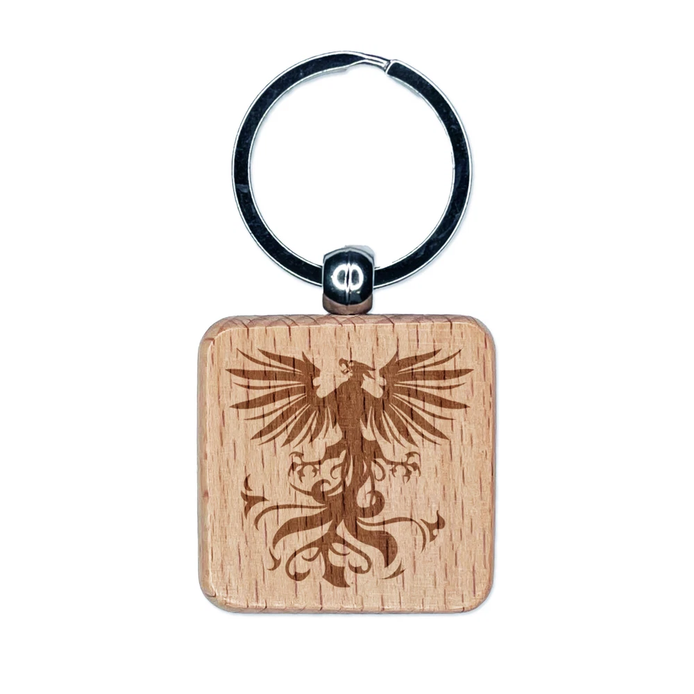 Regal Heraldic Phoenix Engraved Wood Square Keychain Tag Charm